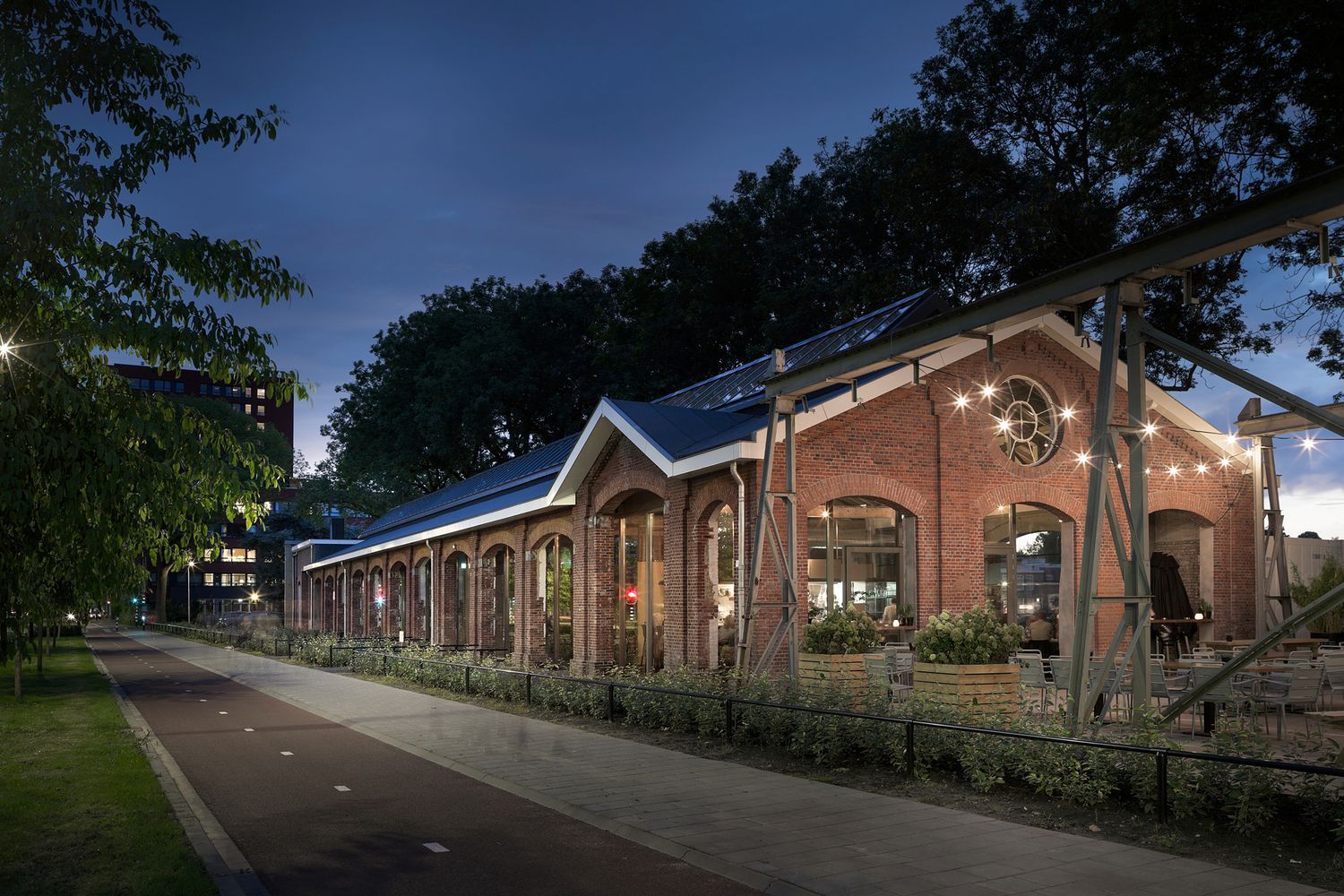 Houtloods to najstarszy zachowany budynek w Spoorzone – dawnej strefie należącej do holenderskich kolei, zlokalizowanej w mieście Tilburg. Obiekt pierwotnie pełnił funkcję składu drewna, a jego charakterystyczna, częściowo otwarta konstrukcja umożliwiała naturalne suszenie materiałów. Z czasem łukowe przestrzenie wypełniono cegłą, a zamkniętą część przekształcono w warsztat. Podczas kompleksowej renowacji Bedaux de Brouwer Architects przywrócili pierwotny charakter budynku, ponownie otwierając wybrane łuki i wpuszczając do wnętrza naturalne światło dzienne. Nowa, przeszklona elewacja subtelnie podkreśla rytm konstrukcji, łącząc architekturę industrialną z nowoczesnym językiem projektowym, bliskim idei, jaką reprezentuje nowoczesna stodoła.