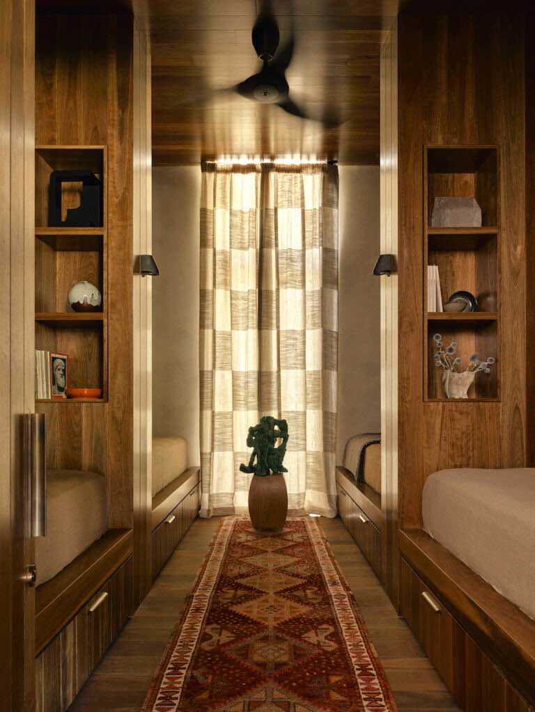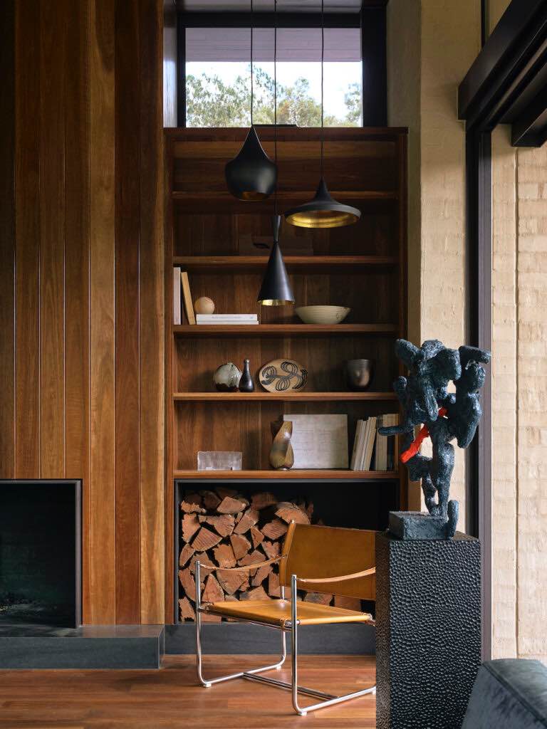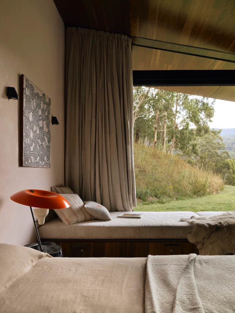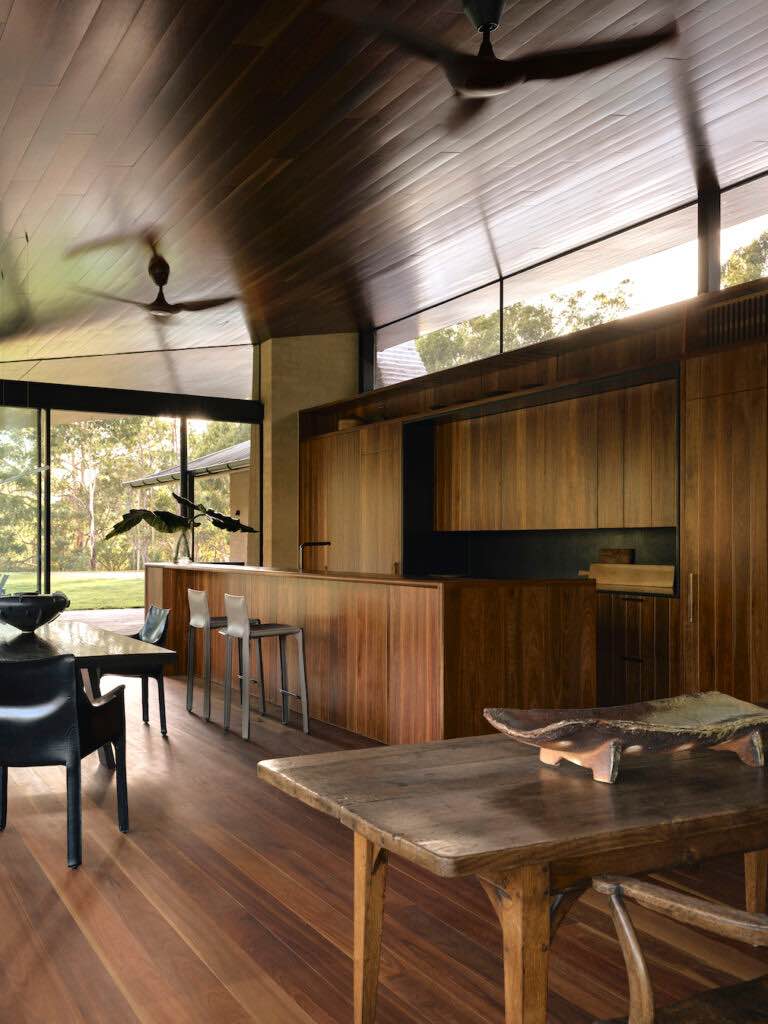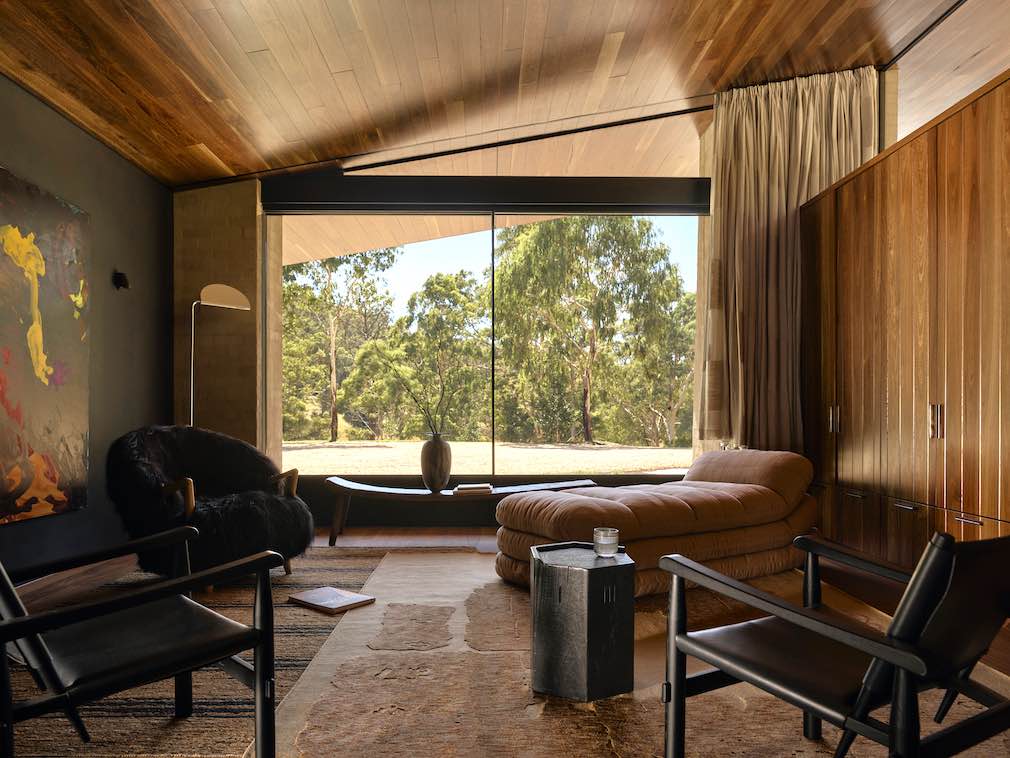 Wnętrza wykończono spotted gum – odpornym, lokalnym drewnem, którego naturalne odcienie i tekstury otulają całą przestrzeń. Jest to materiał trwały, ekologiczny i wyjątkowo charakterystyczny dla australijskiej architektury wiejskiej. Ograniczona paleta materiałów pozwala uzyskać wrażenie spójności, równowagi i harmonii z otaczającą naturą.