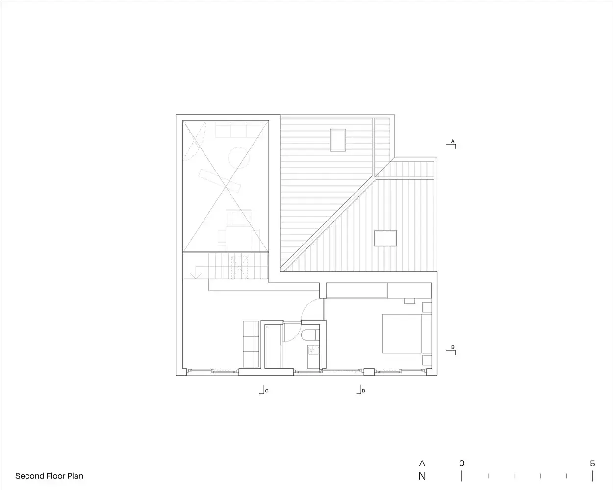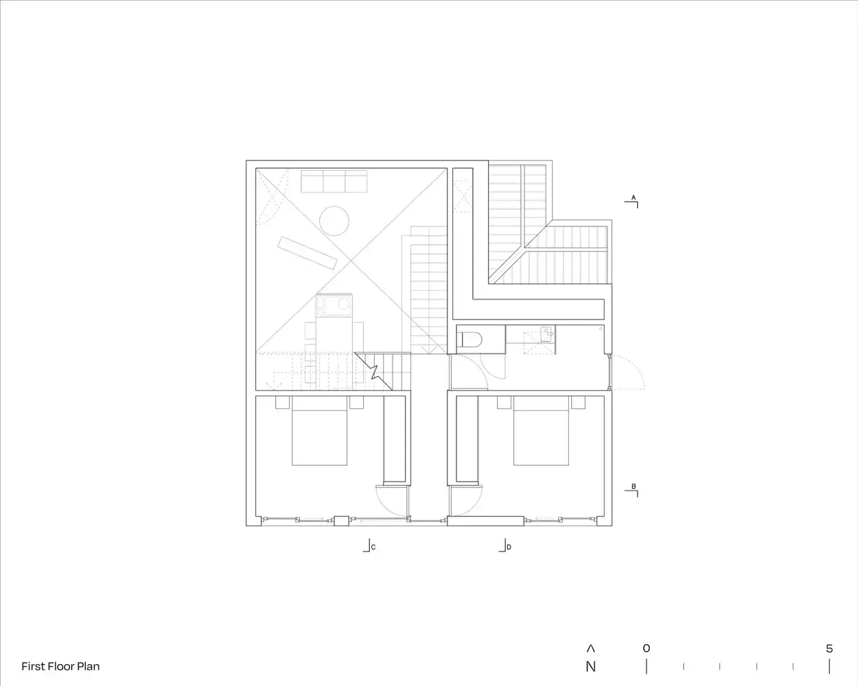 Wszystkie przestrzenie publiczne dzielą połowę domu na otwartej przestrzeni o pełnej wysokości. Intymne rozłożono natomiast na trzech poziomach drugiej połowy, wystarczająco dużych, aby pomieścić właścicieli i ich odwiedzających przyjaciół. Ponieważ projekt celebruje wspólne spędzanie czasu, długi stół wykonany z powalonego pnia modrzewia zajmuje prawie całą przestrzeń parteru, służąc jako stół jadalny i jednostka kuchenna. Z jednej strony podłogę obniżono o jeden stopień, aby zapewnić niezbędną wysokość do wygodnego gotowania, dzieląc jednocześnie tę samą powierzchnię z gośćmi. Dwie sypialnie główne znajdują się na pierwszym piętrze, jedna dla niej, a druga dla niego. Drzwi naprzeciwko siebie i wspólny korytarz zapewniają pewien stopień intymności między nimi bez zmiany ich niezależności. Na drugim piętrze pokój do nauki otwiera się na potrójną wysokość z góry.