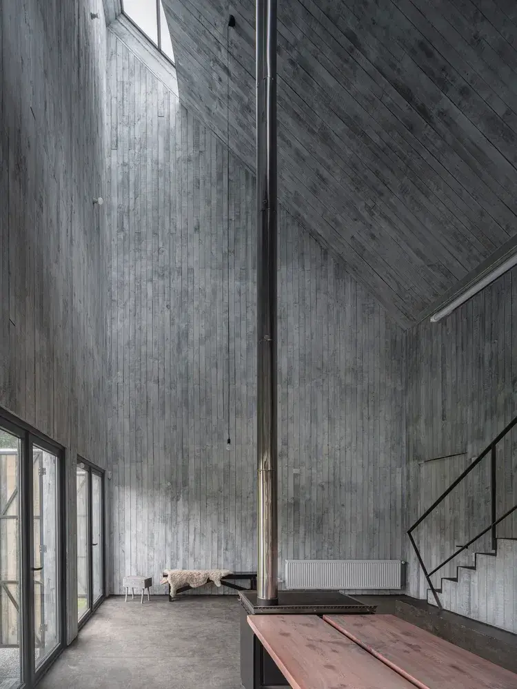 Zarówno wnętrze, jak i elewację pokryto surowymi drewnianymi listwami, barwionymi jedna po drugiej. Szorstkość materiału i różne odcienie szarości nadają domowi ponadczasowy wygląd, łącząc go z zawsze mglistymi porankami, które dały nazwę temu obszarowi.