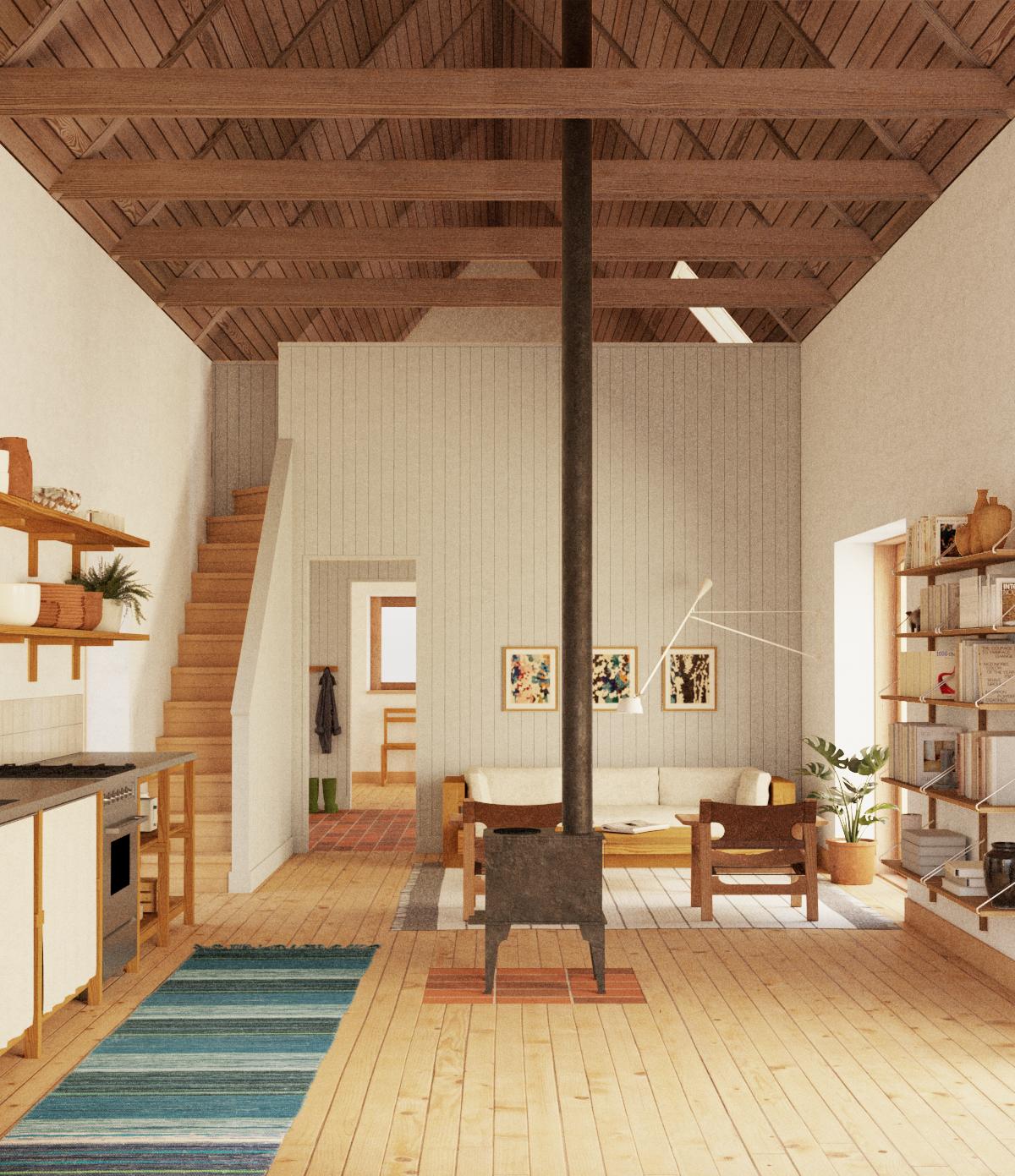 Stolarkę okienną i drzwiową zaprojektowano z olejowanego drewna sosny rdzeniowej, a dach zostanie pokryty falistą blachą cynkową. Zestawienie tych materiałów buduje architekturę prostą, uczciwą i mocno zakorzenioną w tradycji budowania z tego, co trwałe, lokalne i naturalne.