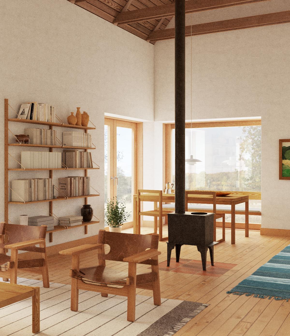Choć projekt powstaje przy ograniczonym budżecie, nie oznacza to rezygnacji z jakości przestrzeni. Wręcz przeciwnie – prostota staje się tu świadomym narzędziem projektowym. Ograniczona forma, naturalne materiały i przemyślana orientacja sprawiają, że dom zyskuje spokojny, ponadczasowy wyraz.