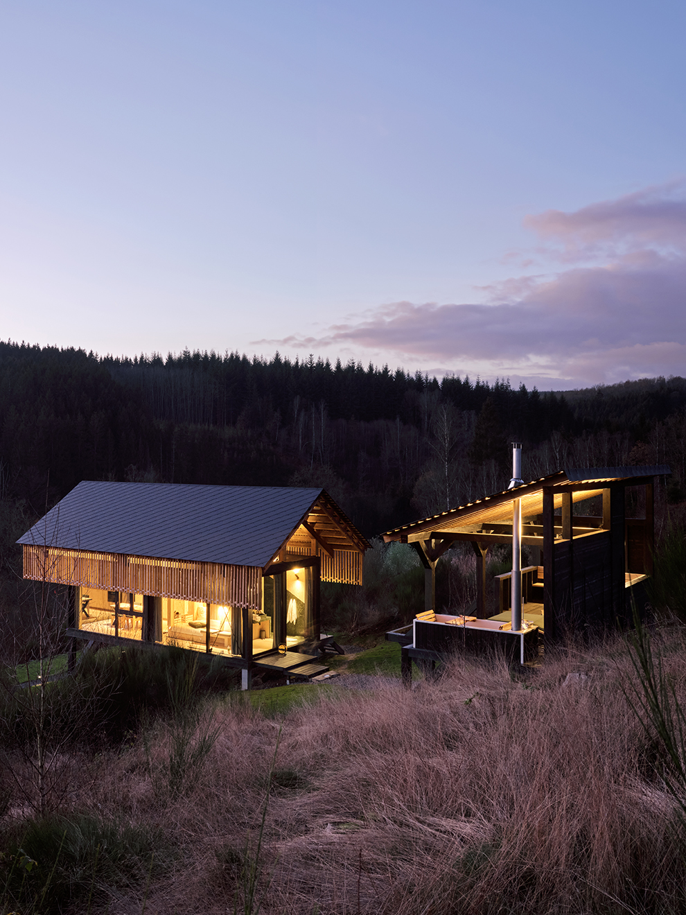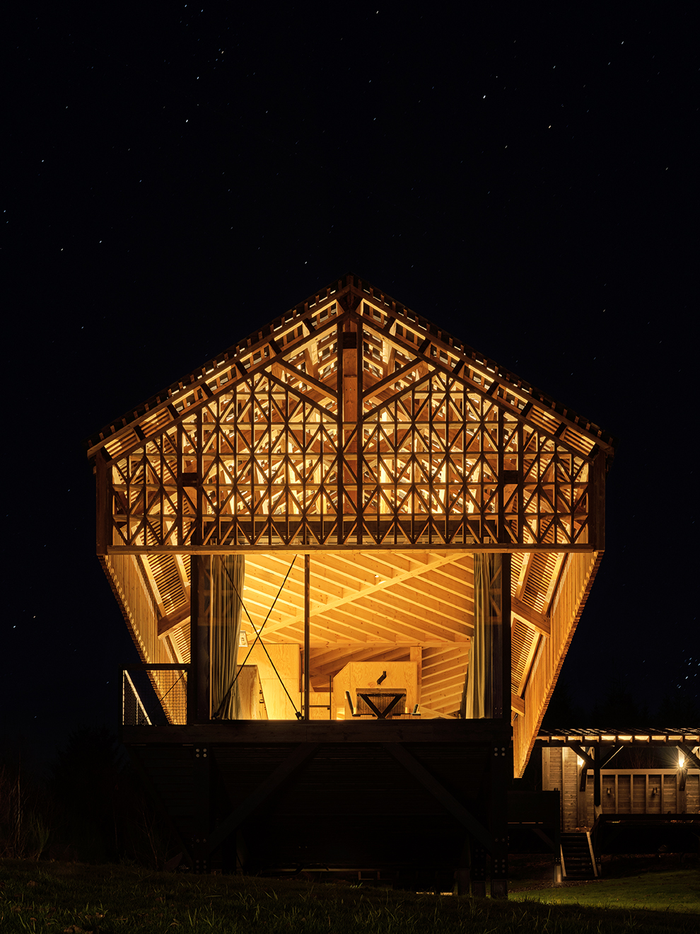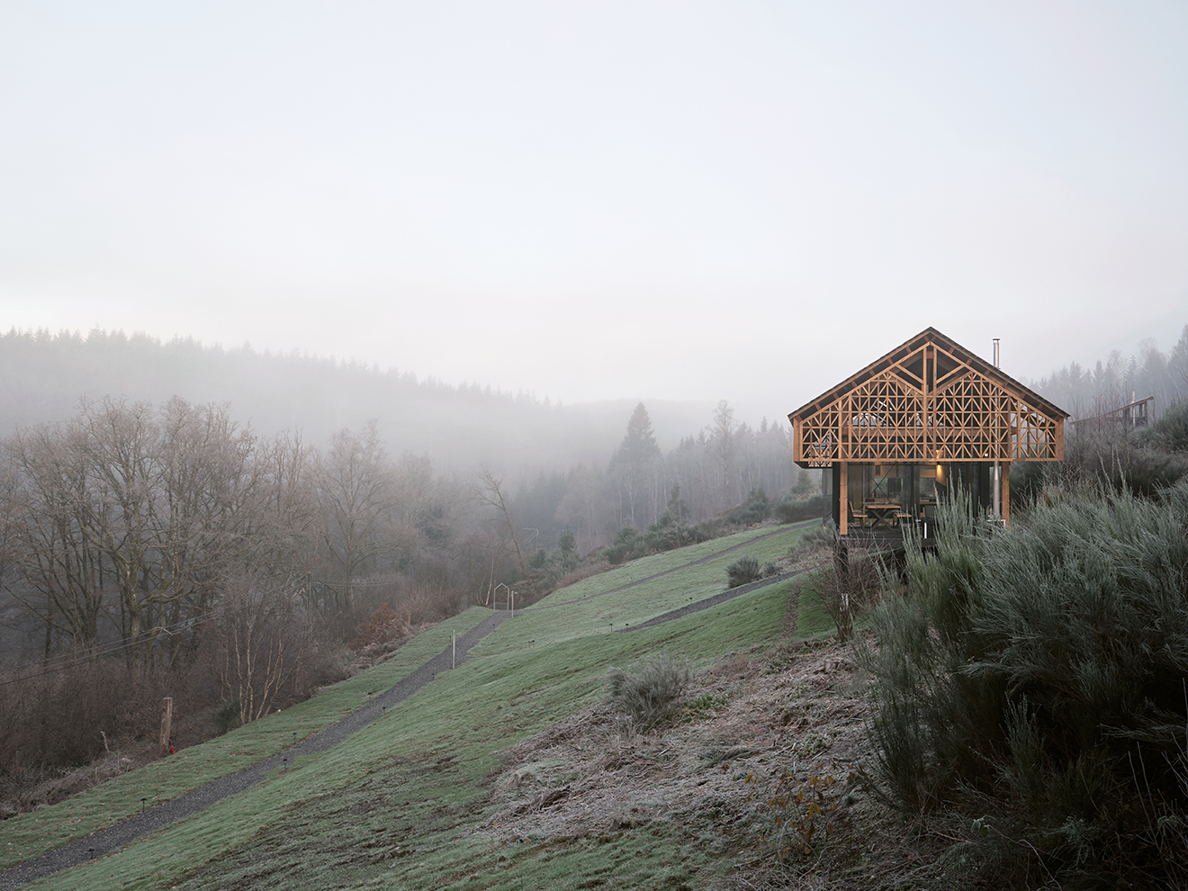 Domki – Badger, Racoon i Weasel – zostały zaprojektowane jako kompaktowe przestrzenie dla małych rodzin lub par, oferujące panoramiczne widoki na doliny, lasy i otwarty krajobraz. Ich usytuowanie na wzniesieniu pozwala w pełni doświadczyć otaczającej przyrody, a duże przeszklenia otwierają wnętrza na zmieniające się światło i krajobraz.