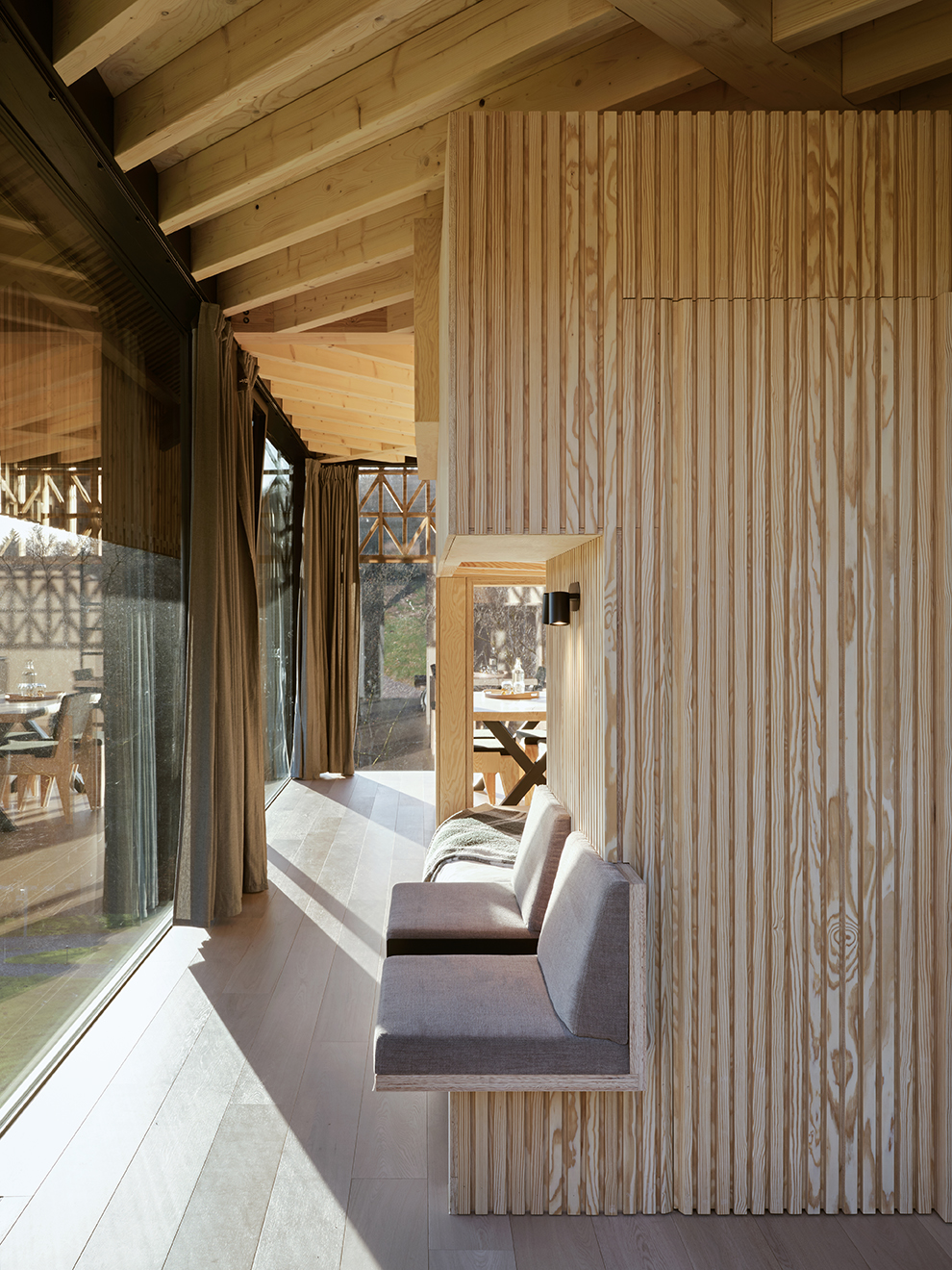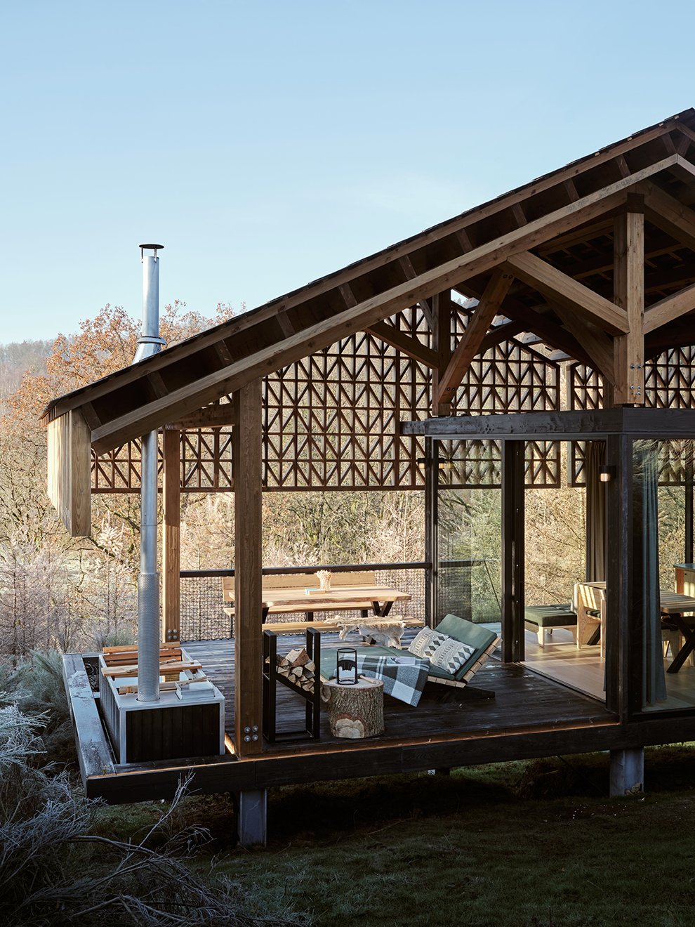 Charakterystycznym elementem są duże, panoramiczne przeszklenia oraz drewniane okiennice, które pozwalają regulować światło i zapewniają prywatność. Dzięki nim wnętrze pozostaje w stałym dialogu z otoczeniem – granica między domem a naturą zaciera się niemal całkowicie.