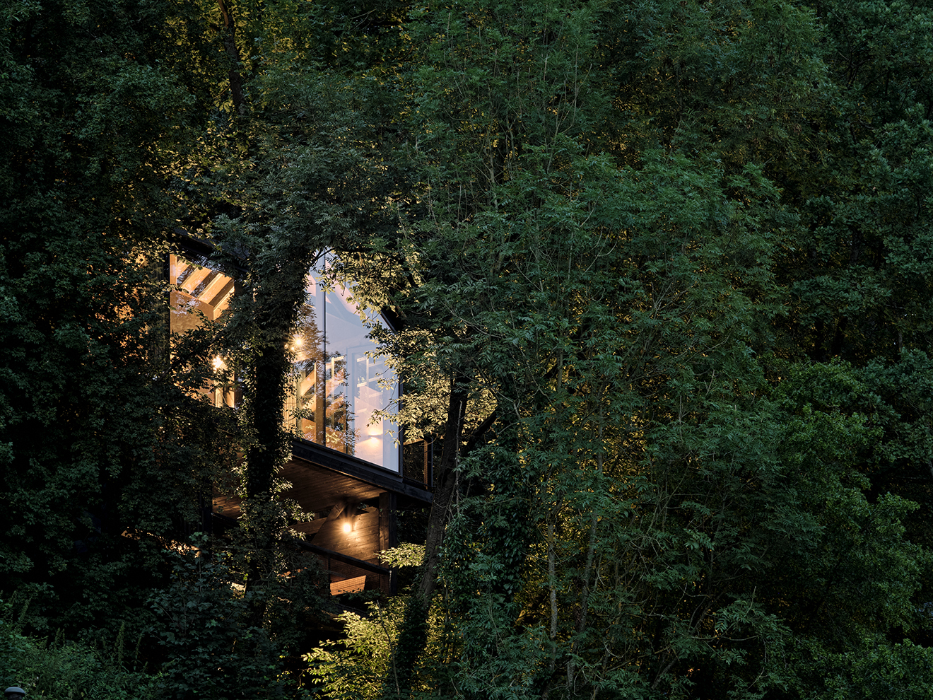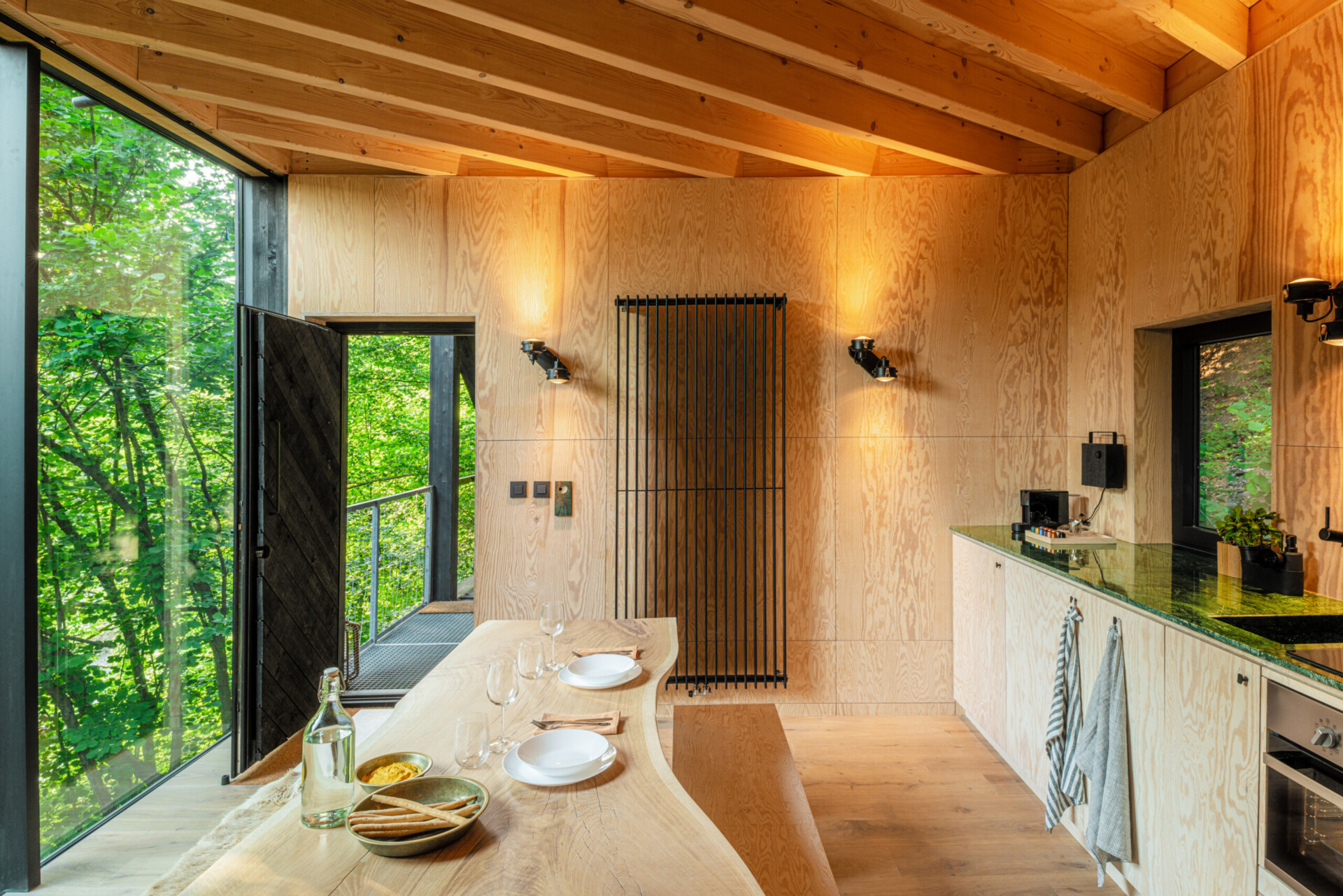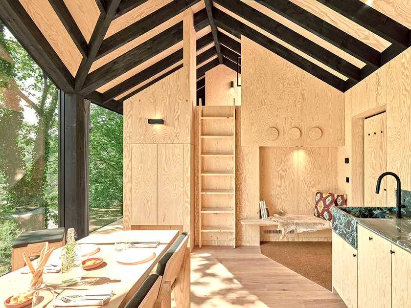 Kabiny różnią się relacją z terenem – część z nich „unosi się” wśród drzew, inne są bliżej ziemi, ale wszystkie oferują prywatne tarasy i duże przeszklenia, które otwierają wnętrza na naturę.
