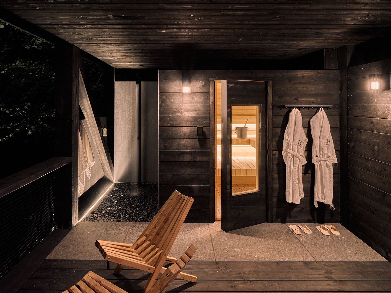 Mimo niewielkiej skali kabiny oferują wysoki standard – każda wyposażona jest w prywatną saunę, a także zewnętrzny prysznic lub taras wypoczynkowy.