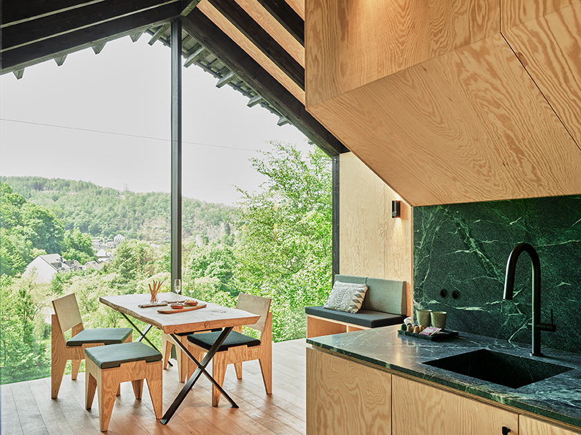 Projekt Hutstuf La Roche to zespół czterech nowoczesnych, drewnianych kabin położonych na spokojnym, zielonym zboczu w belgijskich Ardenach. Każdy z domków – Owl, Fox, Eagle i Beaver – został zaprojektowany tak, aby maksymalnie wykorzystać walory krajobrazu i zapewnić panoramiczne widoki na dolinę rzeki Ourthe, lasy oraz ruiny zamku w La Roche-en-Ardenne.
