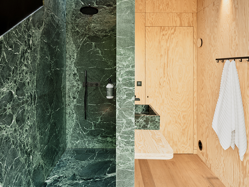 Projekt opiera się na naturalnych materiałach i dopracowanych detalach. Konstrukcję wykonano z drewna sosnowego pochodzącego z lokalnych tartaków, a wnętrza uzupełniono kamiennymi akcentami, m.in. zielonym marmurem w strefach kąpielowych.