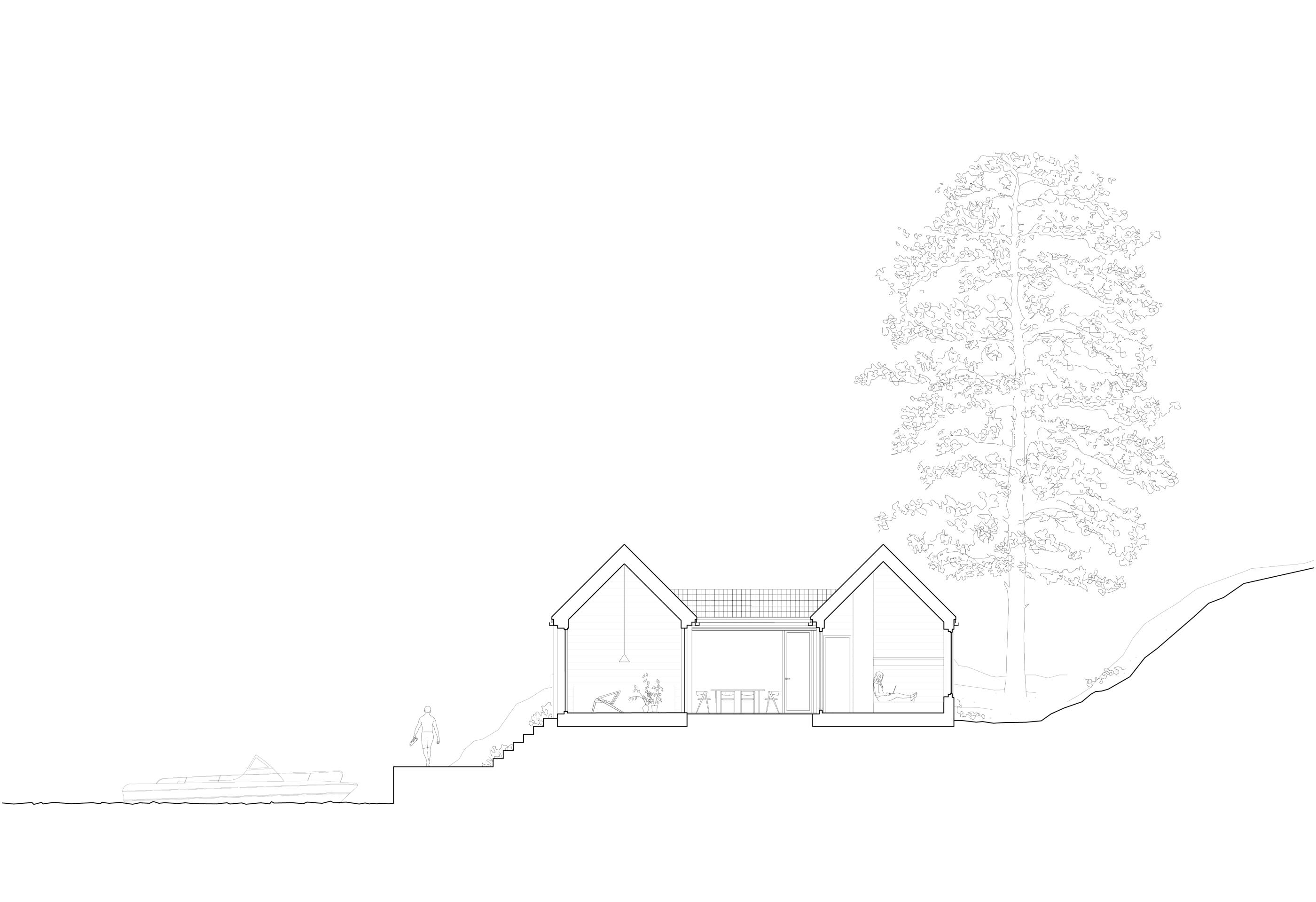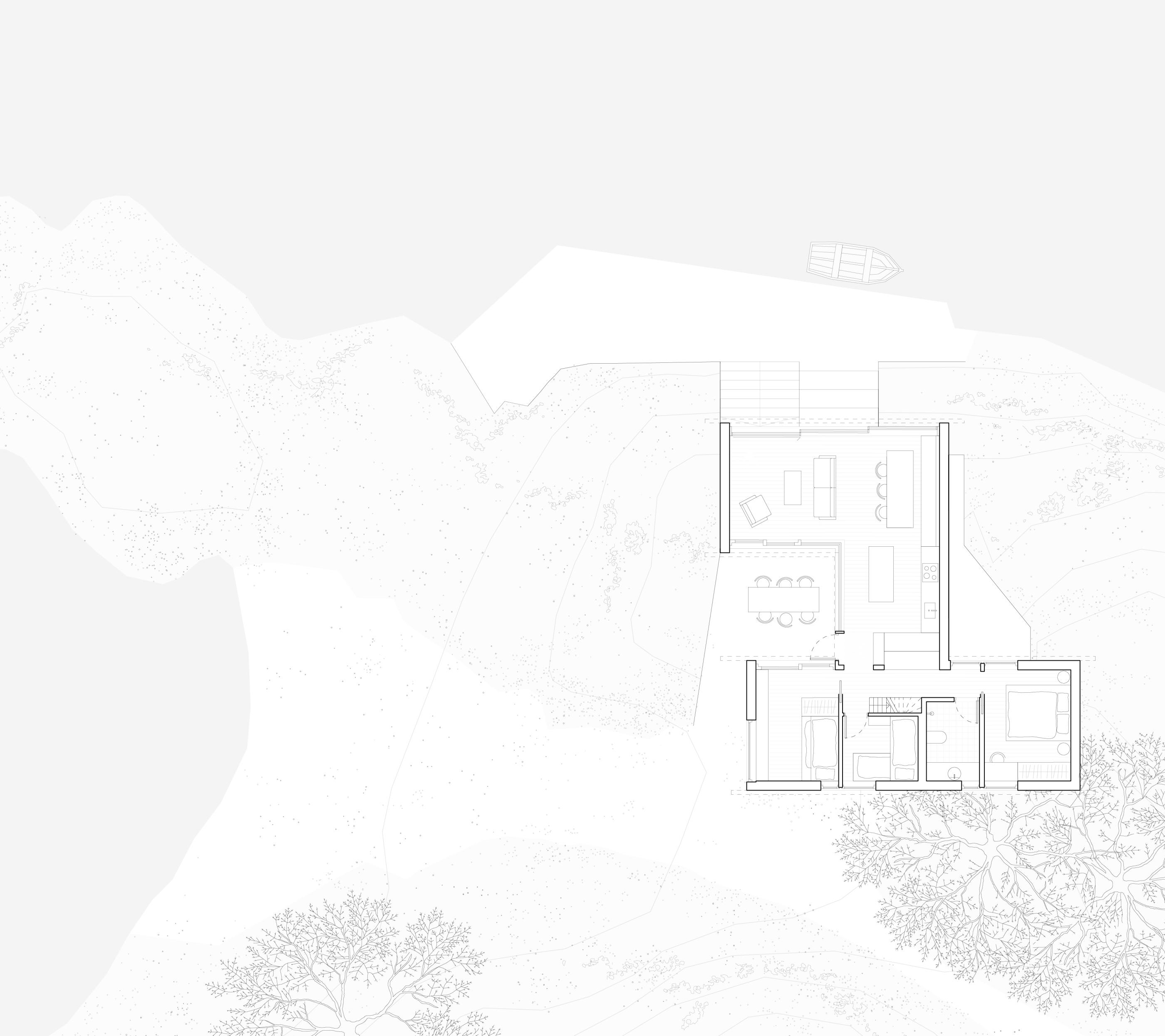 Został on zaprojektowany jako miejsce do odpoczynku i bliskiego kontaktu z naturą. Przestrzenie wewnętrzne są maksymalnie funkcjonalne, oferując komfortowe warunki na niewielkiej powierzchni. Salon, jadalnia i kuchnia tworzą otwartą przestrzeń, która płynnie łączy się z tarasem, stanowiącym idealne miejsce na relaks i podziwianie widoków.
