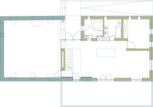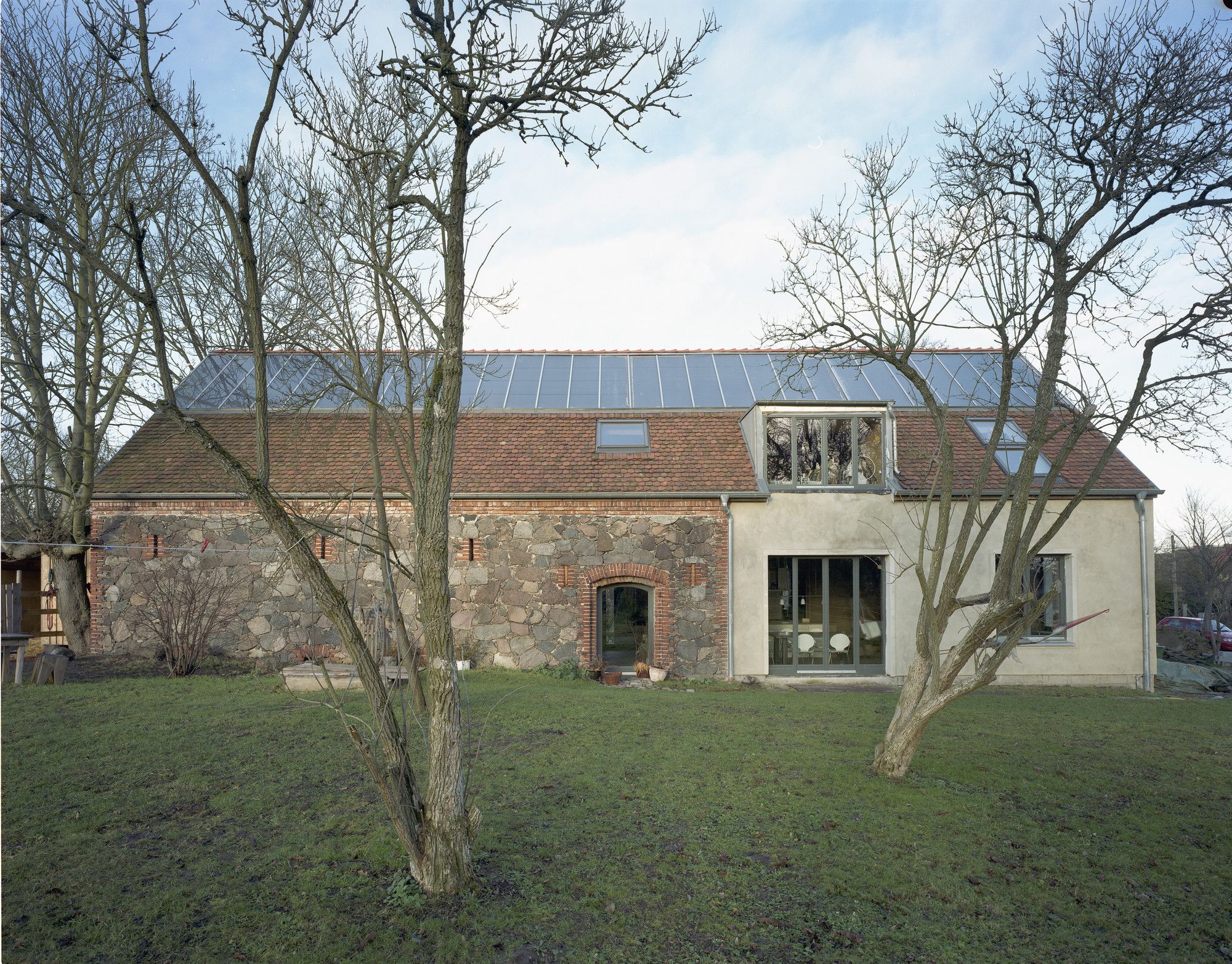 Nowy dom mieszkalny powstał w miejscu dawnej zabudowy gospodarczej, przejmując formę starej, kamiennej stodoły i zastępując zniszczoną wcześniej drewnianą konstrukcję. Budynek zamyka historyczny zespół zabudowań oraz wyznacza naturalną granicę pomiędzy wioską a rezerwatem przyrody Märkische Schweiz. Surowa, kamienna bryła została zachowana jako nieogrzewana przestrzeń gospodarcza, natomiast nowa część mieszkalna subtelnie dopełnia całość. Wejście prowadzi od strony północnej przez oryginalne drzwi starej stodoły, a przejście między starą i nową strukturą podkreślają ściana z ubitej ziemi oraz przeszklona fasada. To przykład, jak nowoczesna stodoła może łączyć historię miejsca z współczesną architekturą.