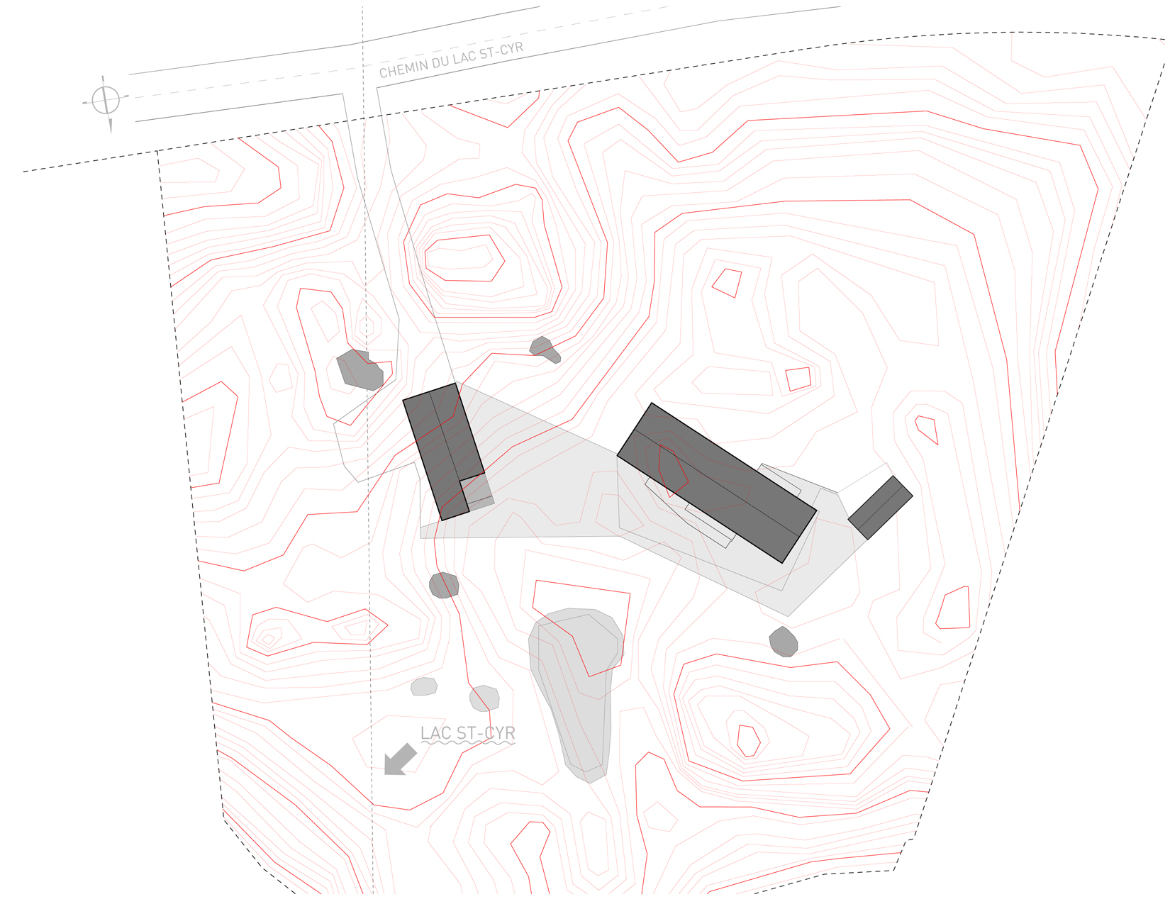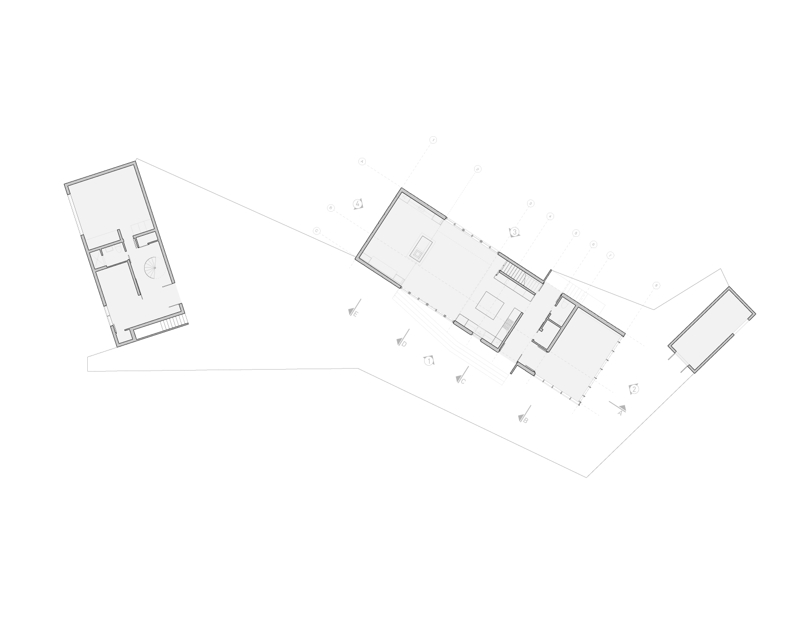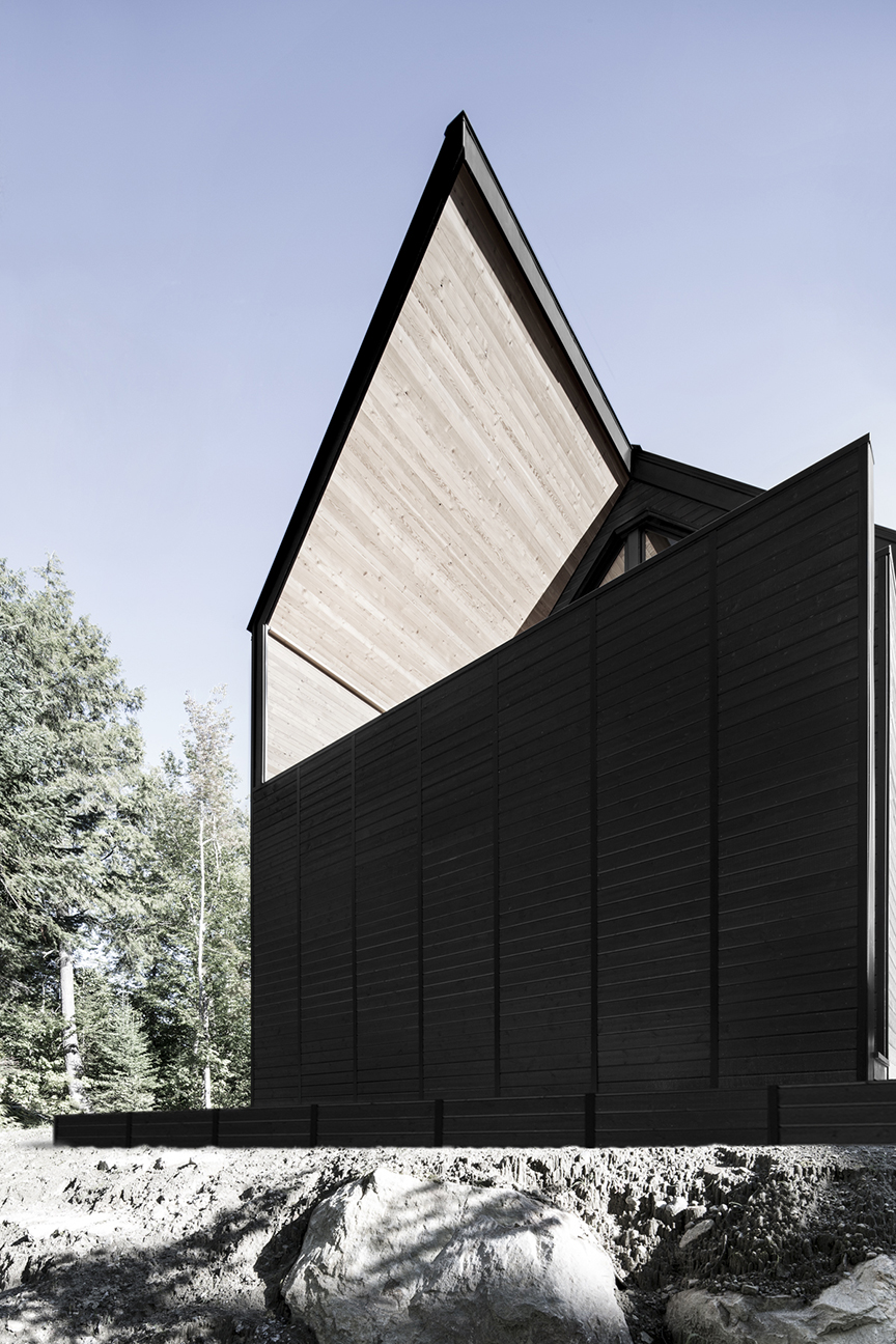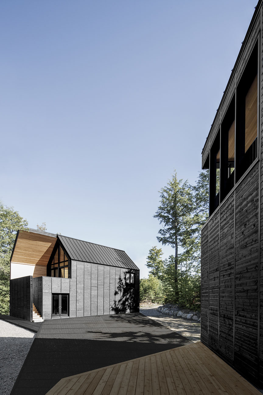 Trzy minimalistyczne bryły z czerwonego cedru – dwie mieszkalne i jedna użytkowa – rozmieszczono wokół centralnego placu. Betonowa płyta łączy je w całość, tworząc wspólną podstawę. Powstałe między budynkami pustki i przejścia tworzą miejsca spotkań, graniczące z dzikim, naturalnym otoczeniem.