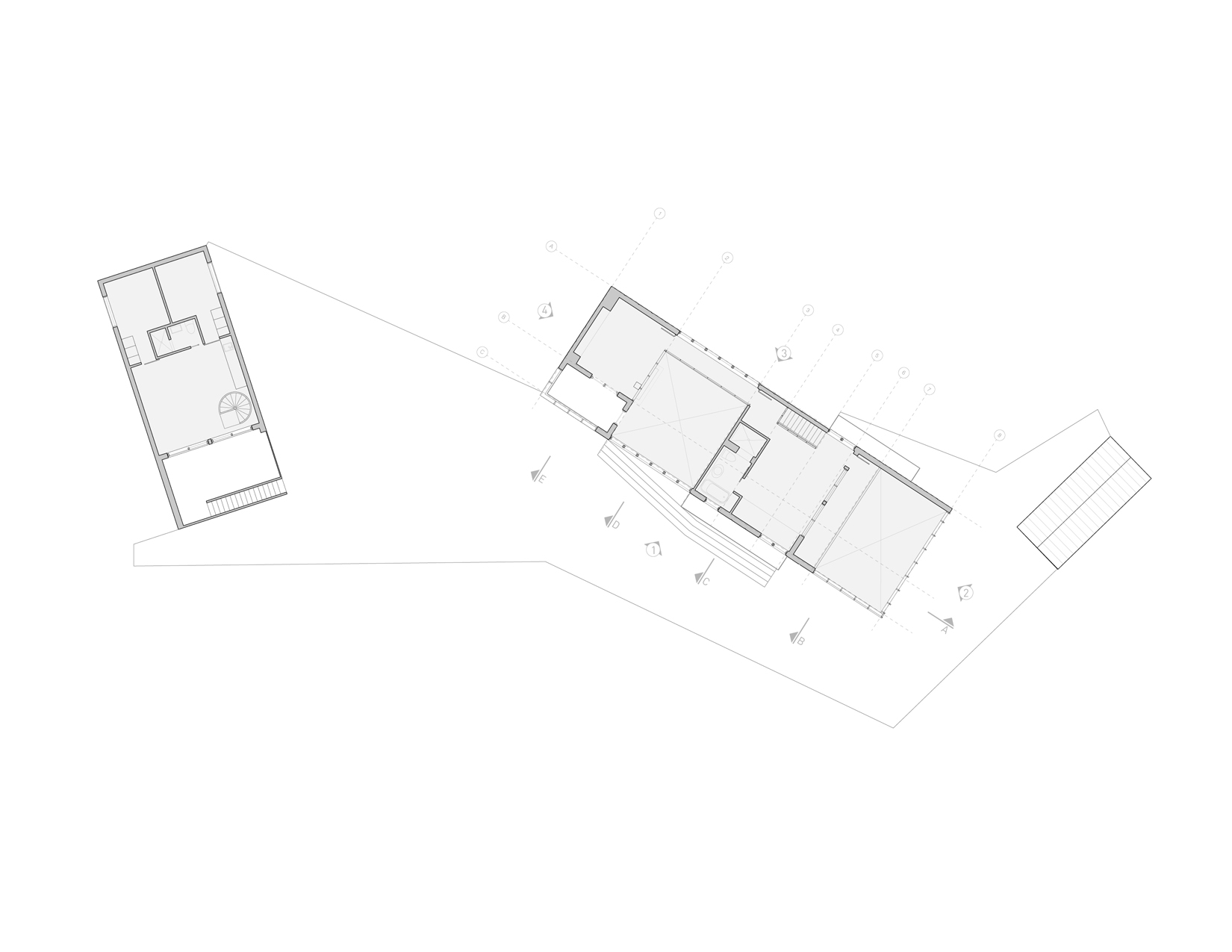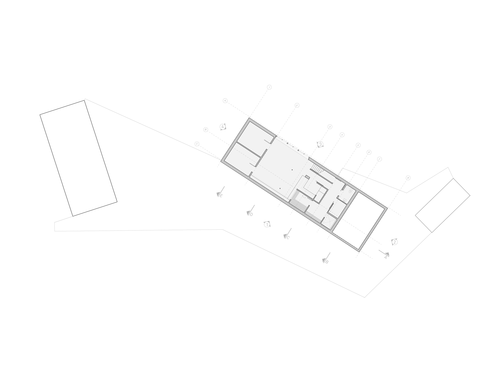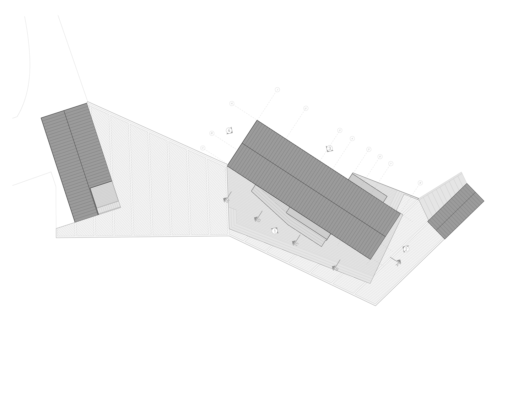 Trzy minimalistyczne bryły z czerwonego cedru – dwie mieszkalne i jedna użytkowa – rozmieszczono wokół centralnego placu. Betonowa płyta łączy je w całość, tworząc wspólną podstawę. Powstałe między budynkami pustki i przejścia tworzą miejsca spotkań, graniczące z dzikim, naturalnym otoczeniem.