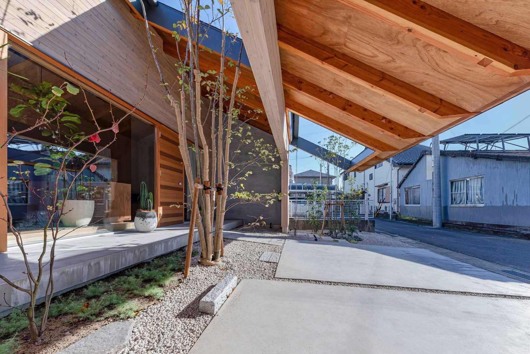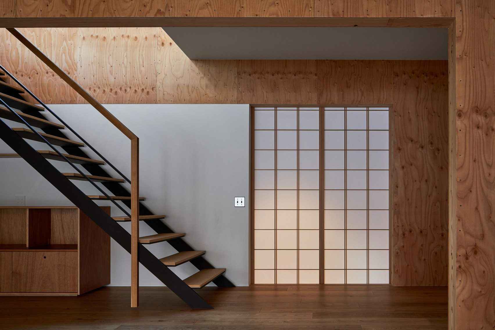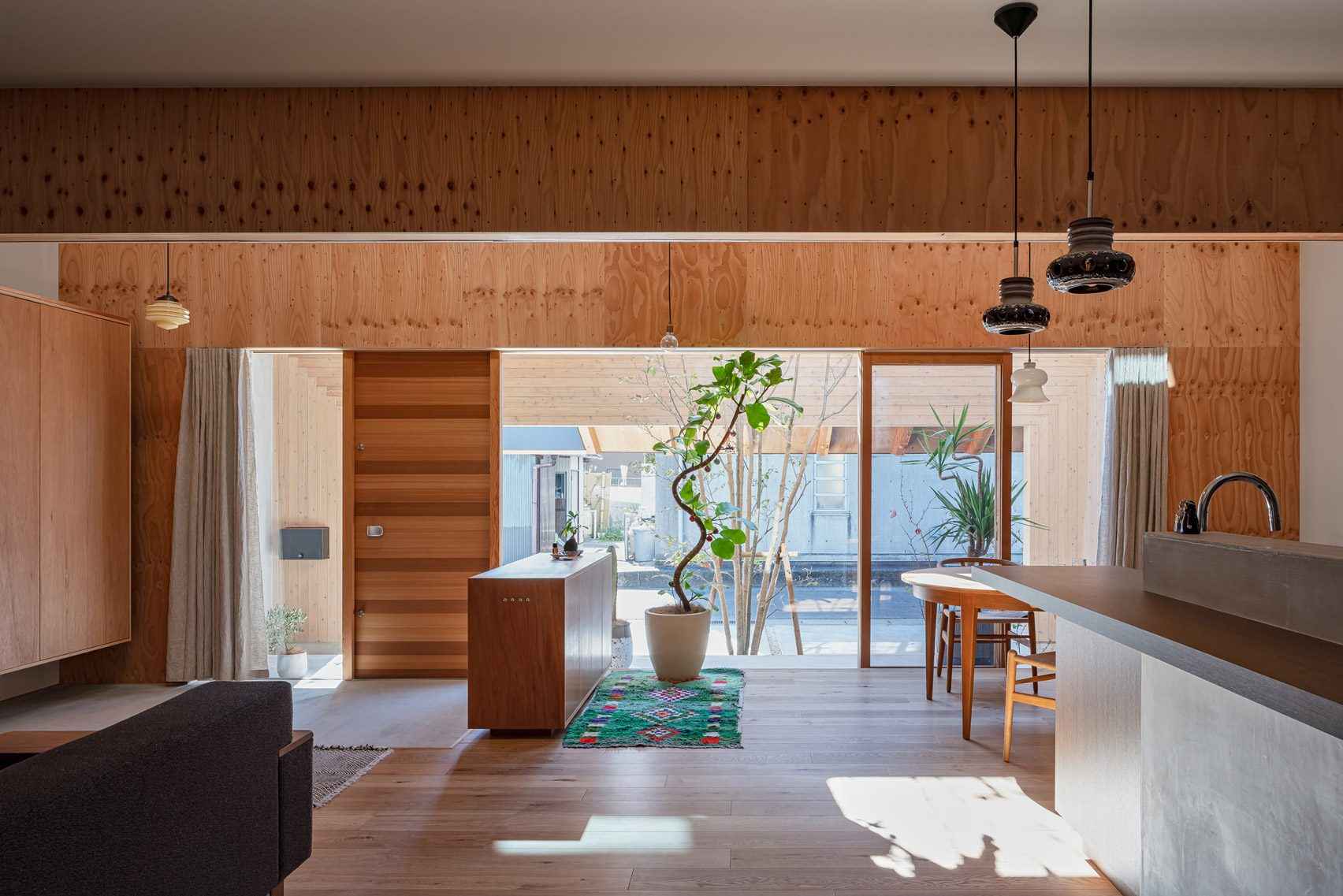 Kluczowym założeniem konstrukcyjnym projektu było osiągnięcie dużej odporności sejsmicznej bez utraty przestrzenności. Zamiast typowego układu z osobnymi pomieszczeniami, zastosowano system sześciu drewnianych ram, które podtrzymują dach i tworzą rytmiczną strukturę całego wnętrza. Każda z ram rozpięta jest na całą szerokość działki (8 metrów), dzięki czemu uzyskano maksymalnie otwartą przestrzeń dzienną. Salon, kuchnia i jadalnia płynnie łączą się z zewnętrznym ogrodem. Zasłony umieszczone w ramach pozwalają na elastyczne dzielenie przestrzeni, a liczne przeszklenia otwierają wnętrze na zieleń. Rozciągnięty okap nie tylko osłania ogród i taras, ale także staje się aktywnym elementem codziennego życia domowników.