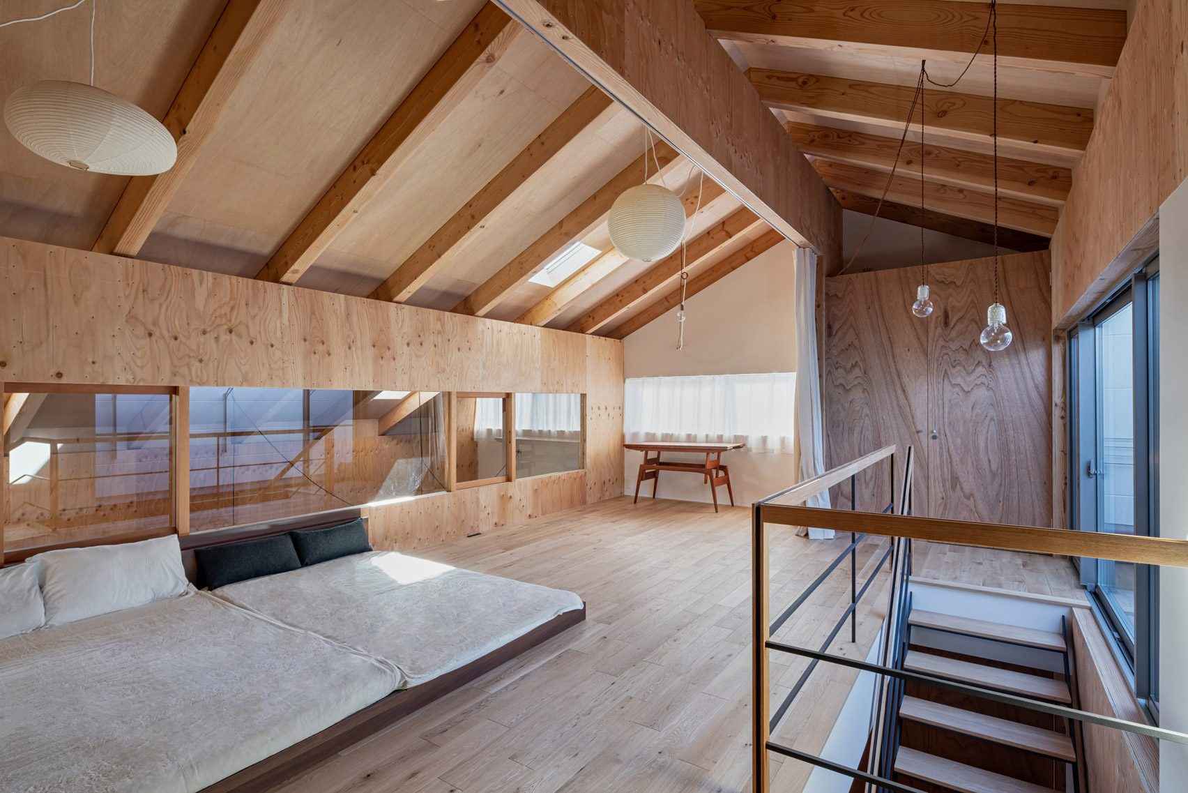 Strefy prywatne – takie jak łazienka i tradycyjny pokój w stylu japońskim z matą tatami – znajdują się w tylnej części domu, zapewniając ciszę i intymność. Na piętrze, pod kalenicą, zlokalizowano jasną sypialnię z wewnętrznymi oknami, które wpuszczają naturalne światło i utrzymują kontakt wizualny z niższym poziomem. Imaise House to przykład inteligentnej architektury miejskiej, która umiejętnie wykorzystuje każdy centymetr działki, zachowując przy tym elegancję formy, funkcjonalność i kontekst lokalny. Projekt łączy w sobie elementy tradycyjnej japońskiej zabudowy z nowoczesną stodołą, tworząc wyjątkowy dom odporny na trzęsienia ziemi, idealnie wpisany w gęsto zabudowaną dzielnicę.