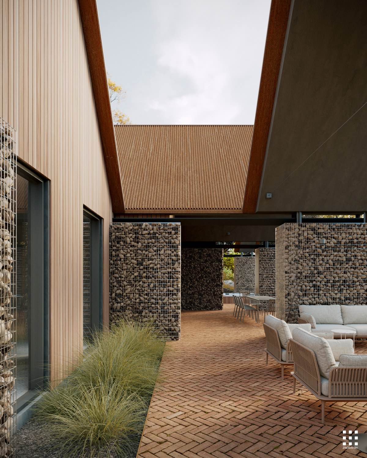 Głównym materiałem budynku jest drewno – ciepłe, naturalne, odnawialne, idealne dla architektury tworzącej atmosferę domu. Drugim charakterystycznym elementem są gabiony, które zazwyczaj pełnią funkcję ogrodzeń. Tutaj stały się częścią elewacji. Co istotne, wypełniono je kamieniami pochodzącymi bezpośrednio z działki – pozostałościami po pracach ziemnych. Dzięki temu dom jeszcze mocniej stapia się ze swoim miejscem, a proces budowy staje się bardziej zrównoważony i oszczędny.