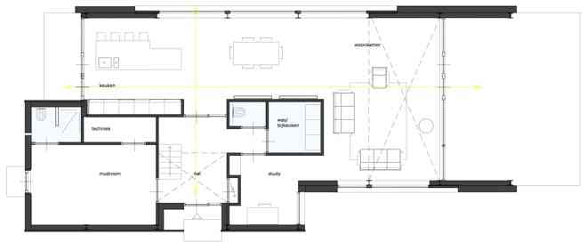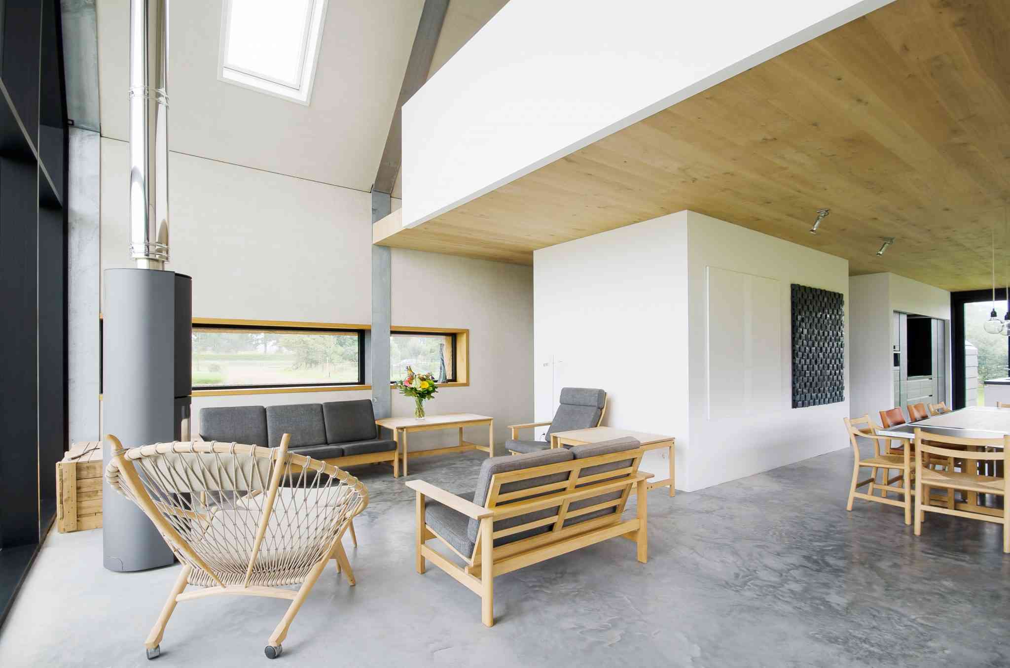 Wnętrze domu łączy beton, szkło i stal, tworząc przestrzeń minimalistyczną, ale przyjazną. Liczne przeszklenia wprowadzają naturalne światło i otwierają przestrzeń na otoczenie. Klientka, Inès, podkreśla, że projekt w pełni odpowiada ich wizji – mieszkanie na wsi w minimalistycznym domu, który jednocześnie szanuje środowisko. Dzięki starannie dobranym materiałom i przemyślanej konstrukcji mieszkańcy mogą cieszyć się spokojem, prywatnością i bliskością natury, a wnętrza stają się przedłużeniem krajobrazu.