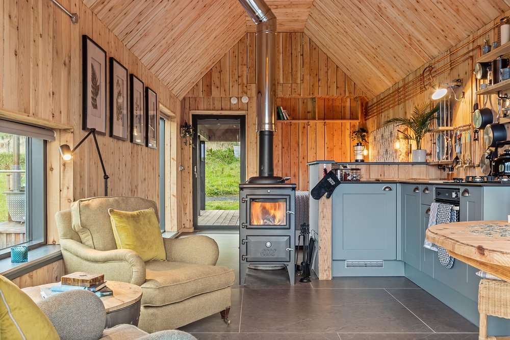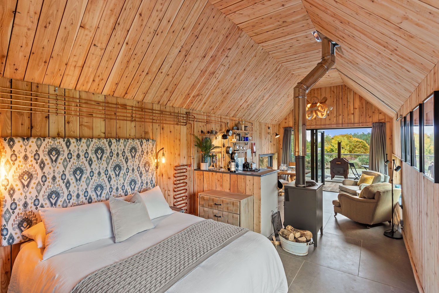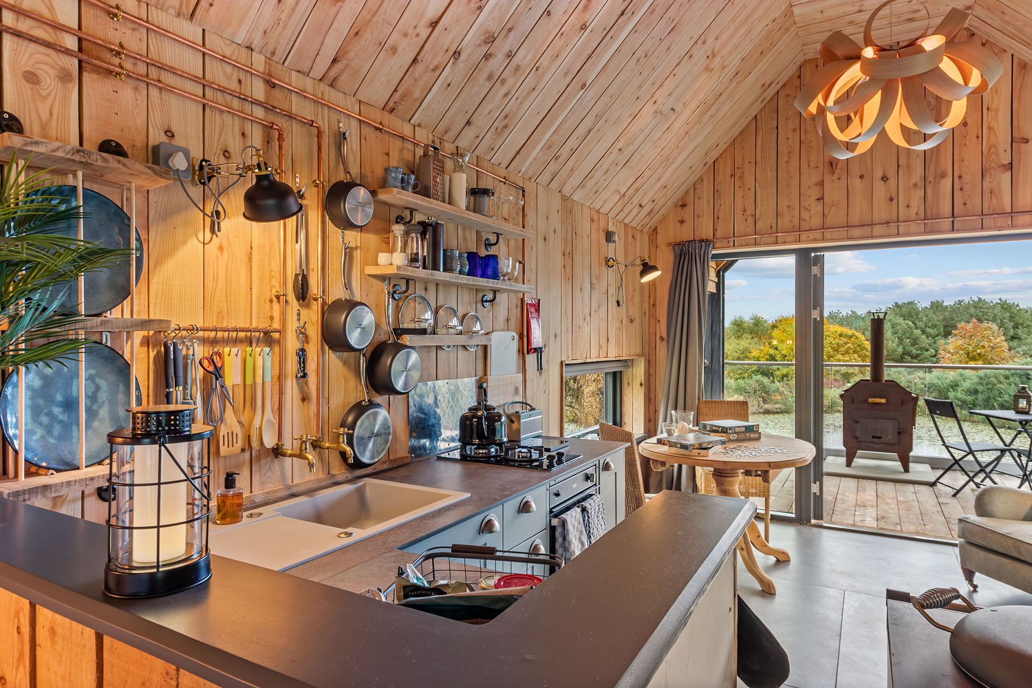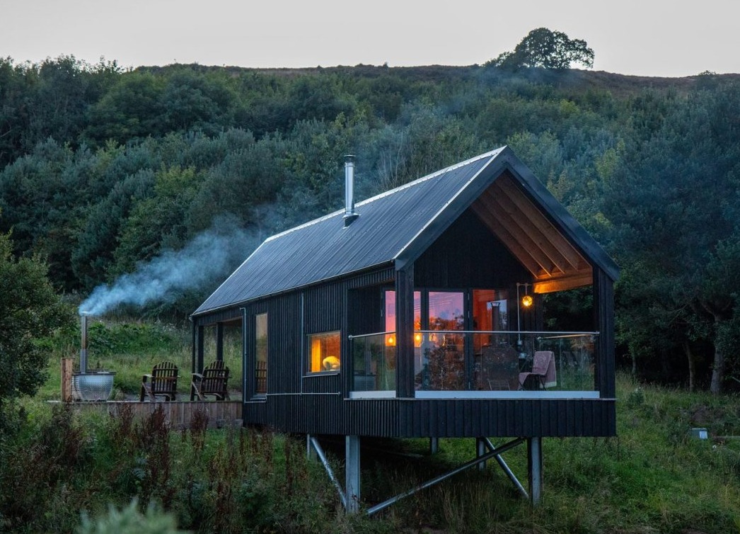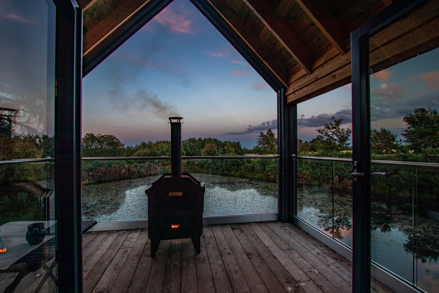 Ta elegancka, czarna nowoczesna stodoła to połączenie wyjątkowej architektury i bliskości natury. Dom oferuje przestronny taras widokowy zawieszony nad taflą stawu, gdzie można wypocząć pod zadaszeniem, podziwiając przybrzeżną przyrodę. Z tej perspektywy dostrzec można m.in. świstuny, słonki, jaskółki, jerzyki, kaczki krzyżówki, czaple, bażanty, a czasem nawet sarnę. Największą atrakcją jest możliwość obserwacji natury z pozycji relaksującej wanny z hydromasażem.