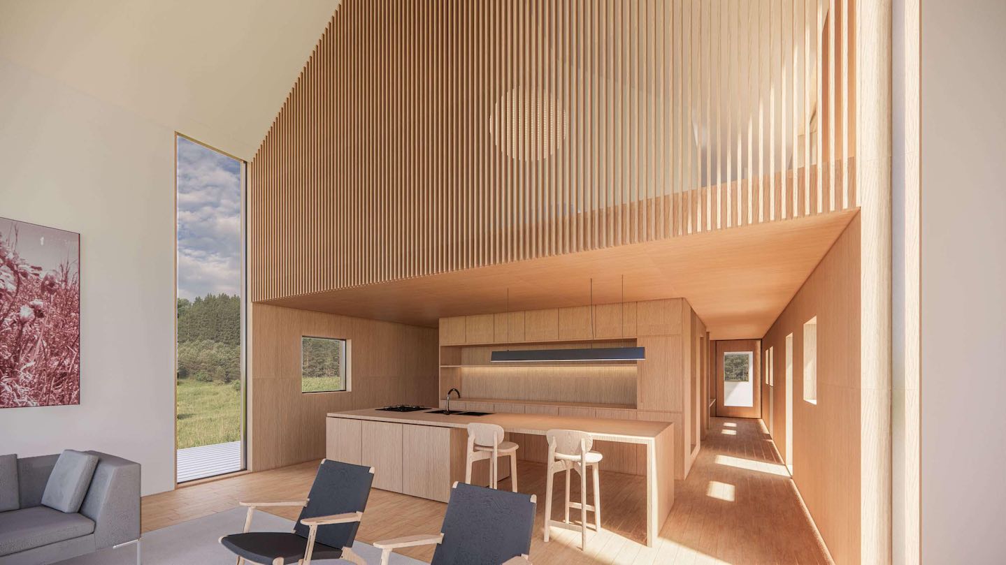Architektura opiera się na prostocie geometrycznej i czystych liniach, które podkreślają otaczające krajobrazy – lasy, naturalne światło i zmienność pór roku. Naturalne materiały, starannie dobrane, takie jak drewno i surowe wykończenia, nadają przestrzeni przytulny, ludzki wymiar i zachęcają do spędzania czasu blisko przyrody. Projekt celowo minimalizuje wizualną dominację architektury, oddając pierwszeństwo otaczającemu środowisku.