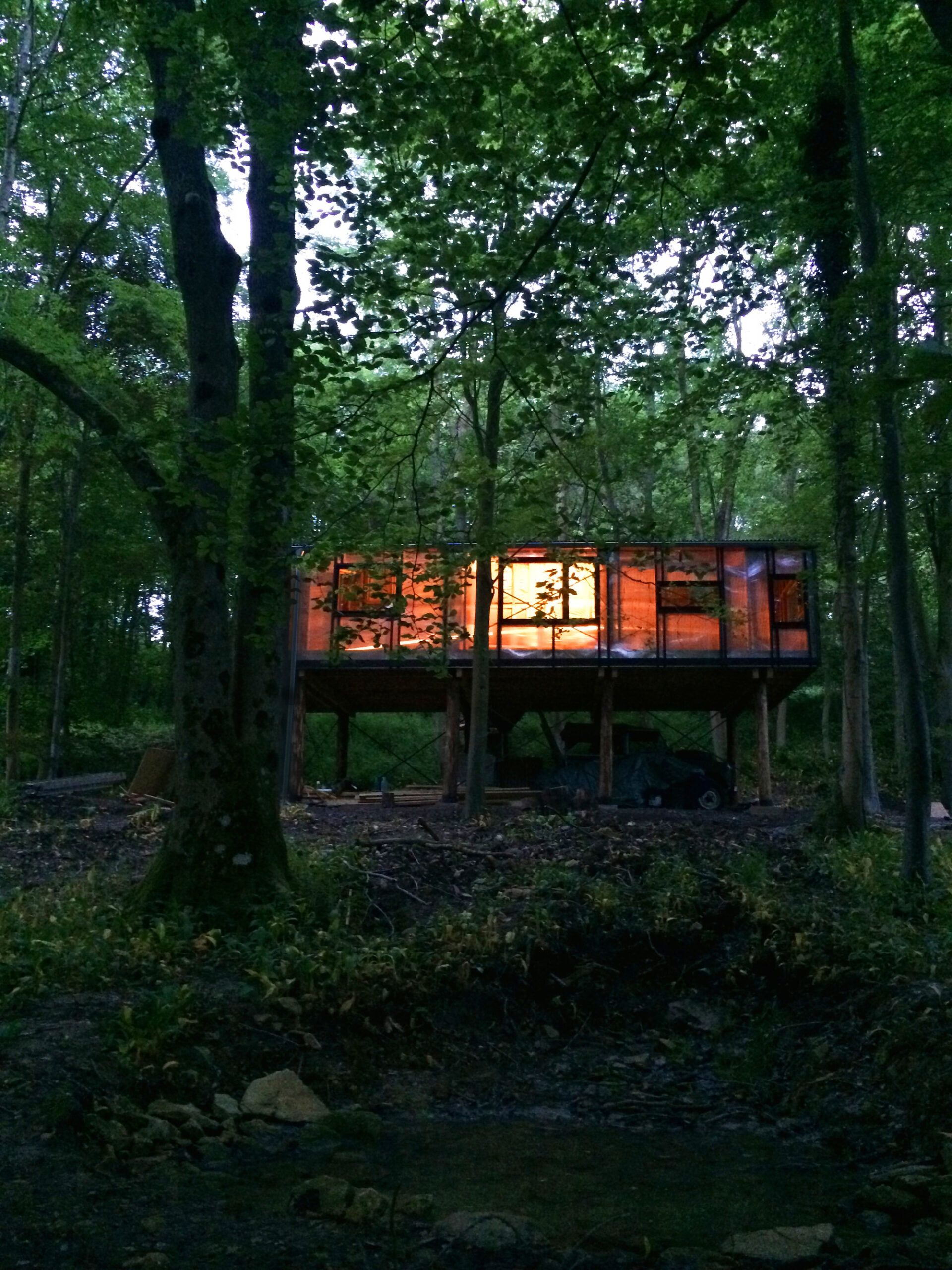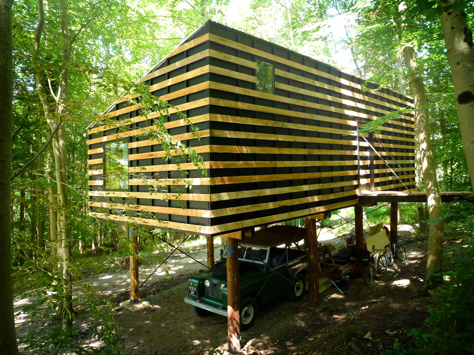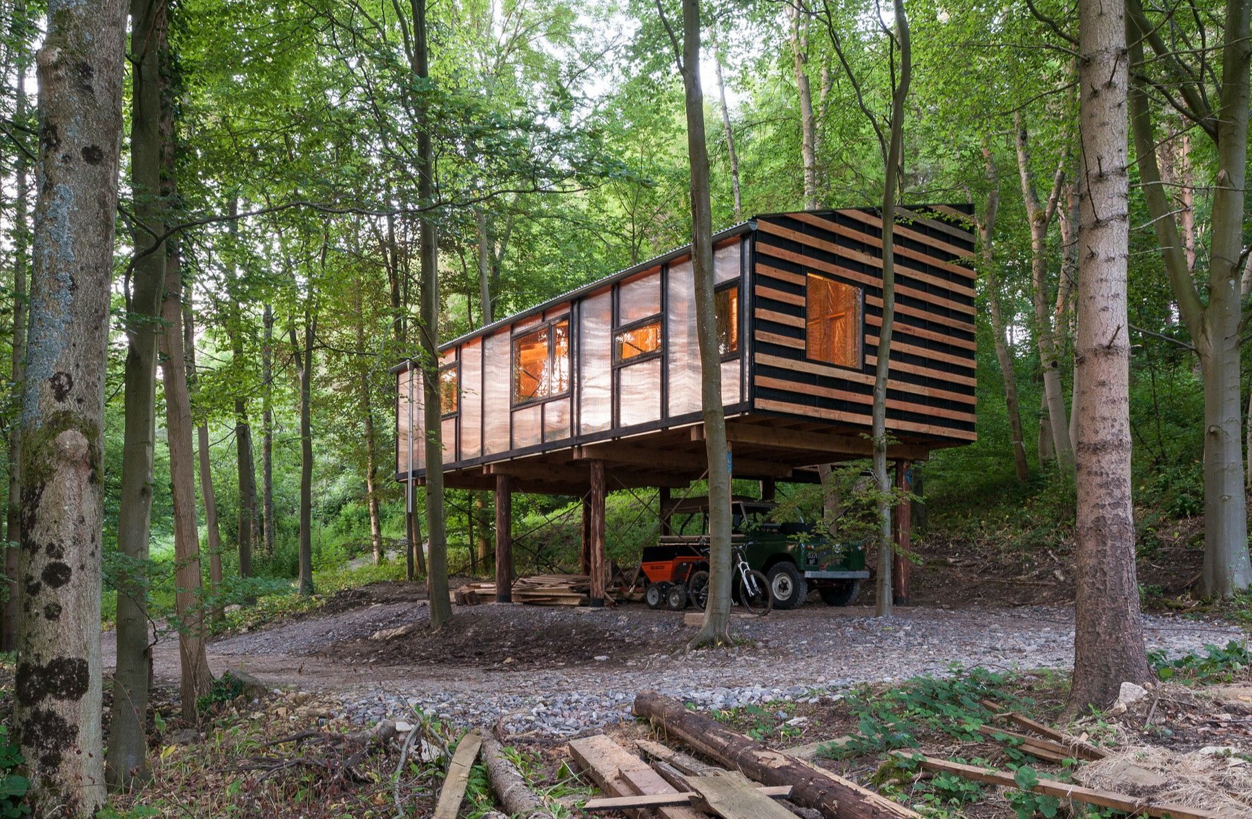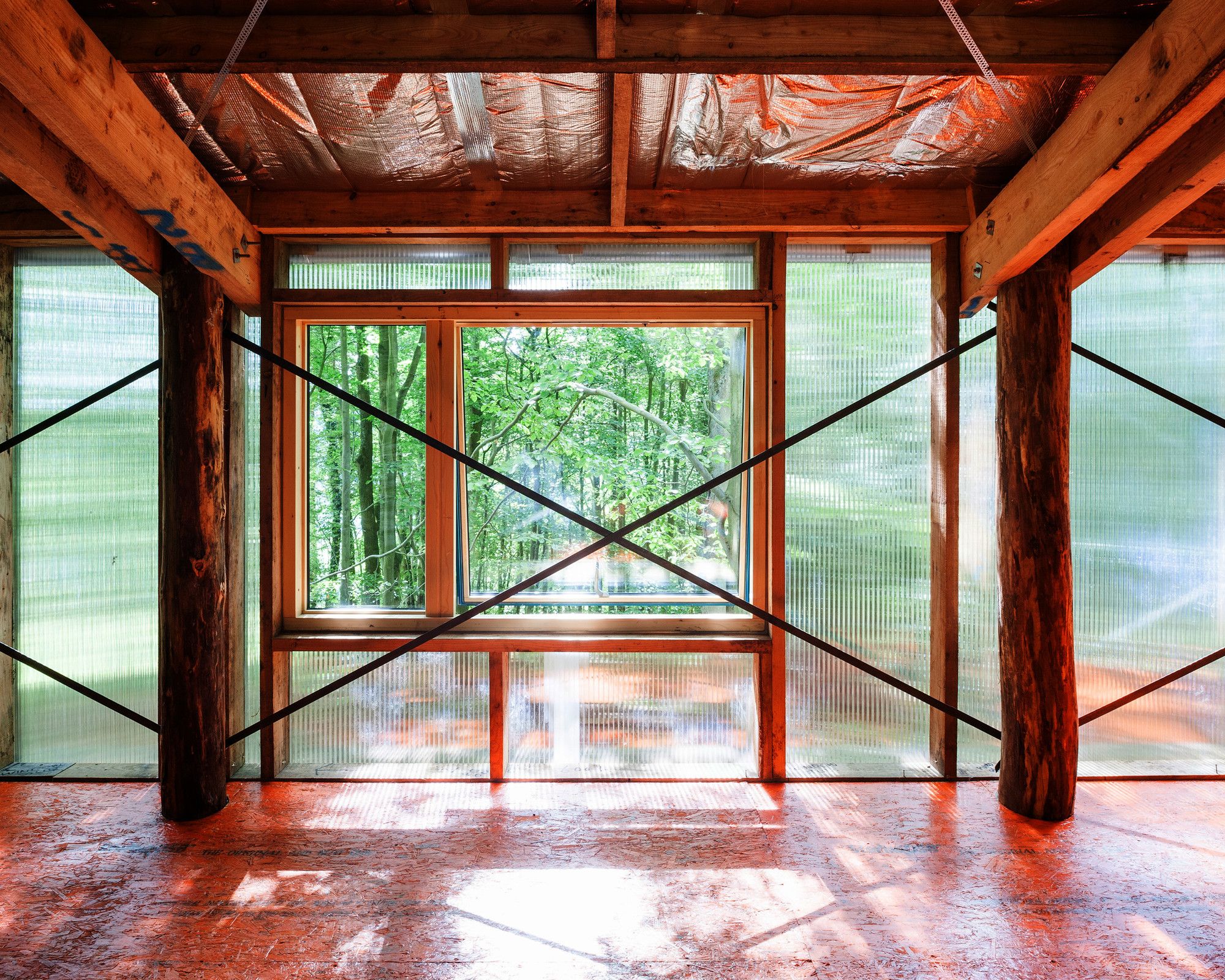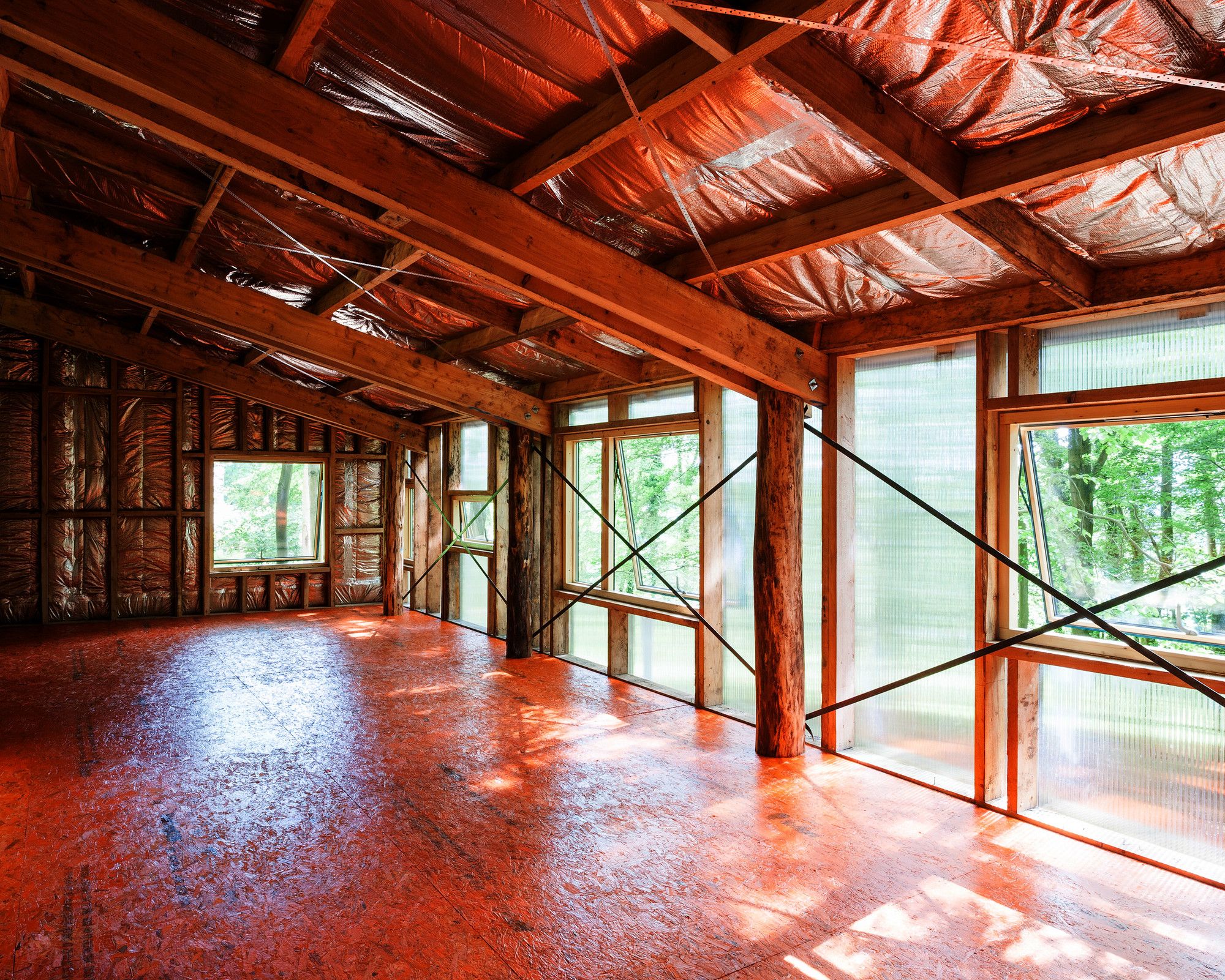Całe drewno zostało ścięte w ciągu dwóch dni z drzew rosnących dokładnie w miejscu planowanego budynku, co bezpośrednio wpłynęło na ostateczną formę studia – materiału nie wystarczyło nawet na pełne obicie elewacji. Fundamenty mieszano ręcznie i ograniczono je do absolutnego minimum, a improwizowane rusztowanie, stworzone na potrzeby budowy, zostało później przekształcone w stały mostek prowadzący do wejścia. Okna pochodzą z odzysku, farba użyta na podłogę była pozostałością z innego projektu, a izolację wykonano z dostępnych resztek materiałów. Budynek ogrzewany jest odpadami drzewnymi z okolicy, co czyni go przykładem zrównoważonej, niskobudżetowej architektury opartej na lokalnych zasobach, samowystarczalności i odpowiedzialnym projektowaniu.