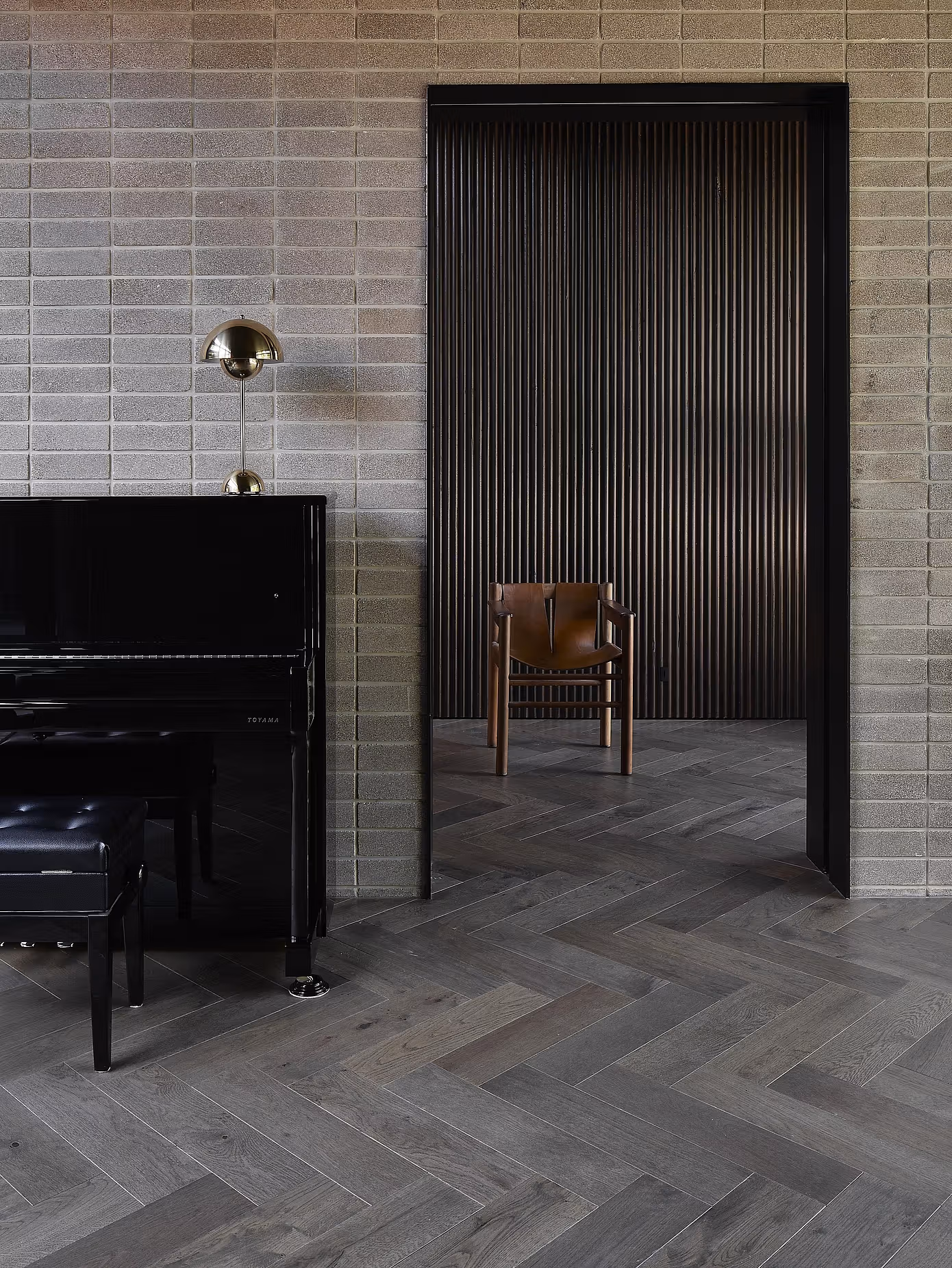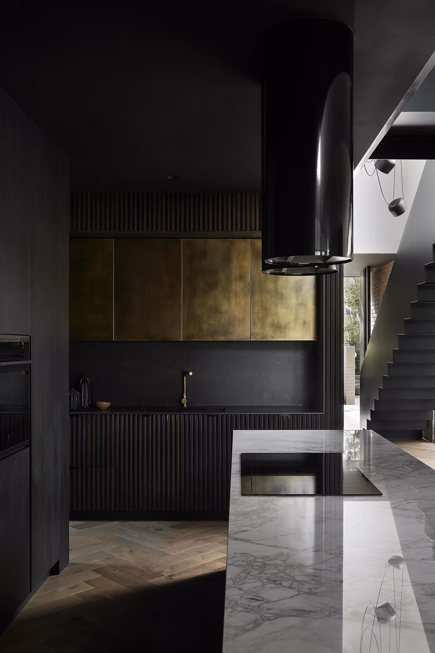 Sercem budynku jest składana stalowa klatka schodowa – rzeźbiarska i precyzyjna, z ostrymi krawędziami, które łapią światło i cień. Ukryte drzwi z żłobionego drewna prowadzą do sypialni głównej i łazienki w odcieniach zieleni, wprowadzając do wnętrz element zaskoczenia i ciepła. Brassowe detale i ciepłe oświetlenie łagodzą surowość materiałów, tworząc atmosferę warsztatowej elegancji – domu, który jest techniczny, ale nigdy chłodny.