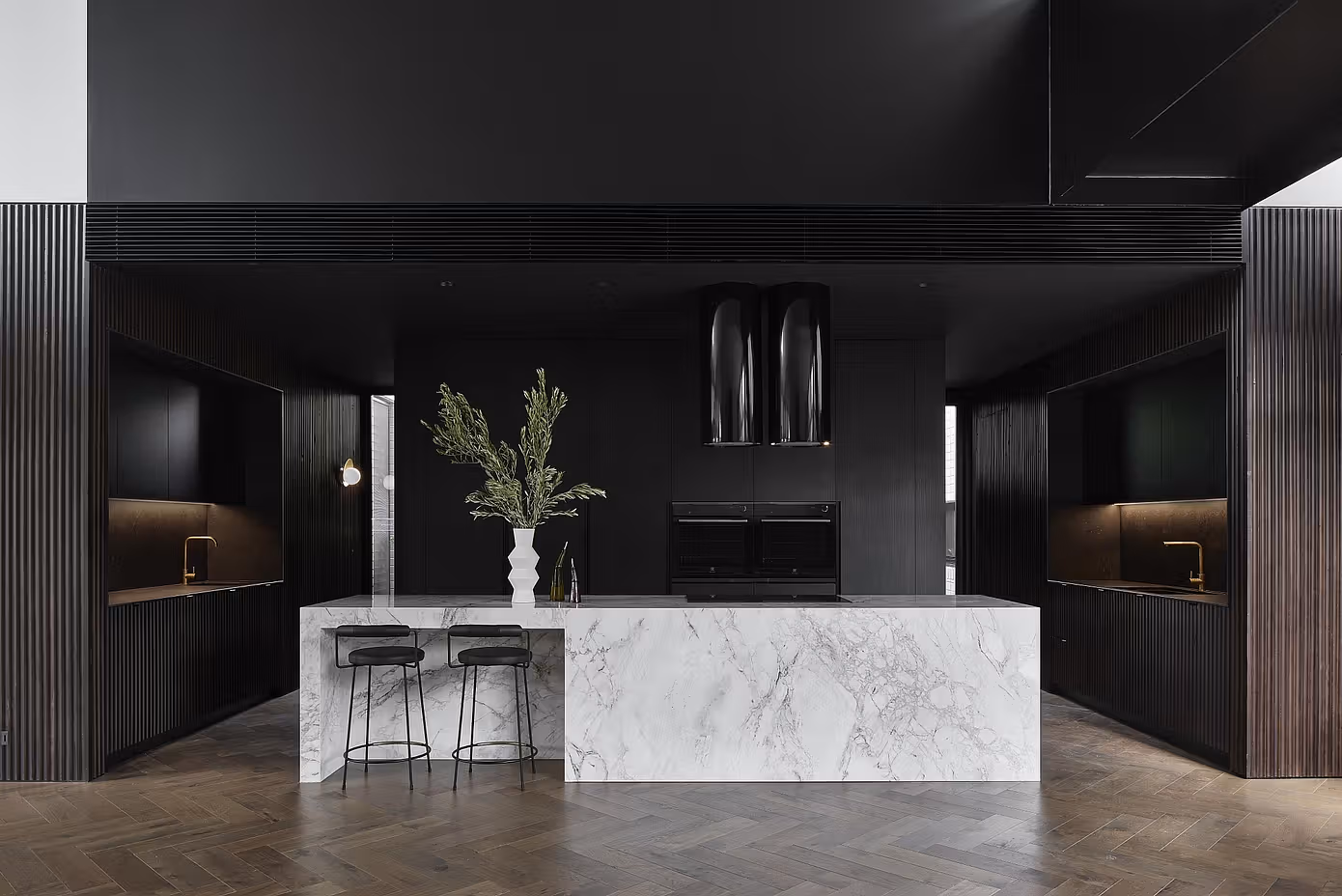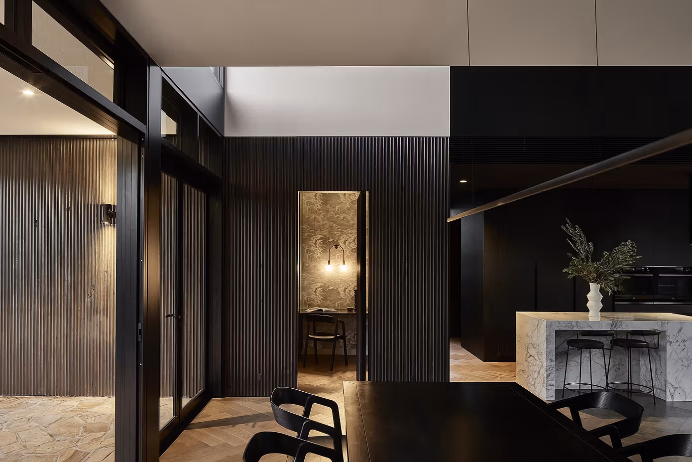 Od strony ulicy Iron Chef House subtelnie nawiązuje do sąsiednich bungalowów – zachowując ich skalę i rytm, ale rezygnując z dosłownego naśladownictwa. Ciemne elewacje z naturalnych materiałów płynnie przechodzą do wnętrza, znosząc wyraźną granicę między zewnętrzem a środkiem. Wnętrza są zaprojektowane z myślą o rodzinie – kuchnia stanowi centrum życia, otwarta na salon i piętro, ale zachowująca akustyczny spokój. Światło wpada przez precyzyjnie rozmieszczone otwory, kierując uwagę na drzewa zamiast sąsiadów. Wieczorem stal i drewno łapią ostatnie promienie słońca, a dom ponownie stapia się z cieniem eukaliptusów – tak jakby zawsze był częścią tego miejsca.