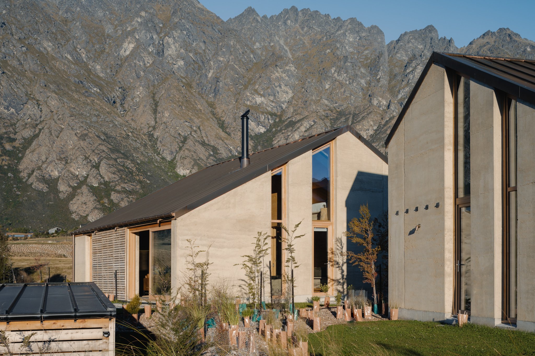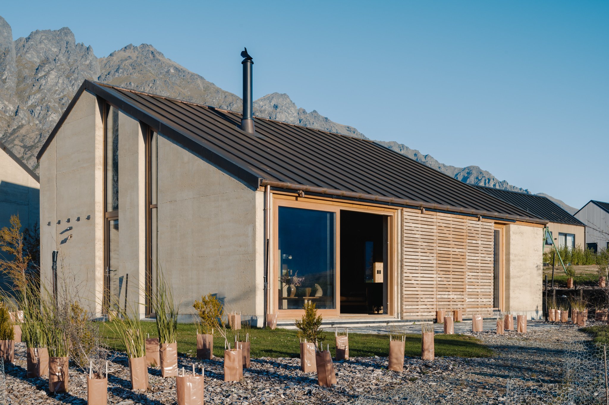 Każdy z domów jest zbudowany z naciskiem na wysoką jakość środowiska zbudowanego, który współczesne materiały, takie jak drewno klejone krzyżowo (CLT), łączą z naturalnym otoczeniem. Konstrukcja zapewnia dobre izolowanie termiczne, co gwarantuje oszczędność energii oraz trwałość przez wiele lat. Wszystkie domy zostały zaprojektowane z myślą o maksymalnym wykorzystaniu naturalnego światła, a okna z drewnianymi ramami tworzą unikalne widoki na okoliczne góry i krajobraz Central Otago. Materiały budowlane wybrano ze względu na ich trwałość, uczciwość i integralność. Prefabrykowane panele CLT, zbudowane w fabryce w Nelson, umożliwiają szybki i efektywny montaż, a także minimalizują wpływ na środowisko.