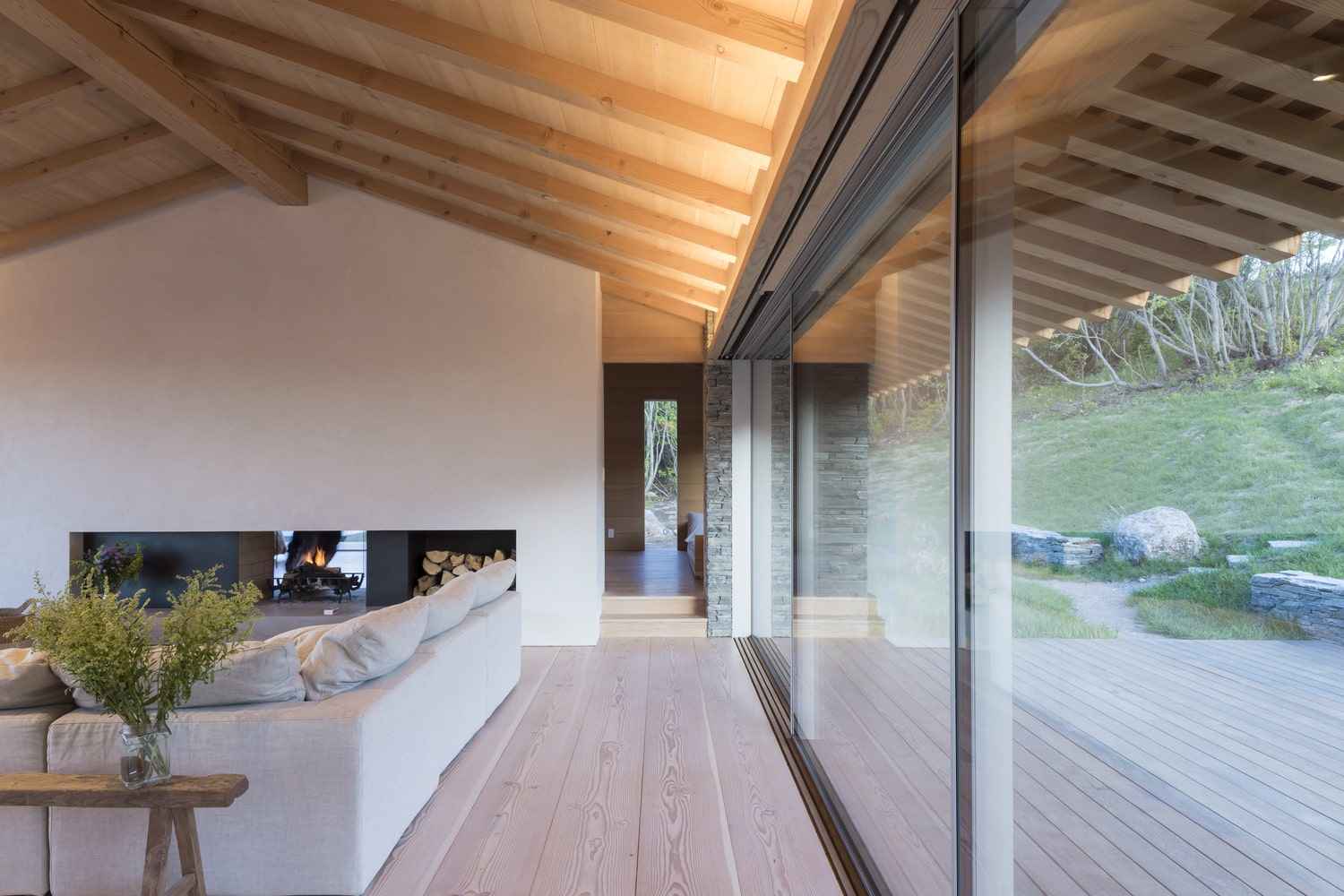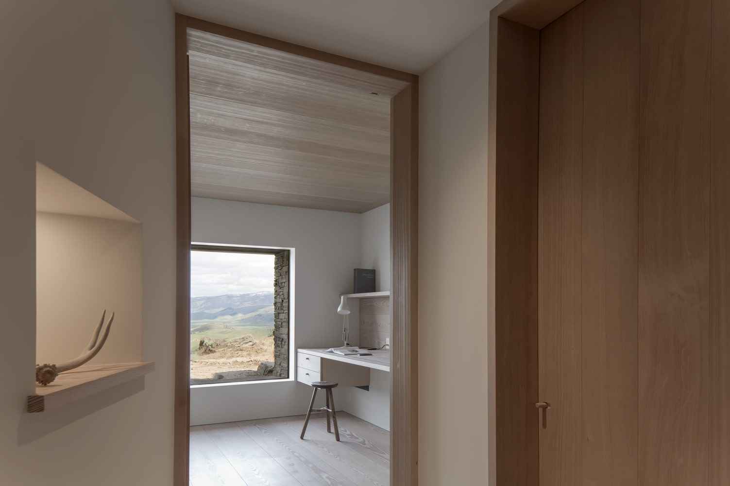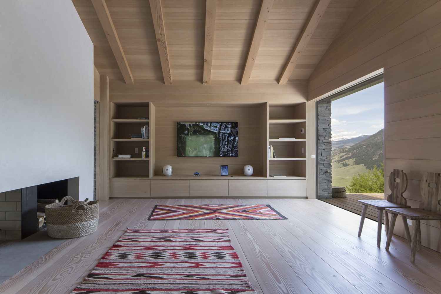 Wnętrze Jackson Hole House to połączenie ciepła, prostoty i elegancji. Starannie dobrana paleta barw, naturalne drewno i kamień tworzą przestrzeń, która oddziałuje na wszystkie zmysły. Tu liczy się doświadczenie – zapach drewna, chłód kamiennej podłogi, szorstkość metalowych poręczy i delikatny powiew wiatru wpadający przez rozsuwane szklane ściany. Architekci stworzyli dom, który nie tylko wygląda, ale również „żyje” w rytmie przyrody. To miejsce, w którym nowoczesna stodoła spotyka klasyczną górską rezydencję, tworząc przestrzeń autentyczną, zmysłową i ponadczasową.
