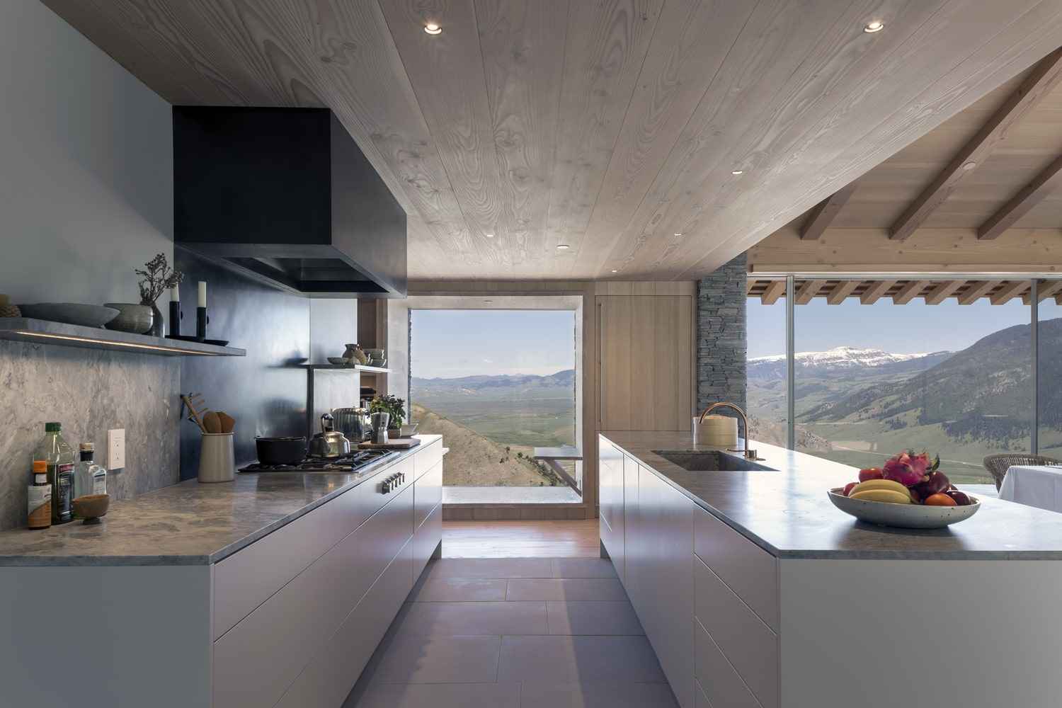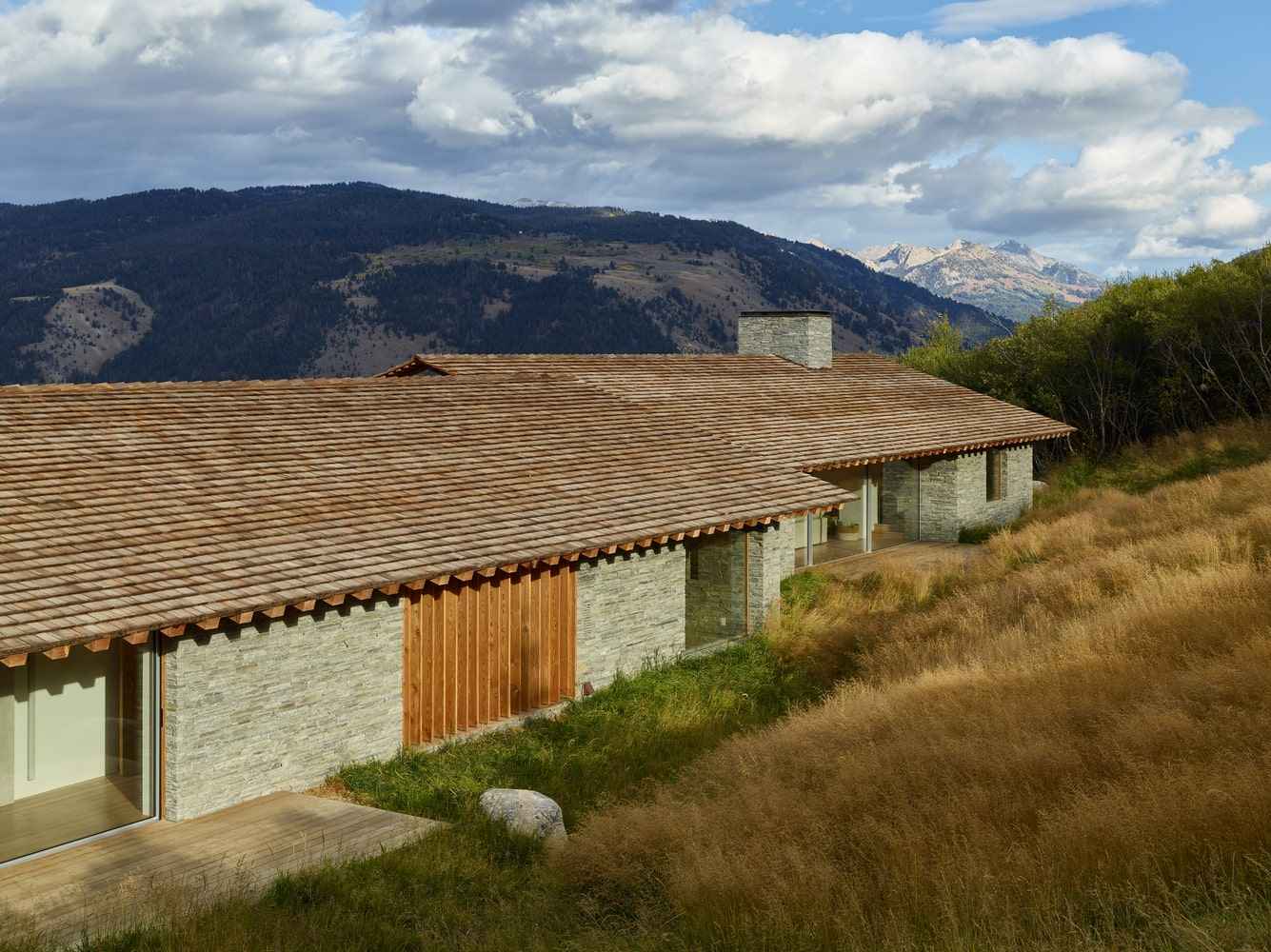 Bryła domu została zaprojektowana z myślą o maksymalnym wykorzystaniu naturalnego światła i relacji z terenem. Dach z posrebrzanego cedru, kamienne elewacje oraz elementy z odzyskanego drewna idealnie komponują się z surowym krajobrazem Gór Skalistych. W miarę upływu lat kamieniarka i drewno pokryją się patyną i porostami, dzięki czemu budynek jeszcze bardziej zrośnie się z otoczeniem. Detale wykonane z naturalnych materiałów – od kamienia po metal – podkreślają rzemieślniczy charakter projektu i przywołują na myśl autentyczną atmosferę górskiego domu, w duchu nowoczesnej stodoły.