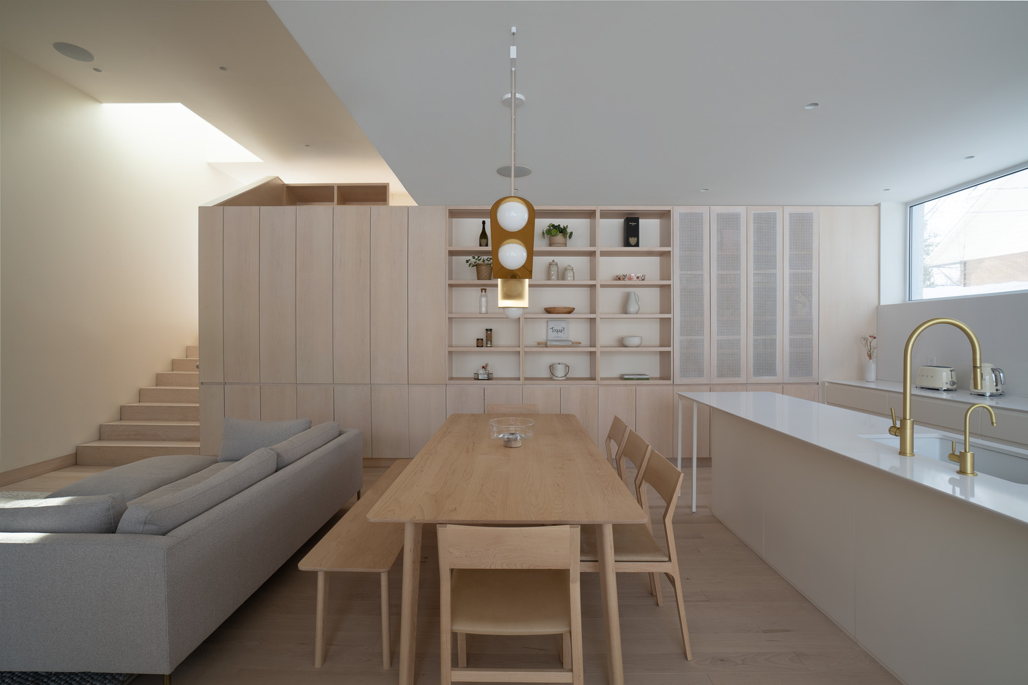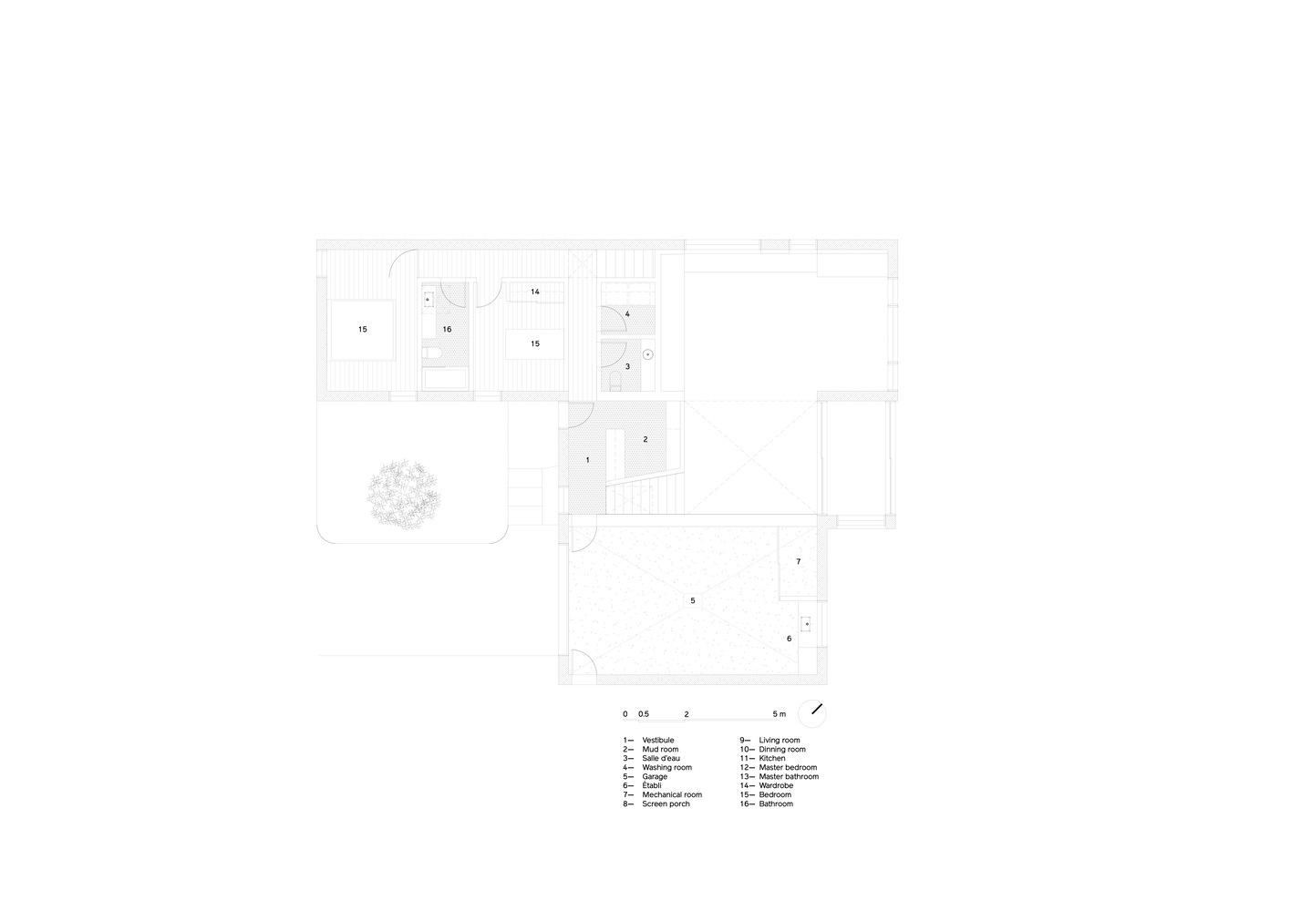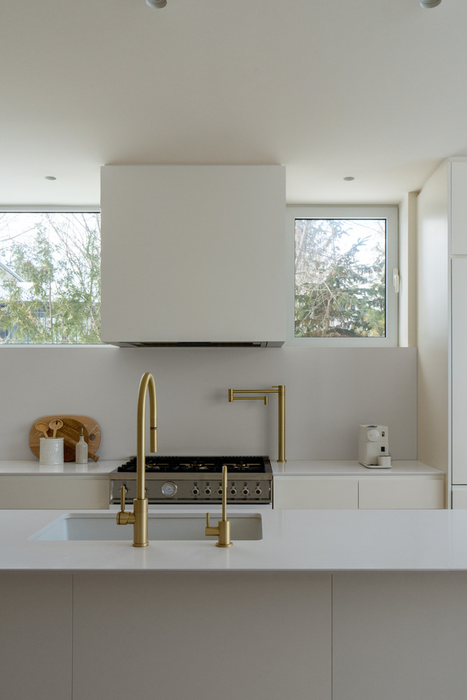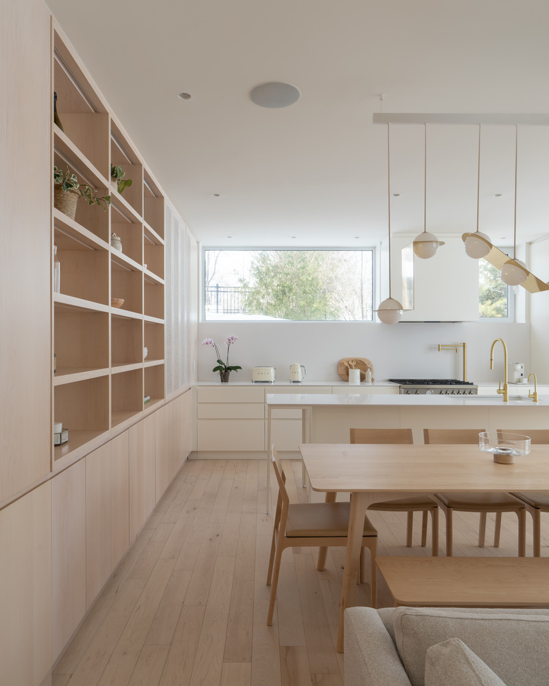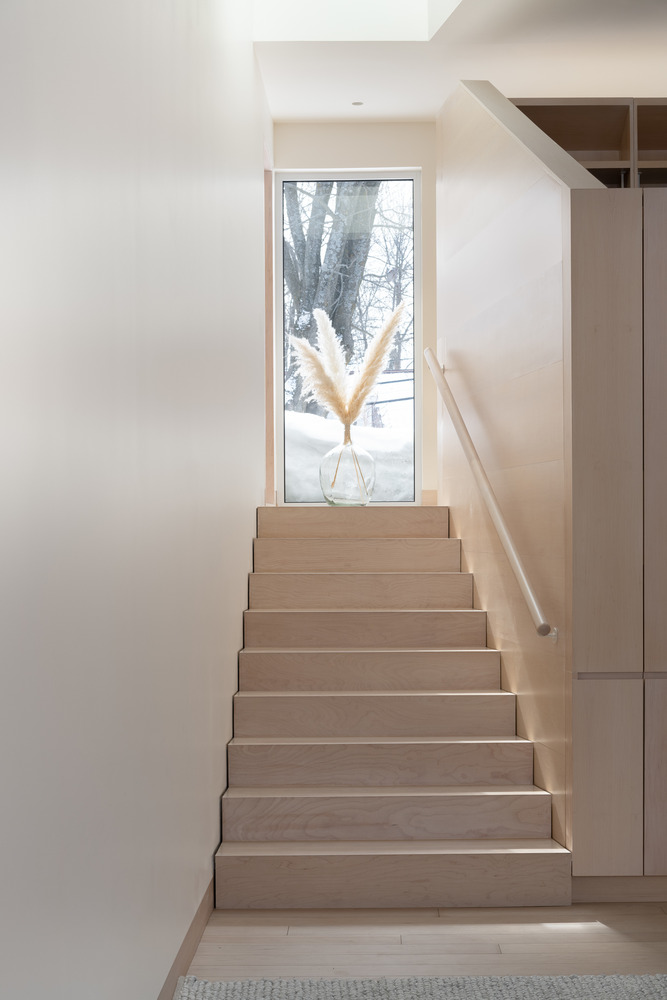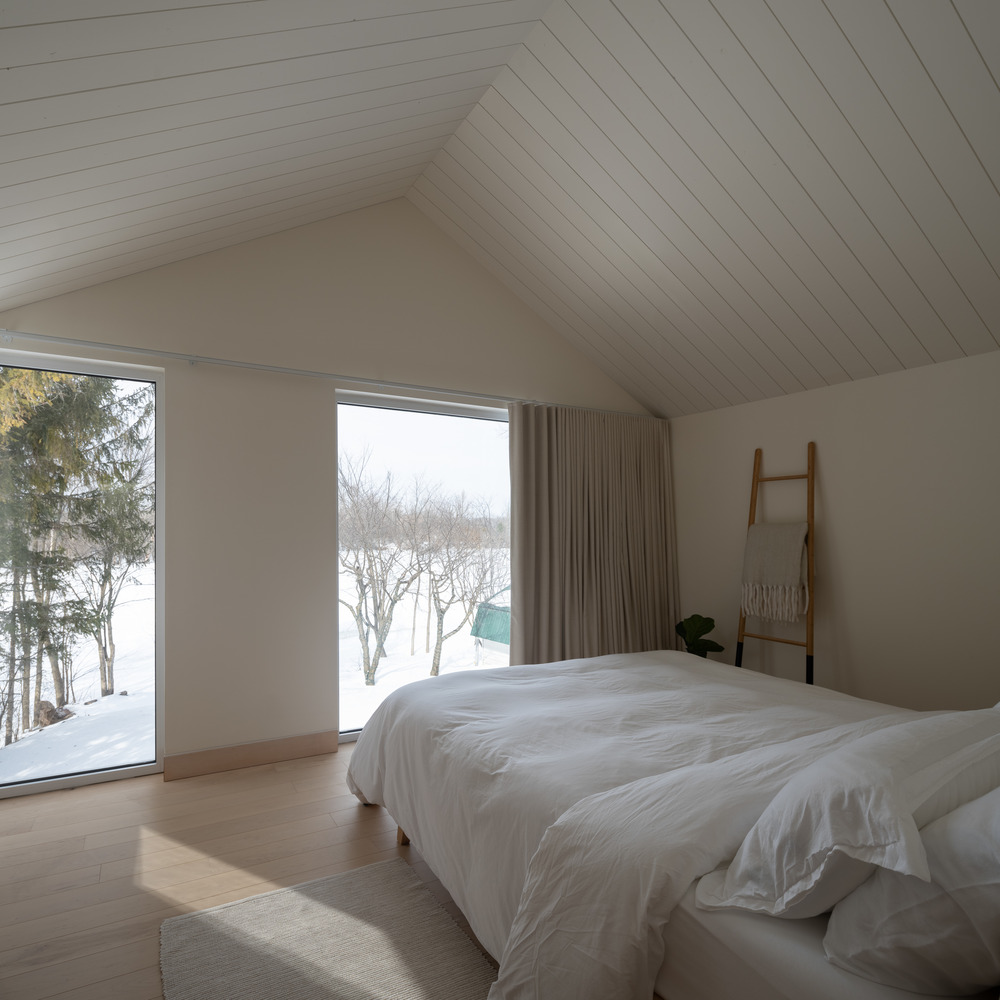 Każda z trzech brył domu pełni odmienną funkcję. Kubatura równoległa do ulicy mieści garaż, hol wejściowy oraz przestrzenie dzienne, podczas gdy dwie prostopadłe do niej bryły zostały przeznaczone na strefy wypoczynku. Główne wejście znajduje się w miejscu ich przecięcia. Pierwsze piętro, zlokalizowane najbliżej ulicy, zawiera dwie sypialnie i łazienkę. Z kolei wyższa kubatura mieści główny apartament – przestrzeń prywatną i reprezentacyjną z katedralnym dachem oraz panoramicznym widokiem na rzekę Mille-Îles.