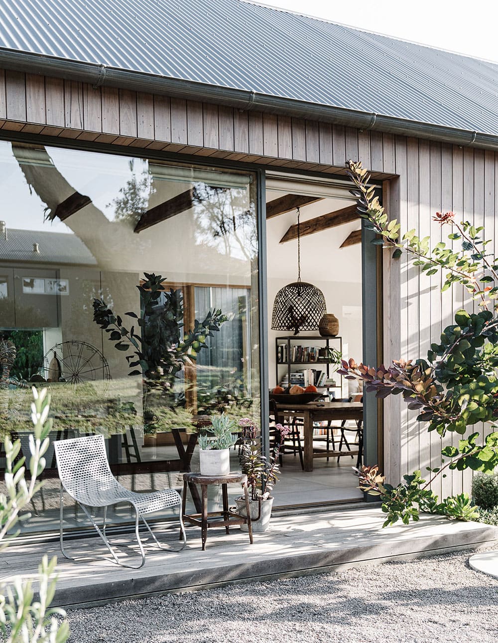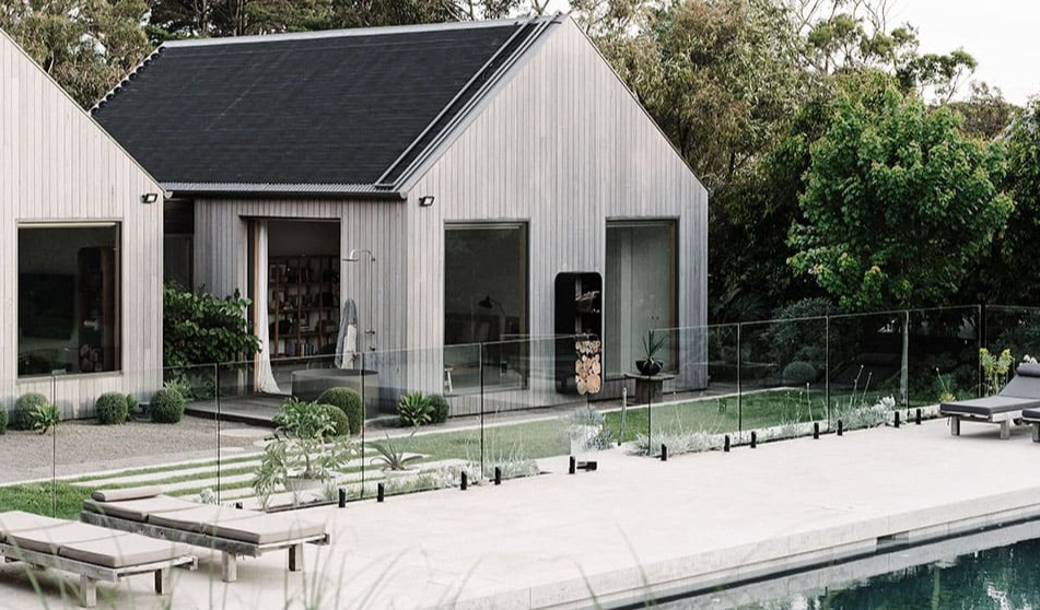 Bryła budynku nawiązuje do architektury stodoły, ale została zinterpretowana na nowo – w duchu współczesnego minimalizmu i australijskiego luzu. Duże przeszklone ściany otwierają wnętrza na ogród i krajobraz nadmorski, zapewniając jednocześnie doskonałe doświetlenie. Wnętrza są jasne, przytulne, funkcjonalne i pełne naturalnych materiałów – drewna, kamienia i tkanin w stonowanych kolorach. Dom posiada przestronny taras i prywatny basen, które są naturalnym przedłużeniem strefy dziennej i zachęcają do spędzania czasu na świeżym powietrzu.