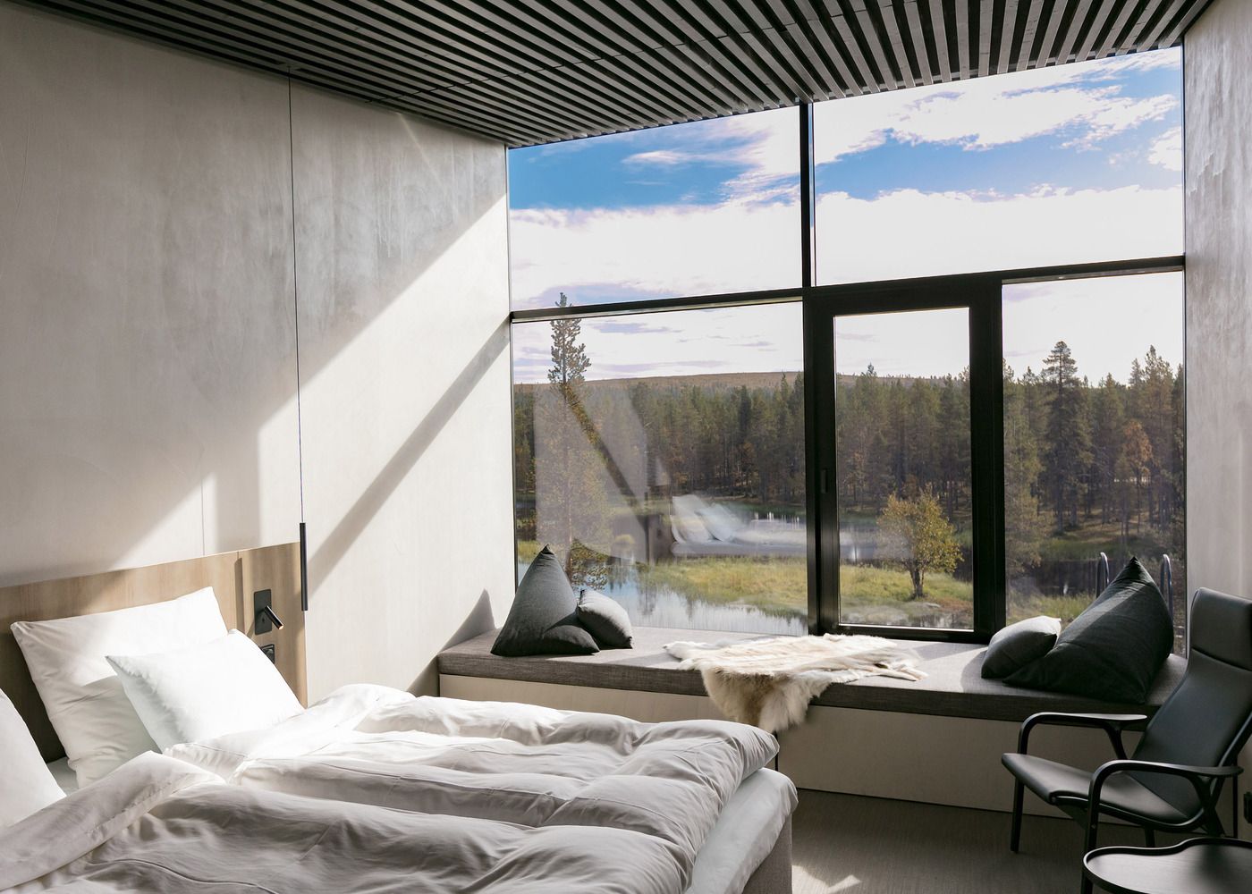 Nowe apartamenty „Sky-Suite” powstały właśnie z myślą o tym, by dodatkowo wzmocnić to niezwykłe doświadczenie. Wnętrze apartamentów jest neutralne i proste. Podkreśla to tym samym niesamowite kolory lapońskiego nieba. Pod oknem ustawiono jeszcze wygodne siedzisko, na którym można spędzić niejedną noc.