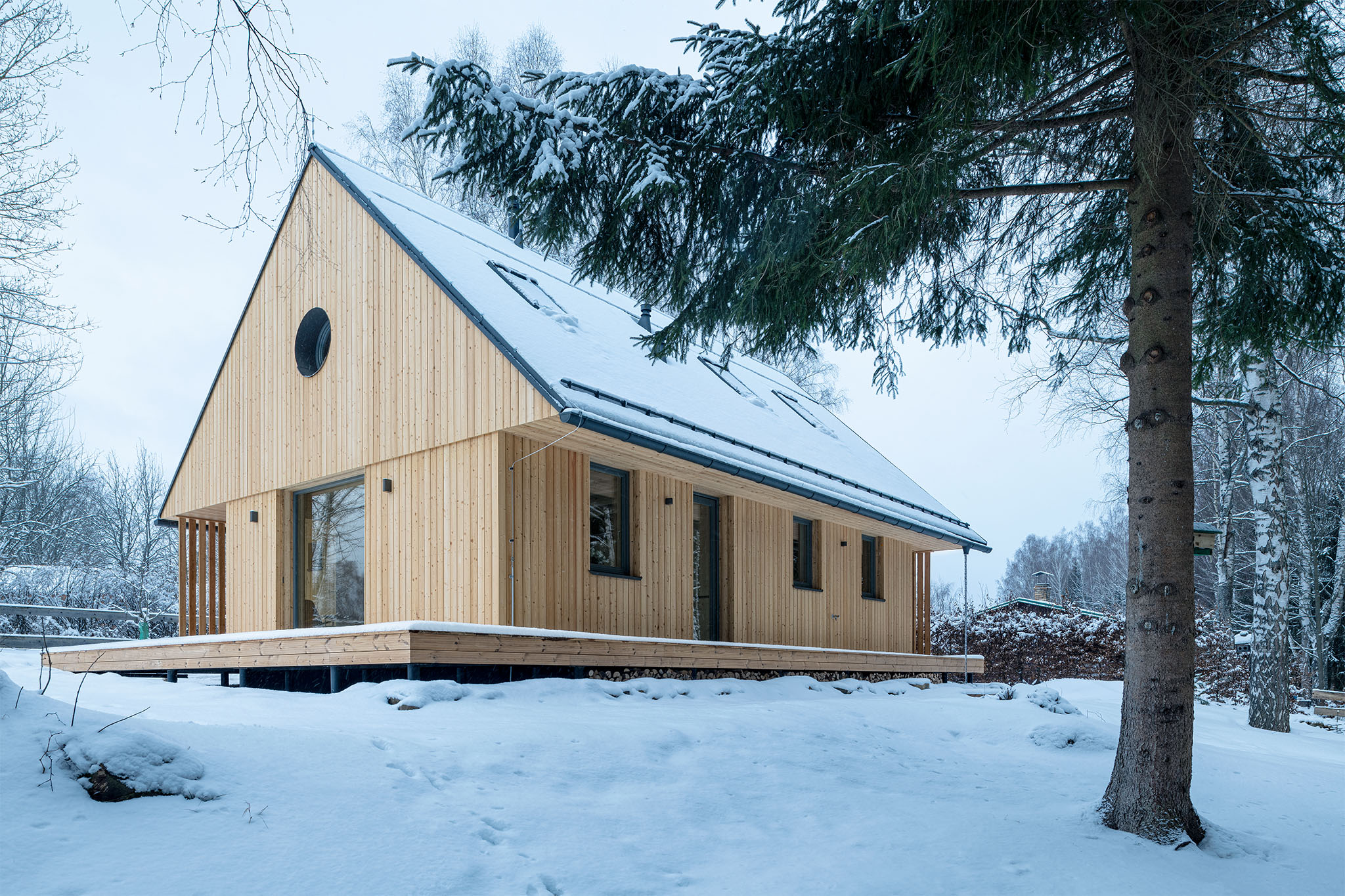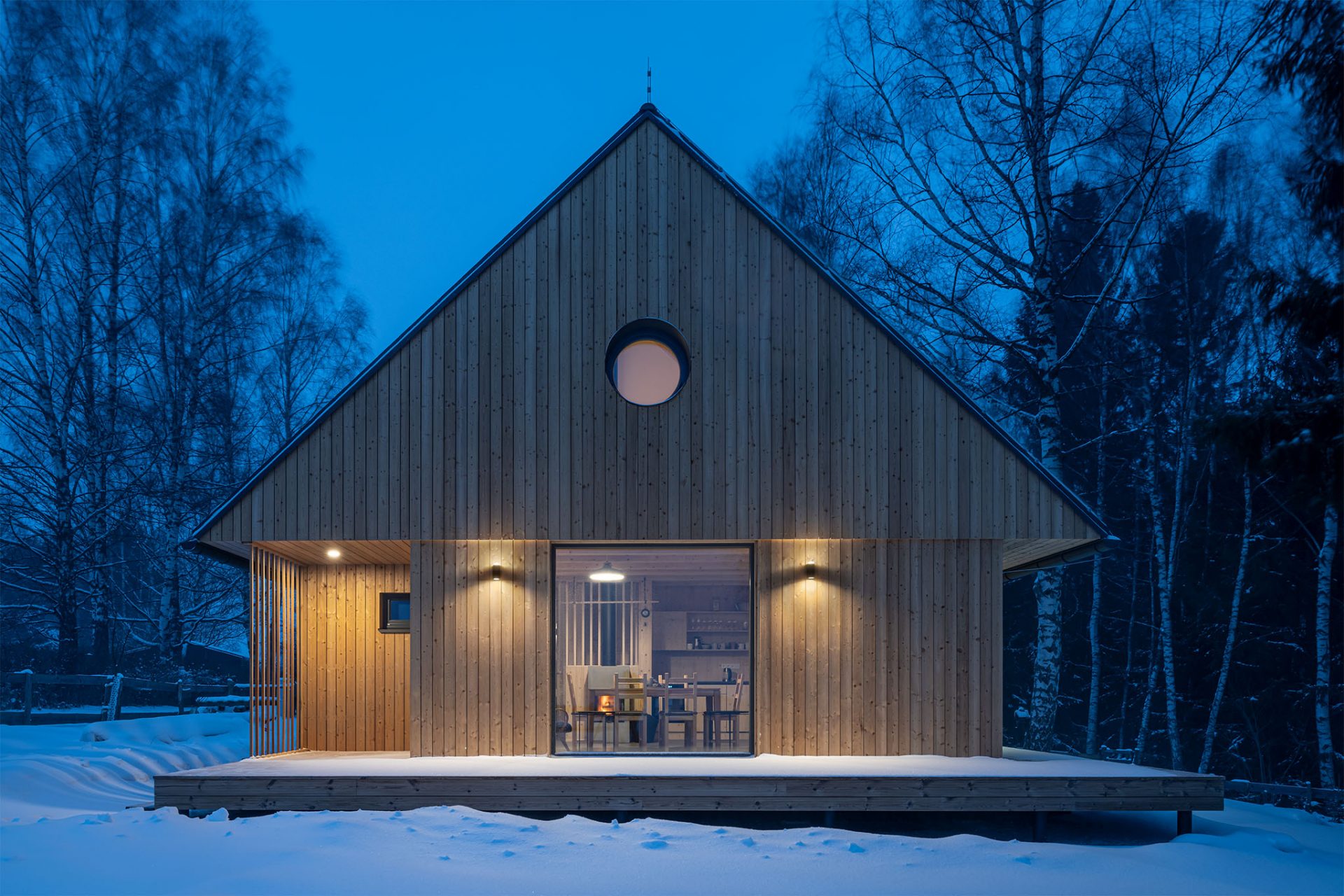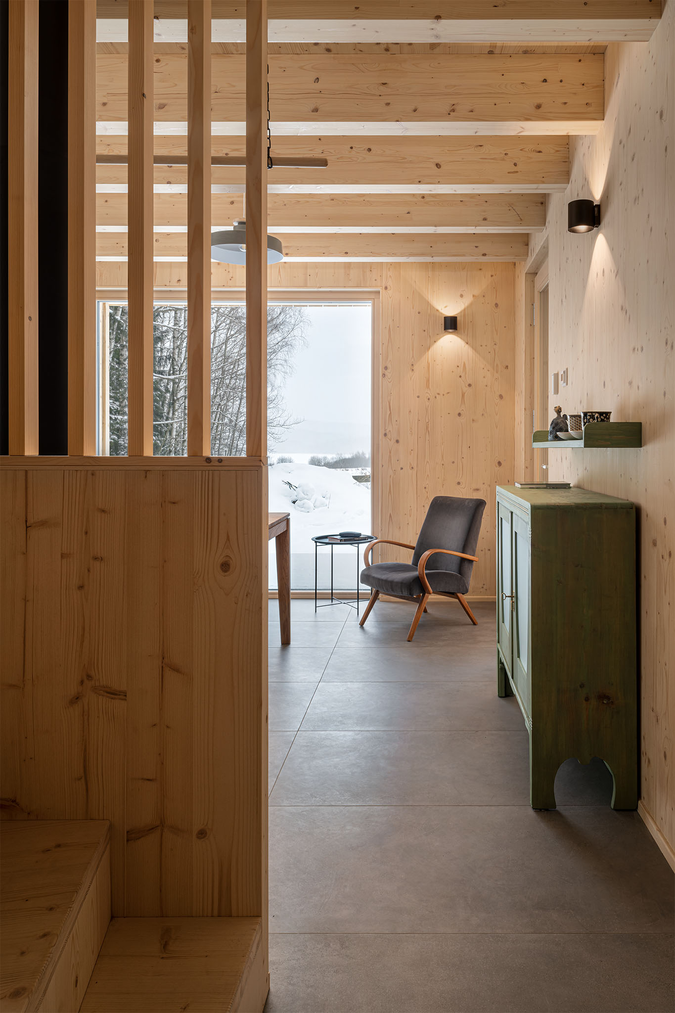 Chata wyróżnia się prostą, ale elegancką formą. Do budowy użyto naturalnych materiałów, takich jak drewno i kamień, co pozwoliło uzyskać efekt harmonii z otaczającym krajobrazem. Duże przeszklenia otwierają wnętrze na widok jeziora, a taras staje się przedłużeniem salonu, umożliwiając bezpośredni kontakt z naturą.