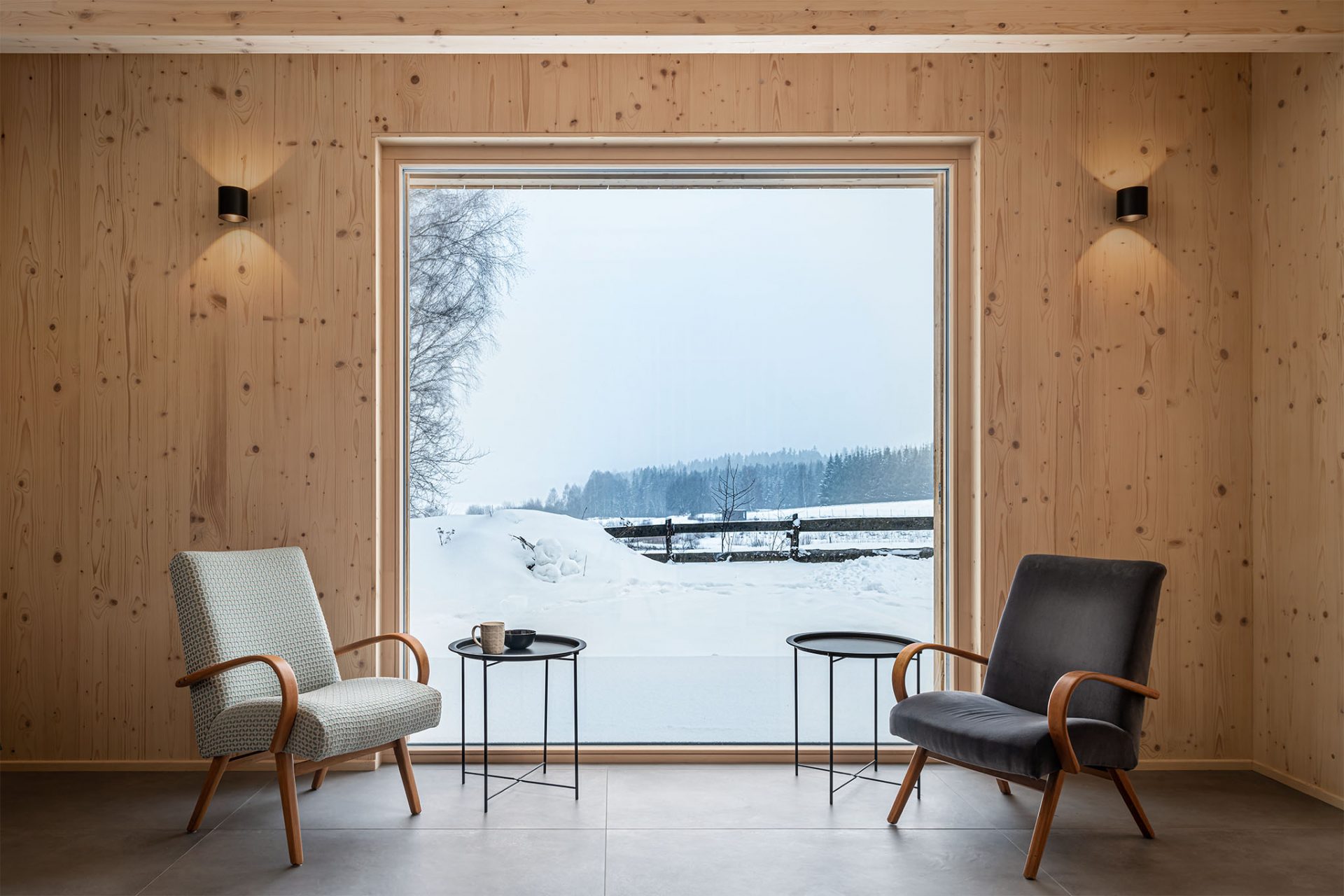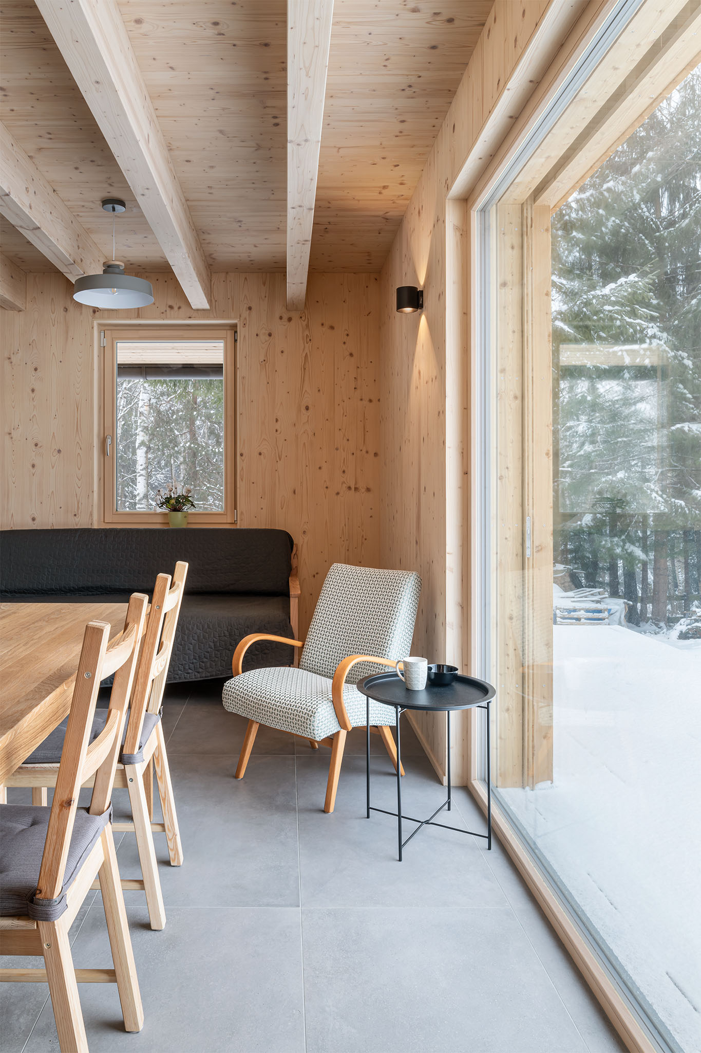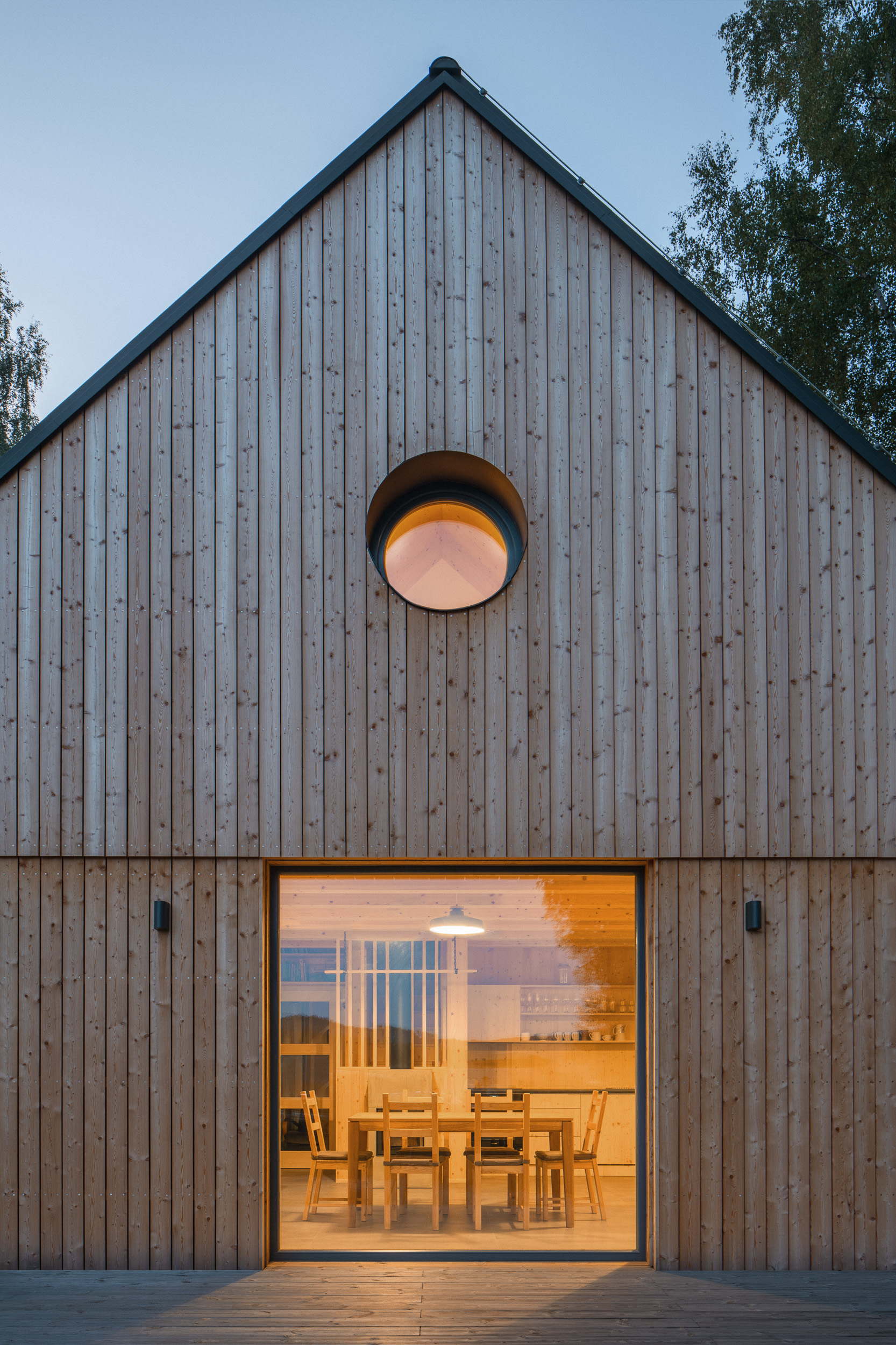 Chata wyróżnia się prostą, ale elegancką formą. Do budowy użyto naturalnych materiałów, takich jak drewno i kamień, co pozwoliło uzyskać efekt harmonii z otaczającym krajobrazem. Duże przeszklenia otwierają wnętrze na widok jeziora, a taras staje się przedłużeniem salonu, umożliwiając bezpośredni kontakt z naturą.