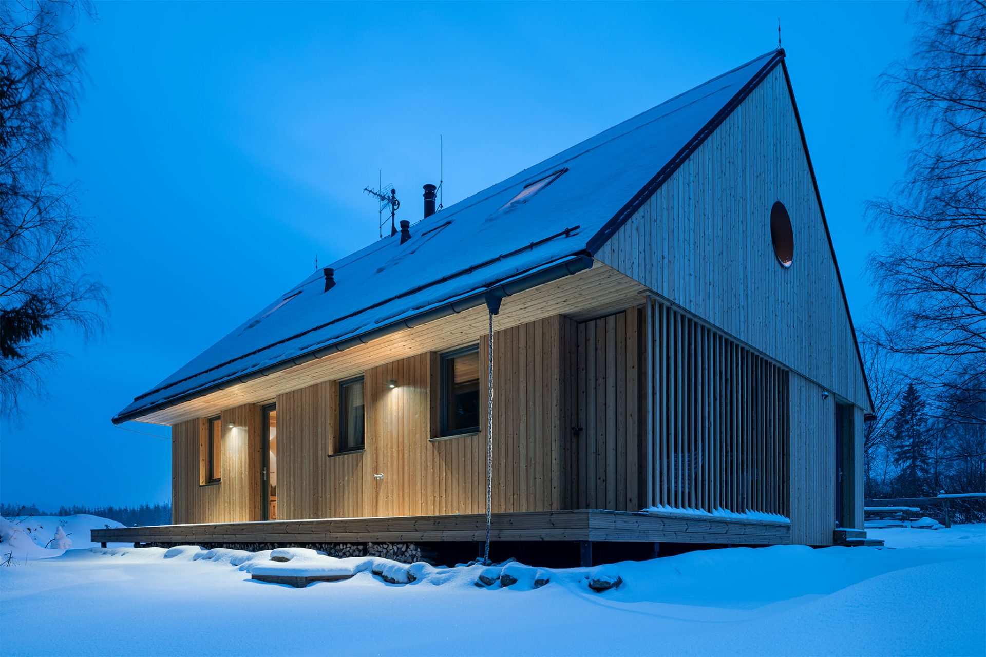Projekt uwzględnia nowoczesne technologie proekologiczne, takie jak panele fotowoltaiczne, systemy odzyskiwania wody deszczowej oraz energooszczędne rozwiązania grzewcze. Dzięki temu Jezerní Chata Lipno jest nie tylko estetyczna, ale również przyjazna dla środowiska. Ten projekt to hołd dla prostoty, elegancji i zrównoważonego stylu życia.