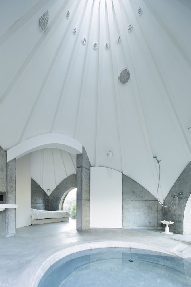W Ito, w prefekturze Shizuoka w Japonii, architekt Issei Suma stworzył niezwykły budynek składający się z pięciu chat o różnych wymiarach i wysokości, które harmonijnie wpisują się w krajobraz szczytu górskiego. Każda z chat nawiązuje swoją formą do dawnego wierzchołka wzgórza, zachowując jednocześnie minimalistyczną estetykę. Budynek o powierzchni około 100 m² jest całkowicie wykonany z betonu – ściany, podłogi, a nawet meble odzwierciedlają surowość materiału i prostotę formy. Projekt, który można przyrównać do nowoczesnej stodoły, łączy funkcjonalność z nowatorskim podejściem architektonicznym, tworząc spójną całość, w której prostota współgra z otoczeniem.