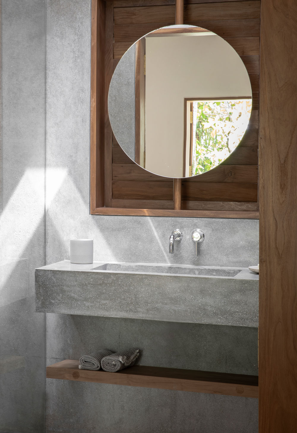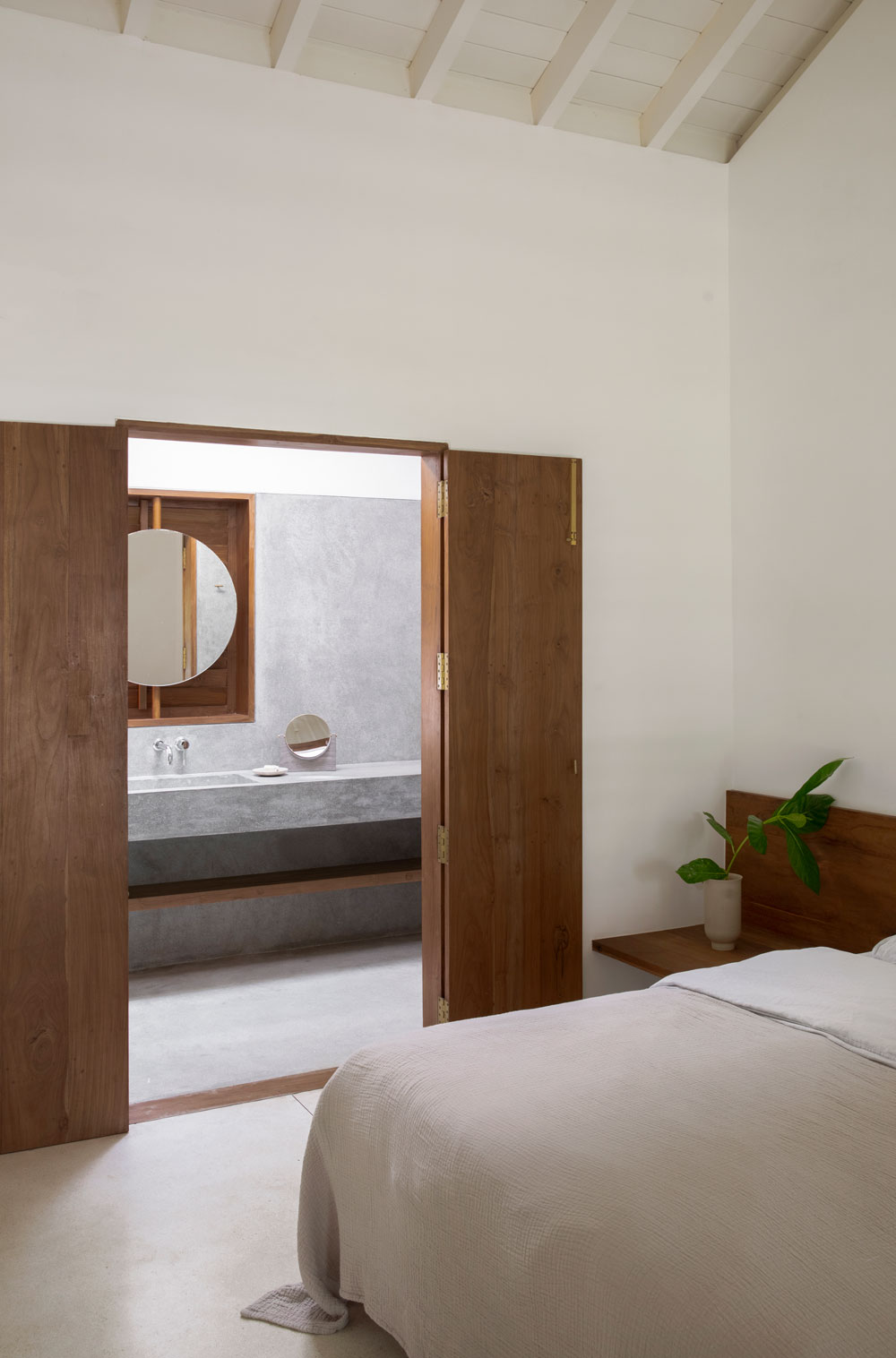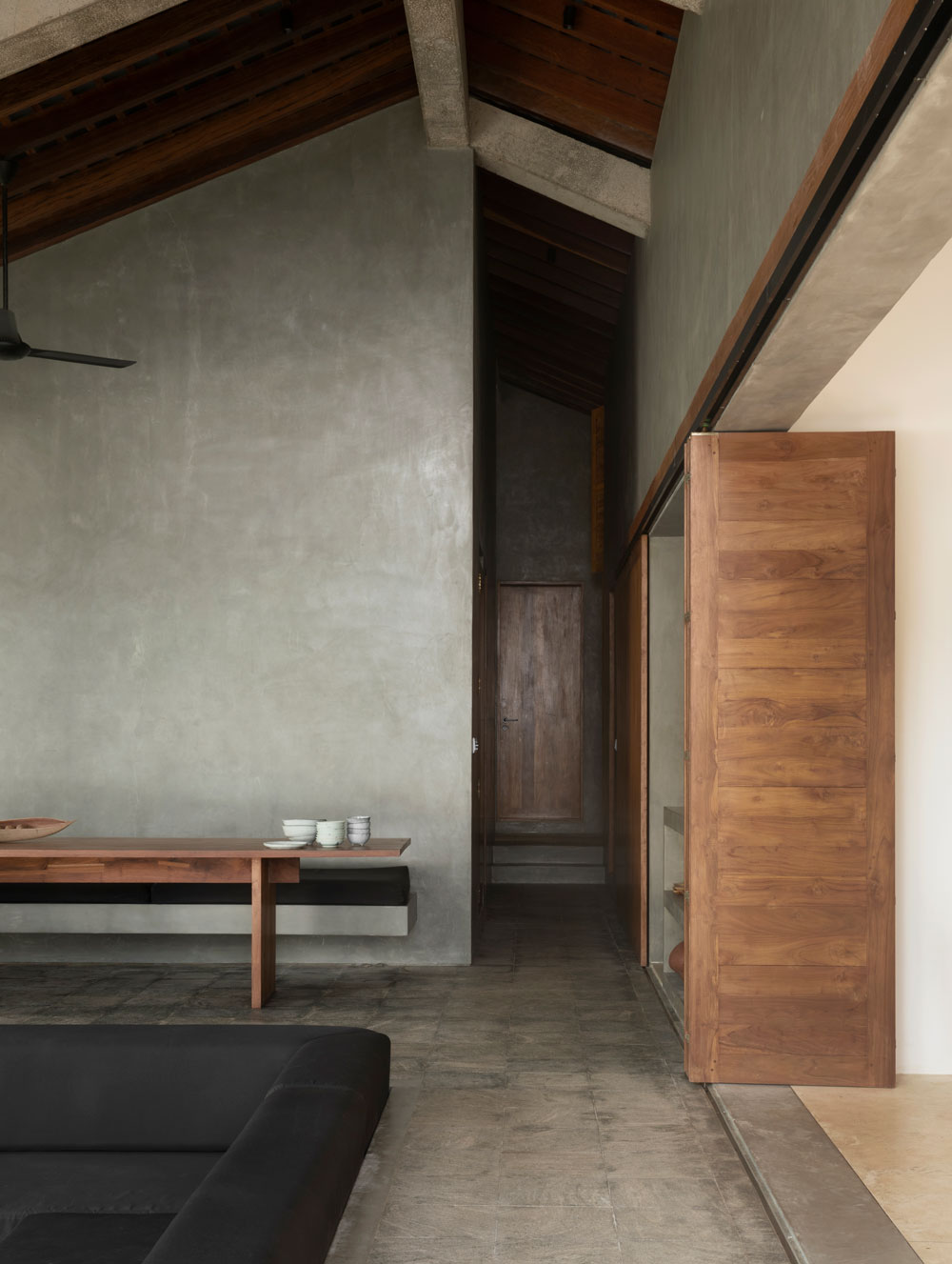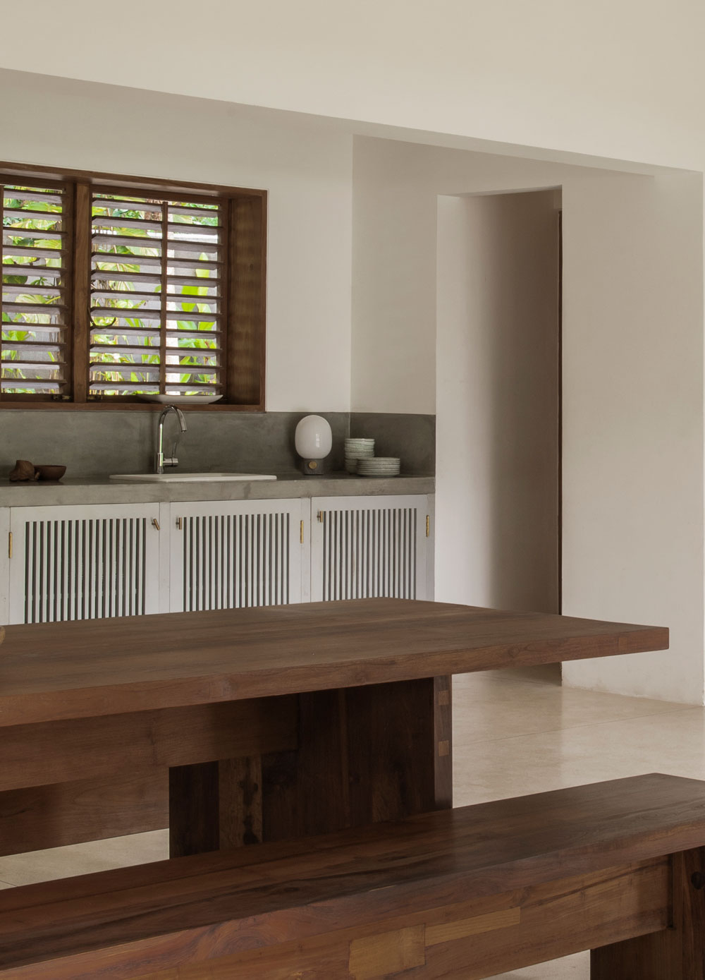 K House składa się z dwóch brył: East House i West House, luźno rozplanowanych w układzie litery L. Ich forma przypomina nowoczesną stodołę – z surowymi betonowymi elewacjami, spadzistymi dachami i przesuwnymi drewnianymi żaluzjami, które otwierają się na tropikalny ogród i basen infinity. East House usytuowany jest bliżej plaży, oferując panoramiczne widoki na ocean. West House znajduje się głębiej w ogrodzie, zapewniając więcej prywatności i kameralną atmosferę.