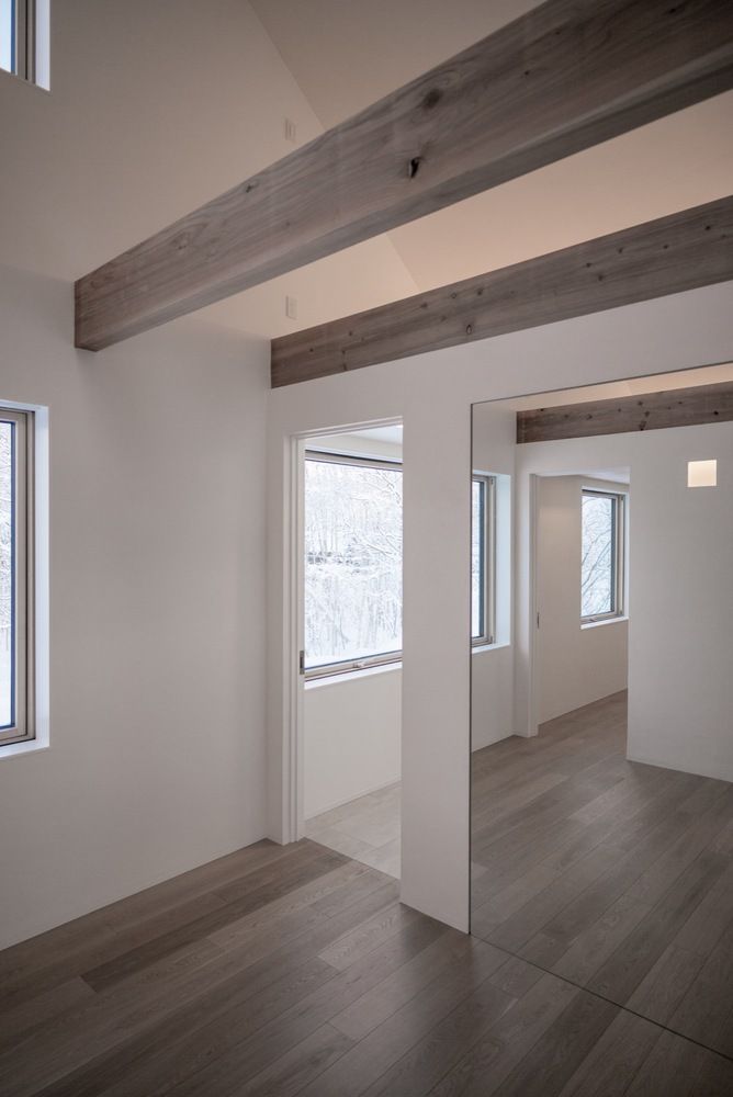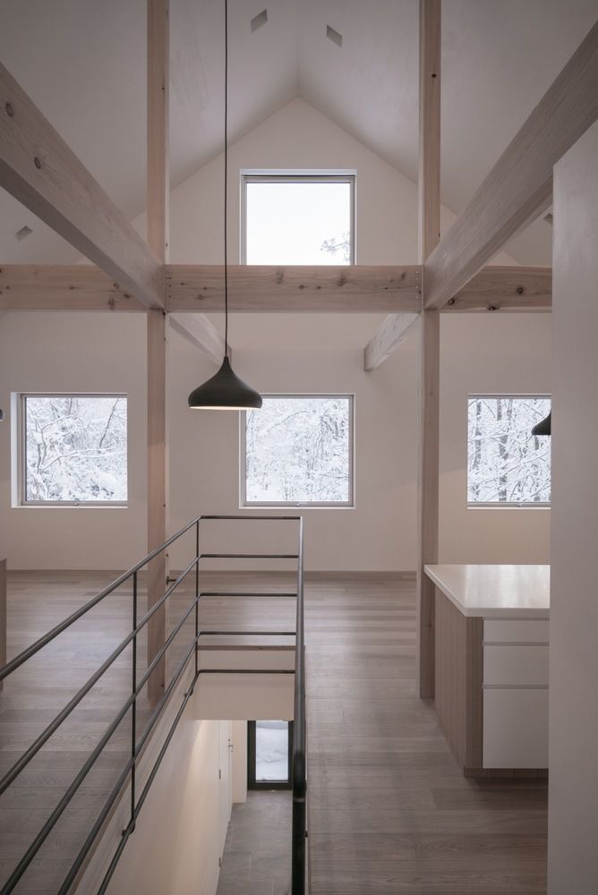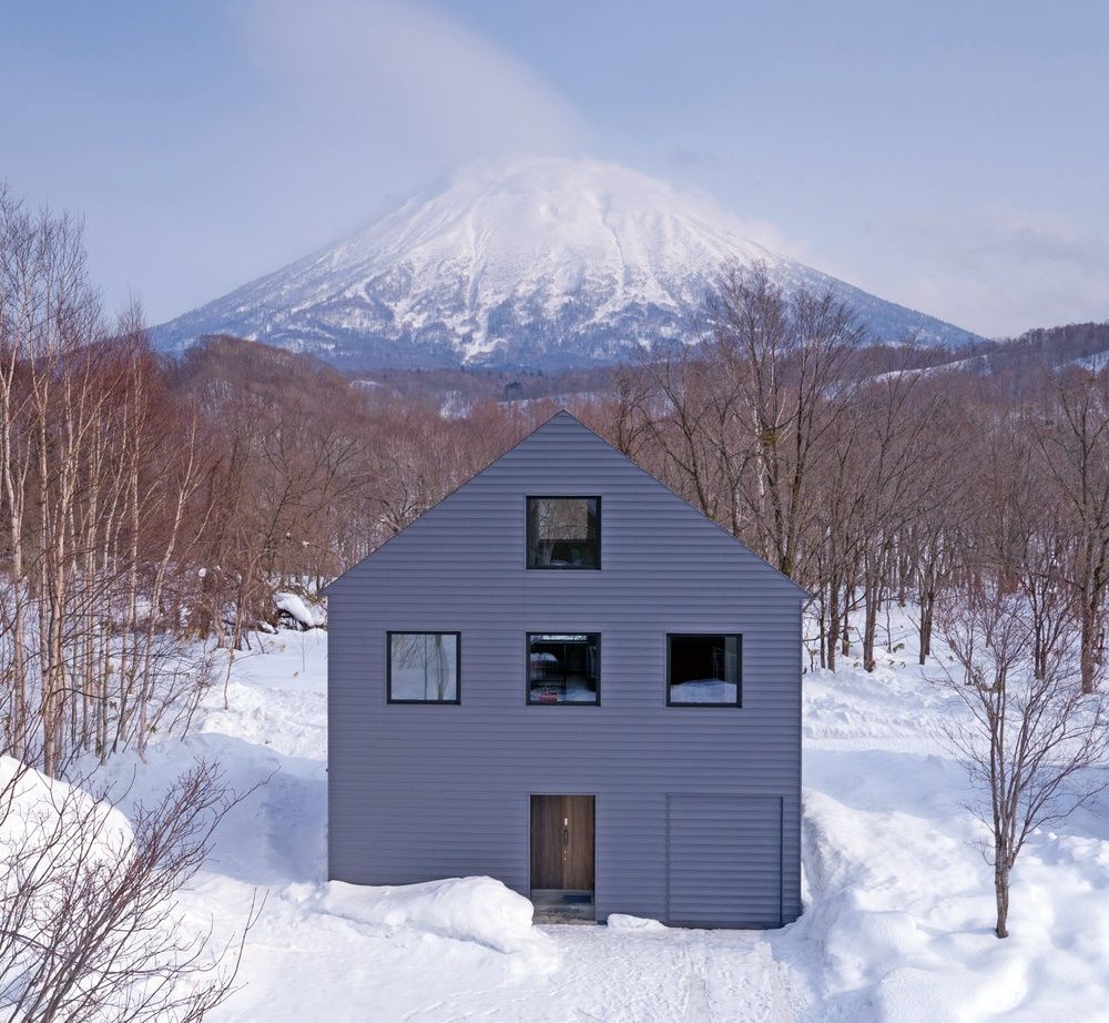 Architekci zaprojektowali prosty, energooszczędny dom w stylu nowoczesnej stodoły, idealny na zimowy wypoczynek. Głównym założeniem było zapewnienie minimalnej konserwacji i stworzenie przestrzeni, która eksponuje wschodni widok na wulkan Yotei. Brak zainteresowania sąsiadującymi budynkami podkreśla harmonijne połączenie domu z naturalnym otoczeniem.