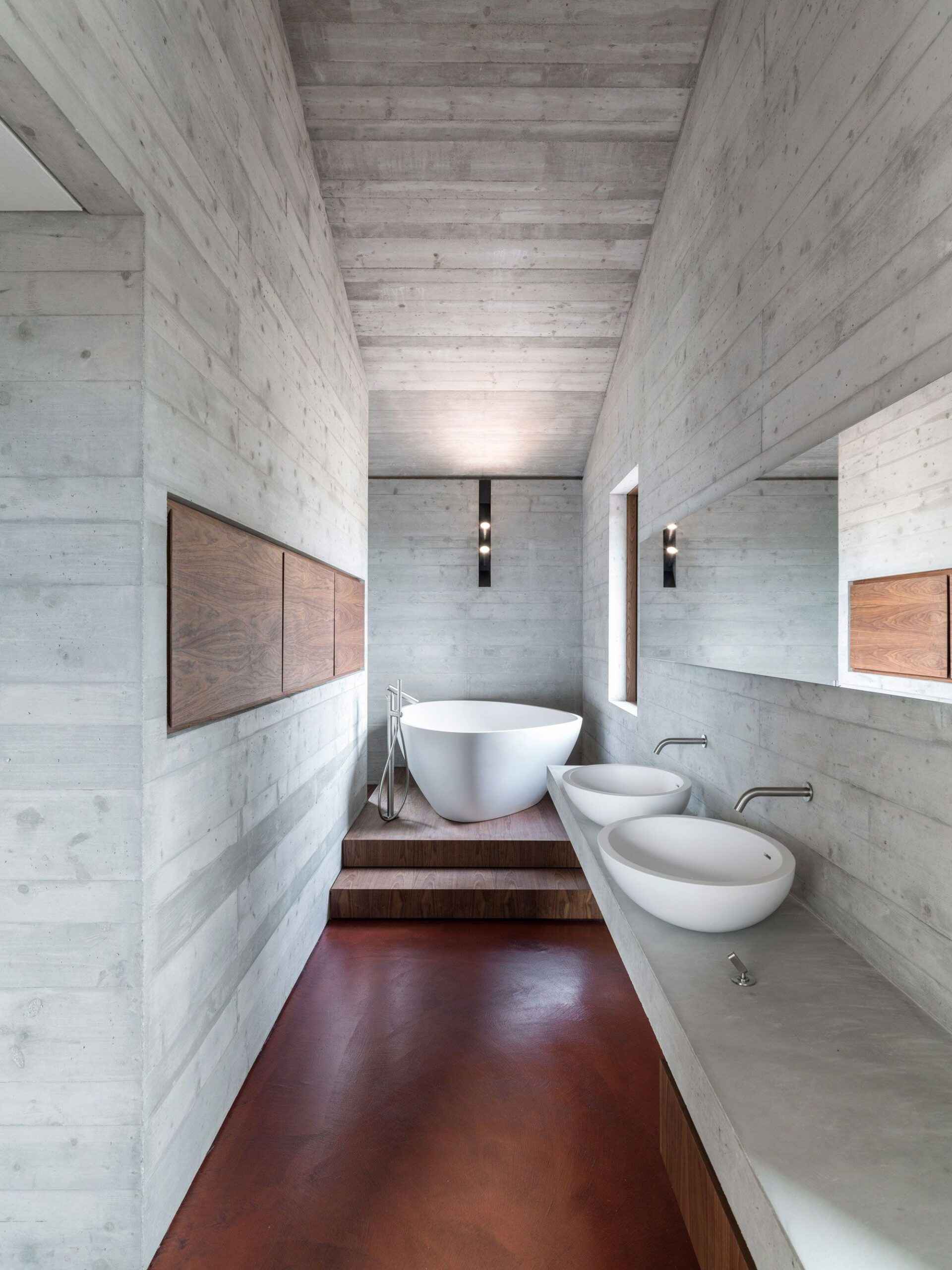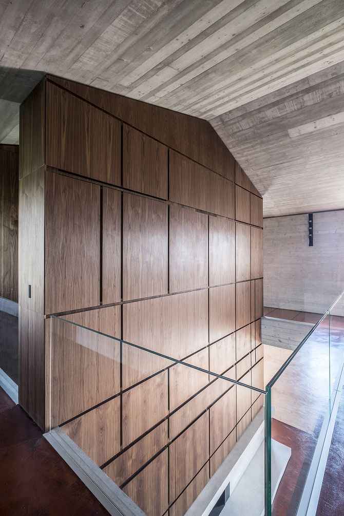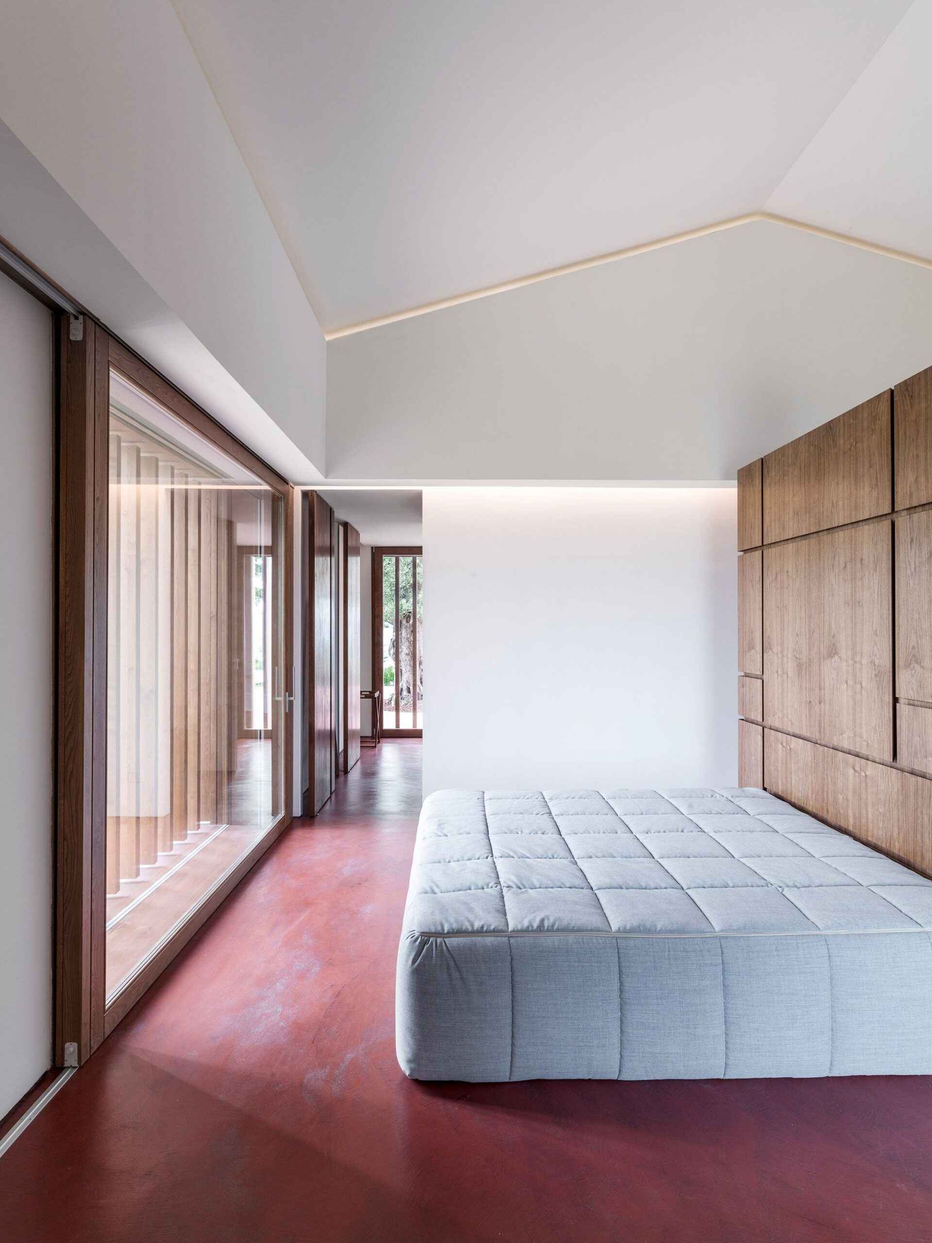 Funkcjonalny układ wnętrz rozłożono na kilku poziomach. Nowe podpiwniczenie mieści wejście, garaż, galerię oraz prywatne kino, a korytarz łączy główną bryłę z przybudówką, w której zaprojektowano strefę wellness z siłownią i spa. Na parterze znajdują się kuchnia, jadalnia i salon, natomiast wyżej – sypialnia główna i pokoje gościnne. Wnętrza wykończono odsłoniętym betonem, czerwonymi betonowymi posadzkami oraz meblami z drewna orzechowego, co nadaje im surowy, lecz elegancki charakter. Duże przeszklenia sprawiają, że naturalne światło i krajobraz stają się integralną częścią tego nowoczesnego włoskiego domu.