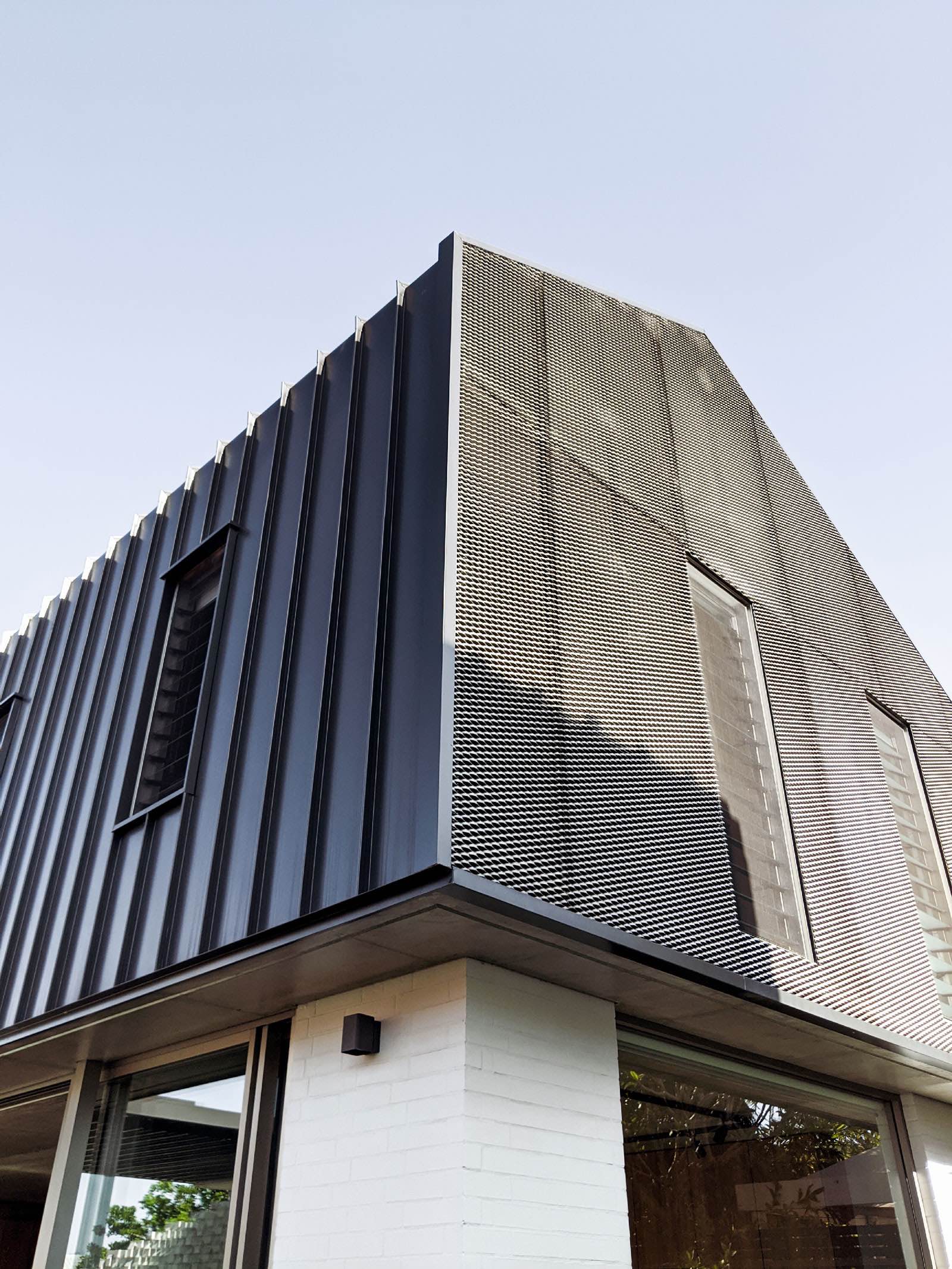 Projekt jest również eksperymentem z materiałowością – każdy detal został starannie przemyślany. W elewacjach wykorzystano malowaną cegłę, drewniane panele i stal falistą, co nawiązuje do industrialnego charakteru sąsiedztwa. Z kolei betonowe akcenty nadają konstrukcji mocny, nowoczesny rytm, a precyzyjnie wykonana stolarka od Shepardcraft Furniture dopełnia wnętrzarską harmonię.