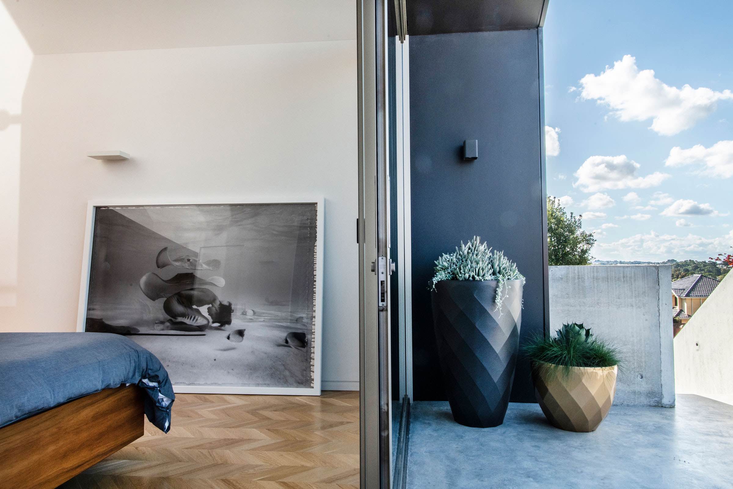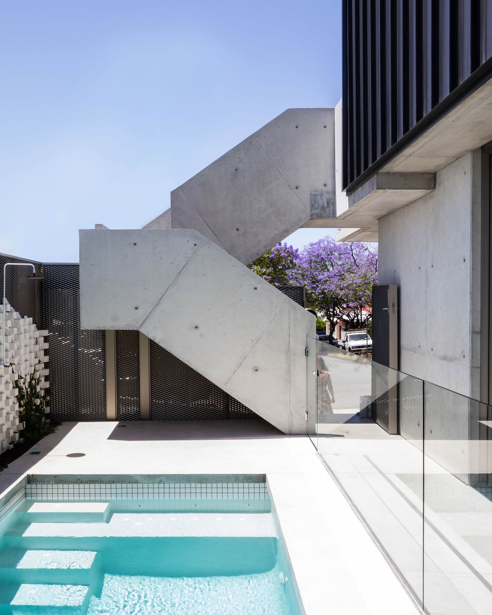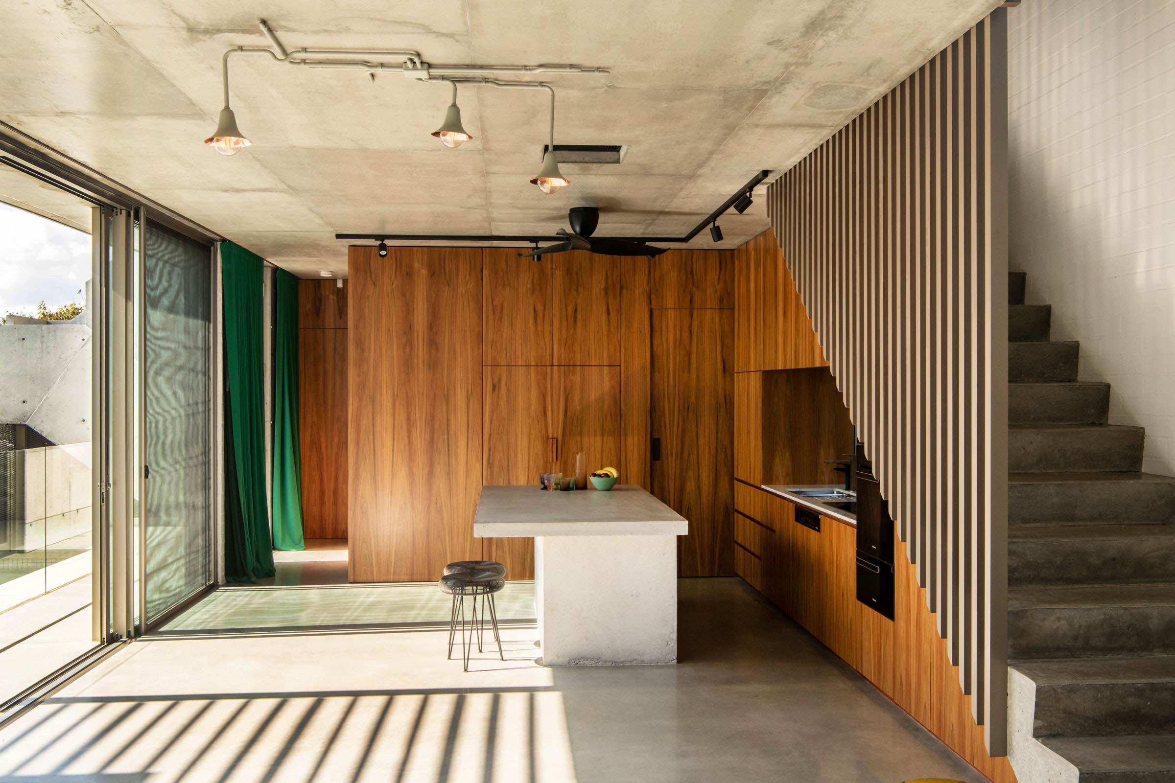 Zamiast klasycznej zabudowy szeregowej, powstała kompozycja domu głównego i studia, oddzielonych od siebie niewielkim dziedzińcem i basenem, które stają się centrum życia oraz naturalnym buforem pomiędzy strefami. Takie rozwiązanie pozwala użytkownikom funkcjonować w rytmie miasta, jednocześnie znajdując wytchnienie w prywatnej, zielonej enklawie.
