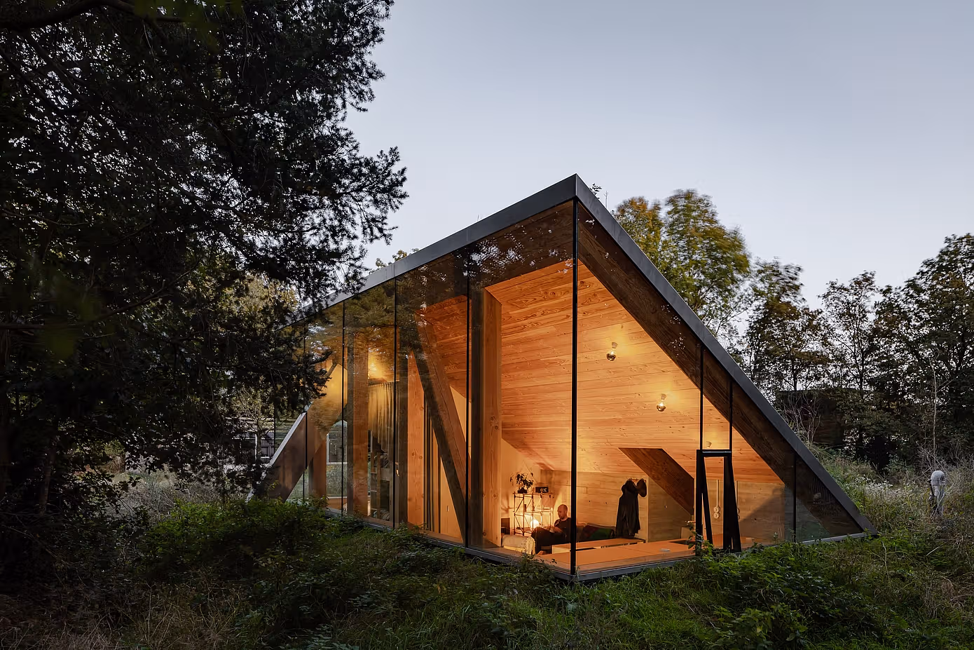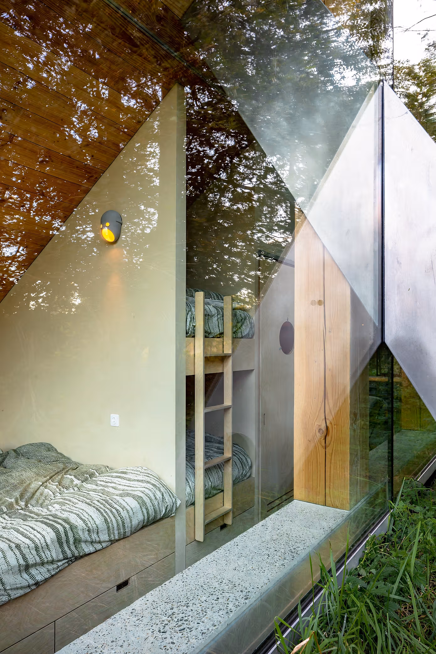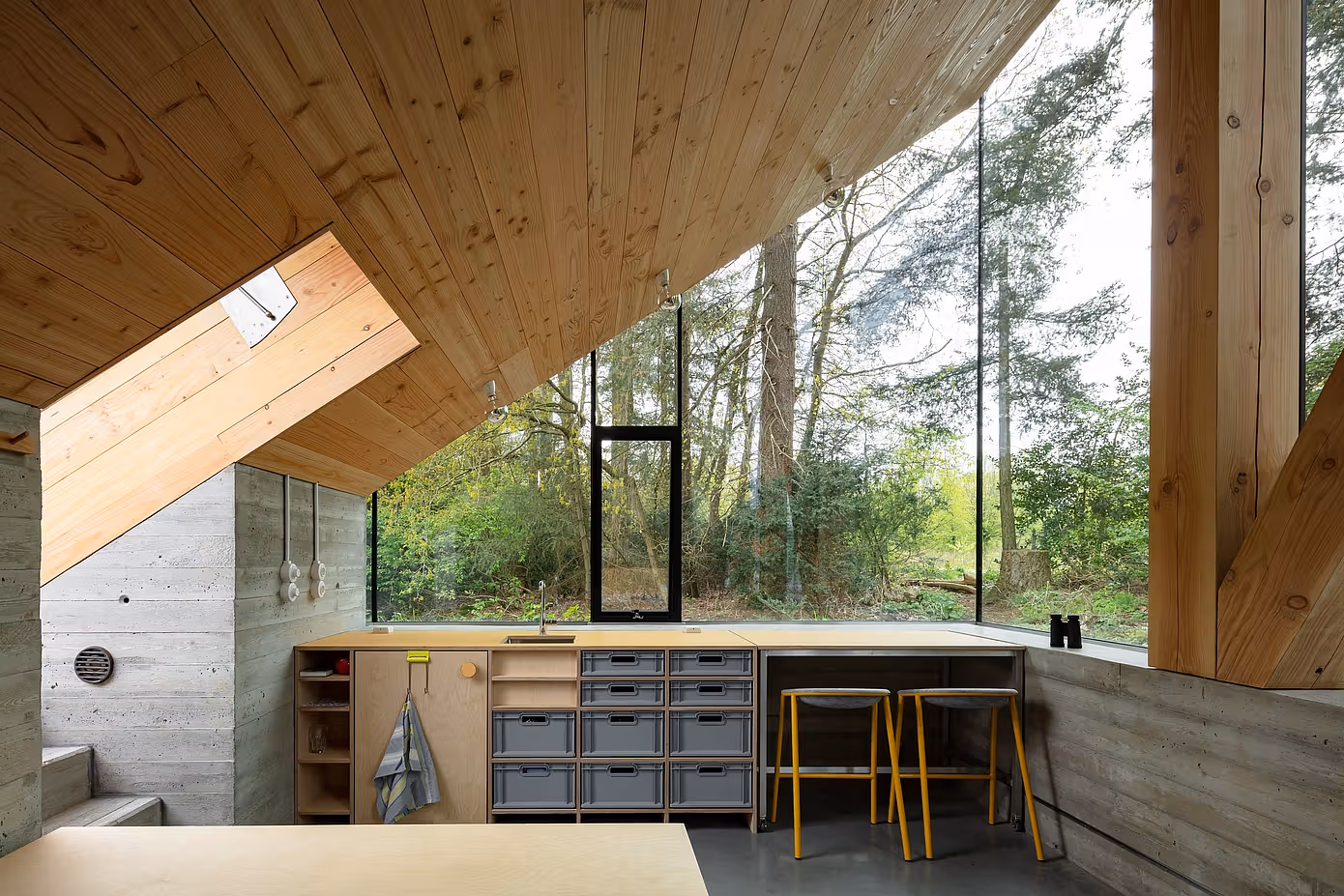 Wnętrze otwiera się ku górze – skośny dach kieruje wzrok w stronę wierzchołków drzew i nieba. Pomimo niewielkiej powierzchni, przestrzeń wydaje się szeroka i pełna światła. Słupy konstrukcyjne z surowego betonu wprowadzają rytm i równowagę, a szklana ściana od strony polany rozmywa granicę między wnętrzem a naturą. Minimalistyczny charakter wnętrza nie oznacza chłodu – drewno wprowadza ciepło i dotykowy kontrast dla betonowych płaszczyzn.