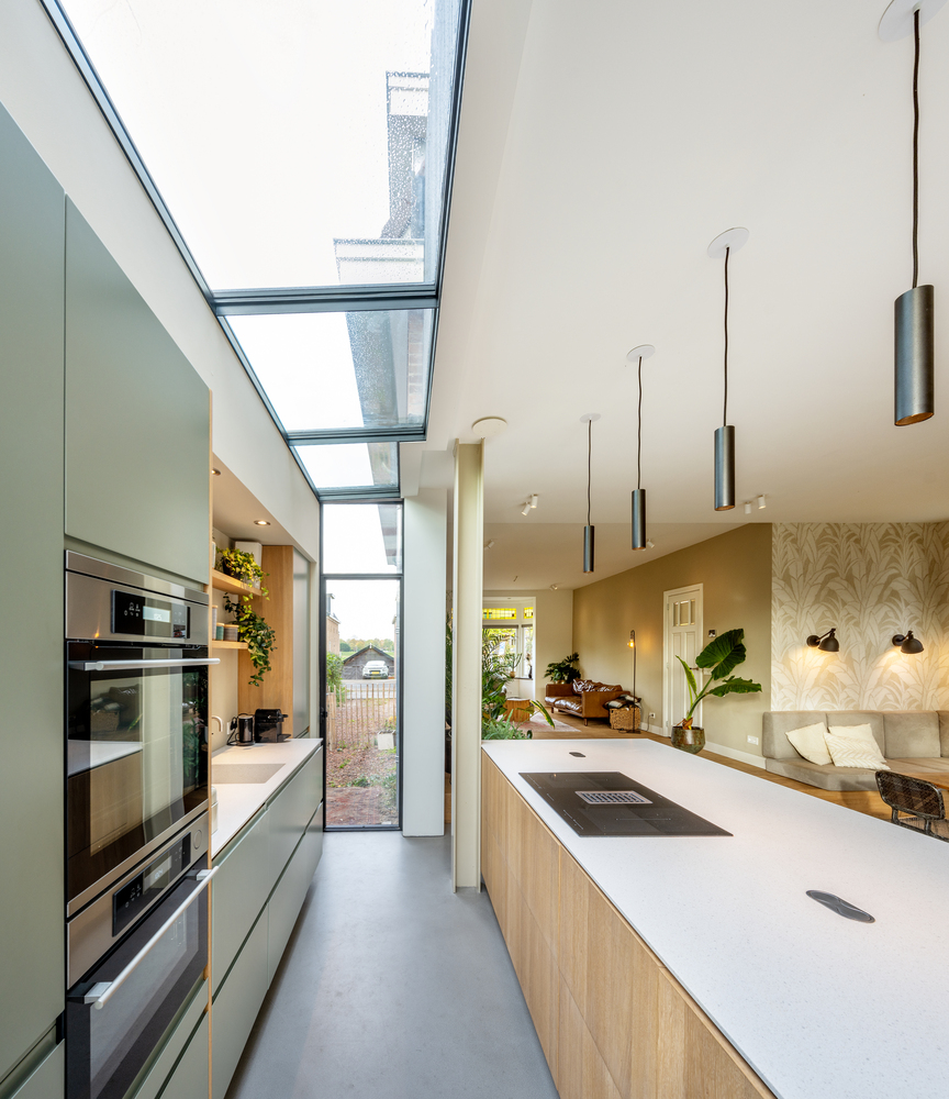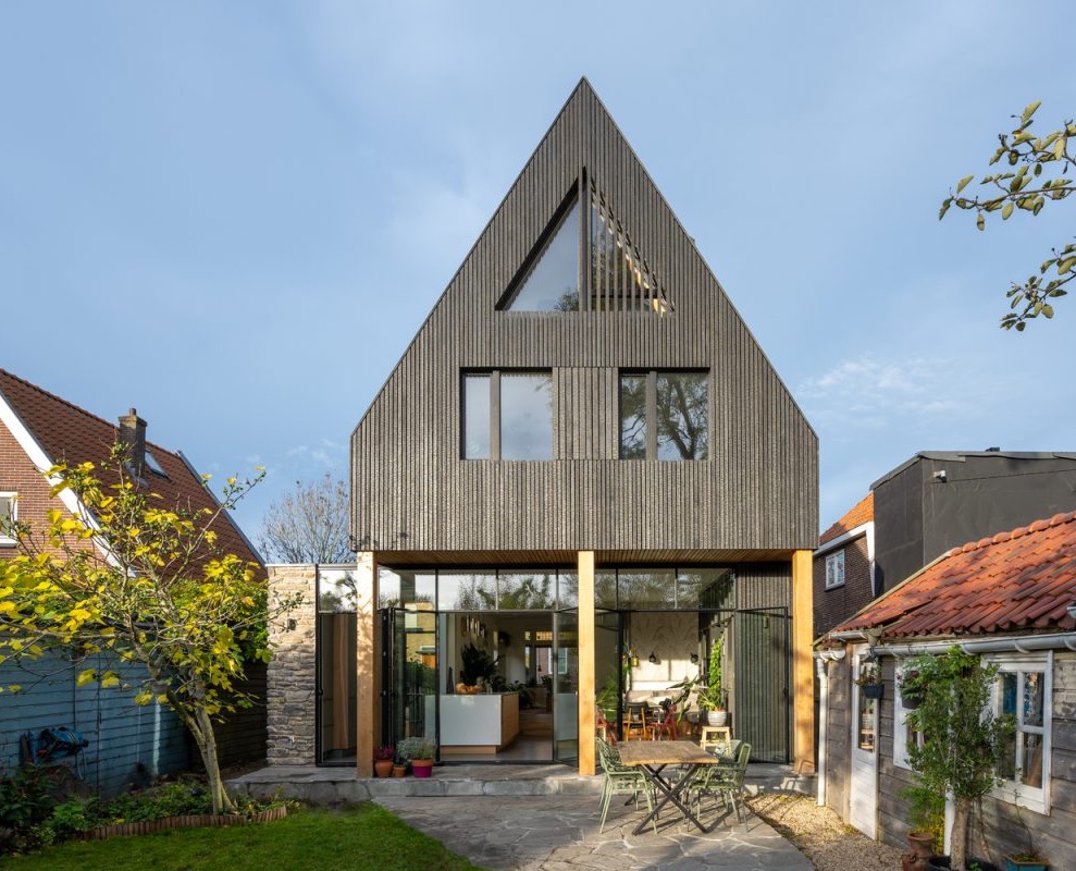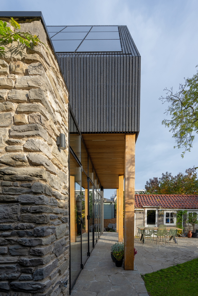 Od strony ulicy dom nadal prezentuje się w klasycznej formie, jednak z ogrodu zaskakuje nowoczesnym charakterem rozbudowy. Do jej wykończenia użyto trzech materiałów: opalanego drewna (technika Shou Sugi Ban), szkła oraz naturalnego kamienia. Dzięki opalaniu elewacji uzyskano nie tylko wyjątkowy efekt wizualny, ale również trwałość, bez potrzeby okresowego odnawiania powłoki. Idealnie zintegrowane panele słoneczne stanowią część spójnego projektu, w którym technologia i estetyka idą w parze.