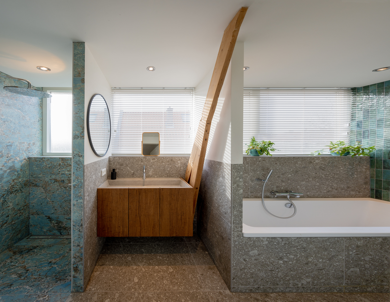 Rozszerzona część domu mieści otwartą jadalnię z podłogą nieco niżej niż w salonie części pierwotnej, co wprowadza subtelną grę poziomów. Kuchnię umieszczono w grubym murze z kamienia, który wystaje poza główną bryłę, niczym nowoczesna szuflada. Przeszklone ściany, cofnięte nieco względem elewacji, tworzą werandę wspartą na trzech kolumnach, wzmacniającą atmosferę otwartości przy jednoczesnym zachowaniu kameralnego klimatu.