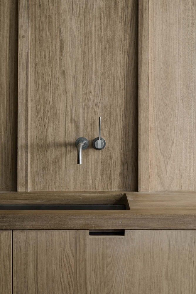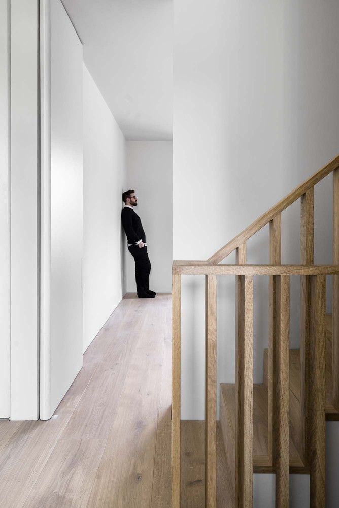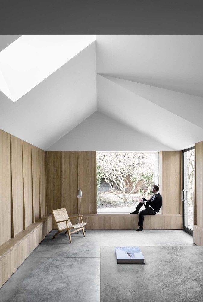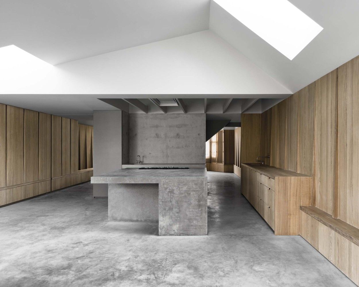 Wnętrze domu oparto na motywie betonu architektonicznego, masywności i precyzyjnie kontrolowanego światła dziennego. Betonowe podłogi, ściany oraz elementy wykonywane na miejscu definiują przestrzeń i tworzą tło dla codziennego życia mieszkańców. Centralny betonowy rdzeń mieści kuchnię, klatkę schodową i toaletę, a w salonie dominuje betonowa wyspa kuchenna pełniąca również funkcję stołu. Widoki na ogród zaprojektowano jak obrazy w ramie – szczególną rolę odgrywa magnolia, która buduje głębię przestrzeni. Surowość betonu została przełamana drewnianą stolarką i dębowymi schodami, które wprowadzają ciepło i oferują ukryte miejsca do przechowywania. Głęboko osadzone okna i świetliki dachowe filtrują światło, zapewniając prywatność i spójność stylistyczną całej architektury domu.