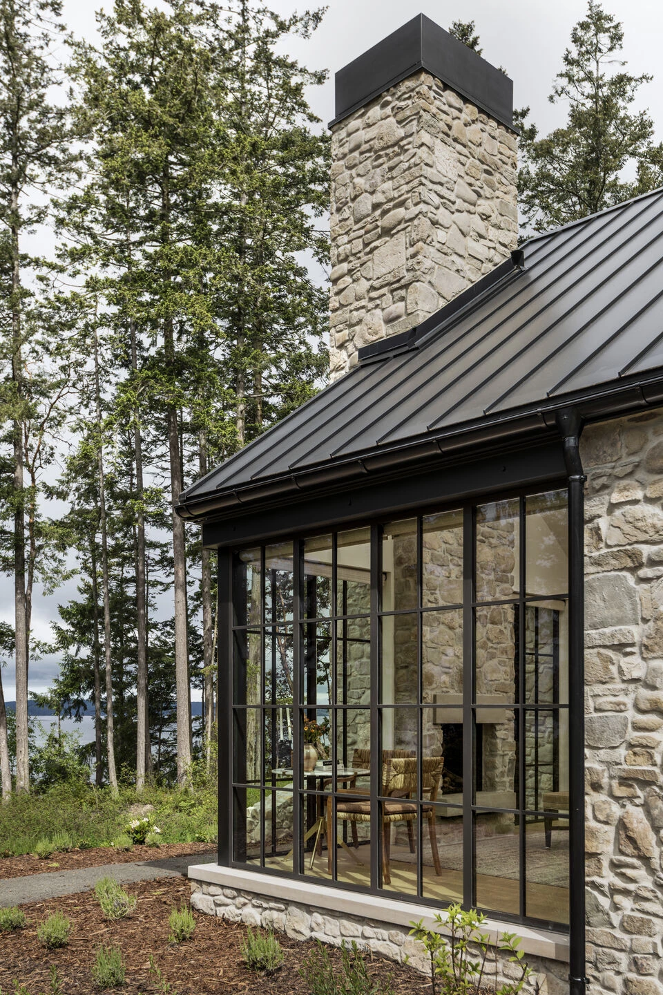 Fasada z odzyskanego włoskiego kamienia nadaje budynkowi solidności i mocno osadza go w terenie. Kontrastem dla ciężkich murów są delikatne, wieloskrzydłowe okna, które wprowadzają do wnętrza dużo światła i otwierają je na widoki. Dwuspadowy dach i skromna skala budynku podkreślają poczucie przytulności, podczas gdy współczesne detale i rozwiązania nadają mu świeżości.