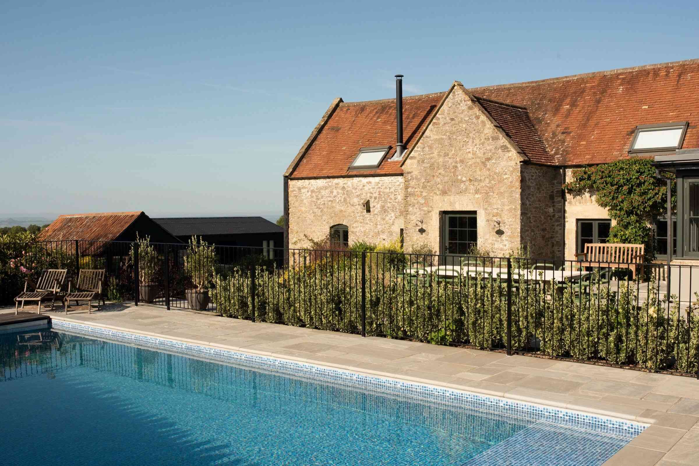 Częścią projektu była również renowacja strefy rekreacyjnej – odnowiono basen i przyległy domek gospodarczy, który zyskał nowy dach, drewnianą werandę i zewnętrzny prysznic wykończony czarnym drewnem. W miejscu dawnego garażu powstał nowy, jednopiętrowy domek dla gości wykonany z charakterystycznego czarnego drewna, będący współczesną interpretacją wiejskiej architektury. Jak podkreśla współzałożyciel studia, Max de Rosee, projekt Kilnwood był wyjątkowy ze względu na swoje wiejskie otoczenie i spektakularny widok na Glastonbury Tor. Architekci chcieli przeprowadzić renowację z wyjątkową wrażliwością, tworząc przestrzeń, która łączy rustykalny urok z nowoczesnym designem.