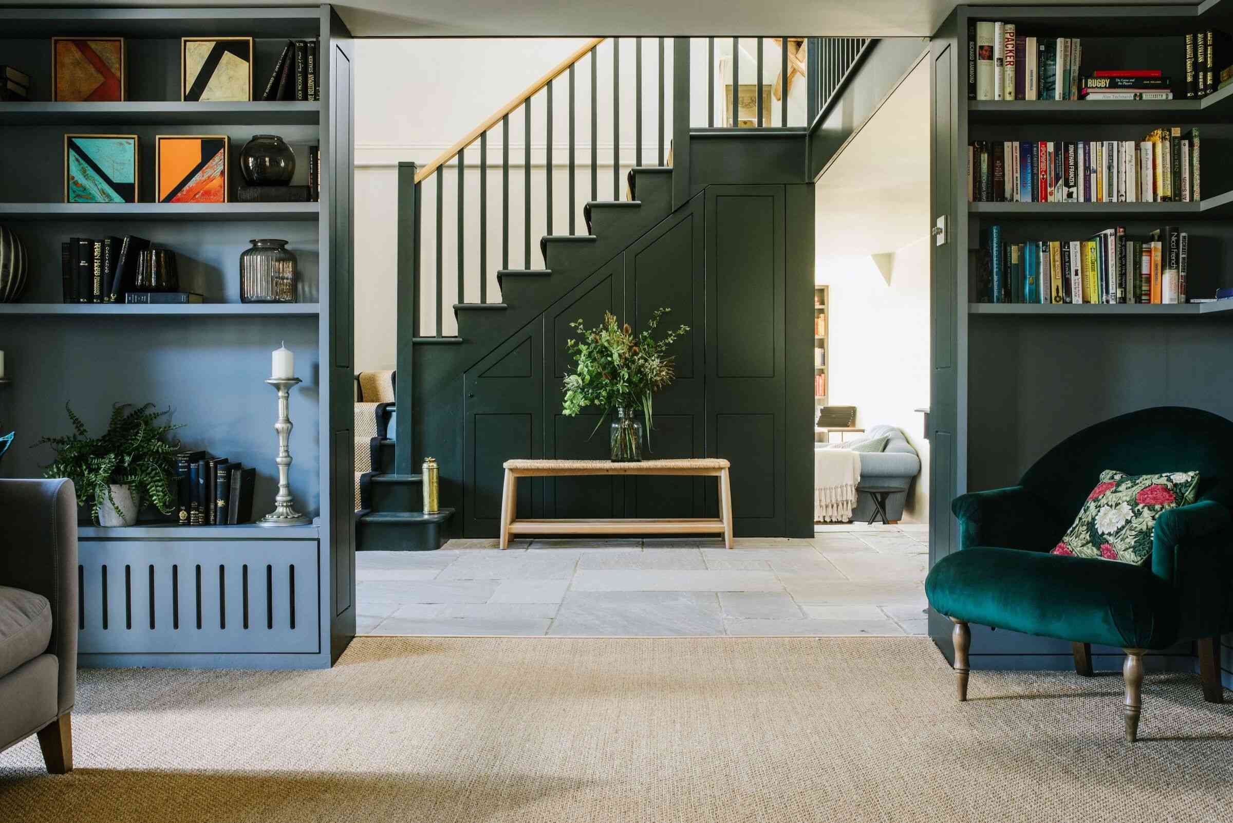W głównej części domu De Rosee Sa całkowicie odmieniła salon, tworząc eleganckie, a jednocześnie przytulne wnętrze. Meble na wymiar w odcieniach niebieskiego idealnie współgrają z dywanem z naturalnej trawy morskiej, a kominek opalany drewnem i szerokie okno z siedziskiem pozwalają podziwiać widok na bujną zieleń doliny. To doskonały przykład, jak nowoczesna stodoła może łączyć w sobie wiejską prostotę i ponadczasową elegancję. Projektanci zastosowali naturalne, organiczne materiały i subtelne detale, które tworzą wyjątkową atmosferę każdego pomieszczenia.