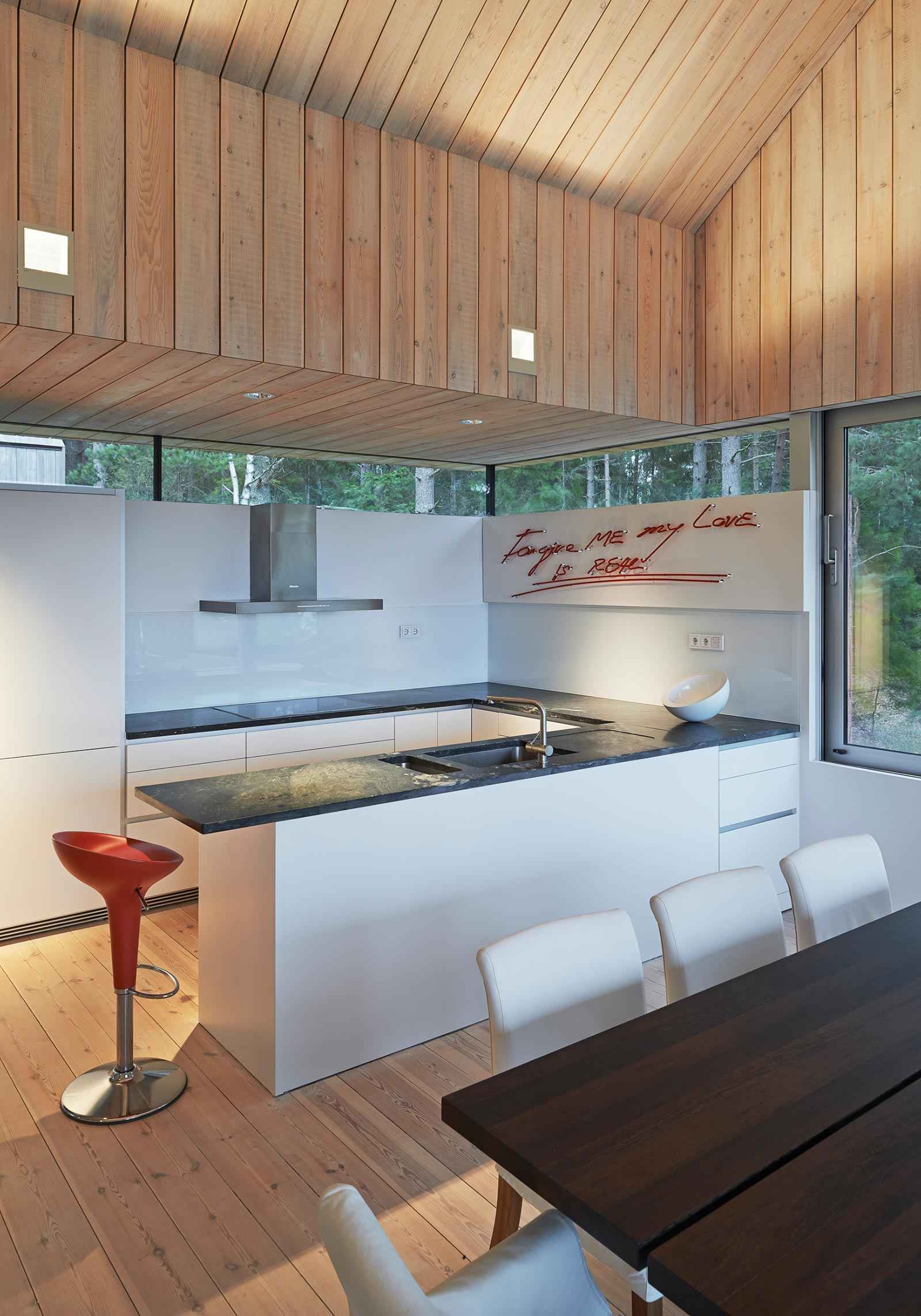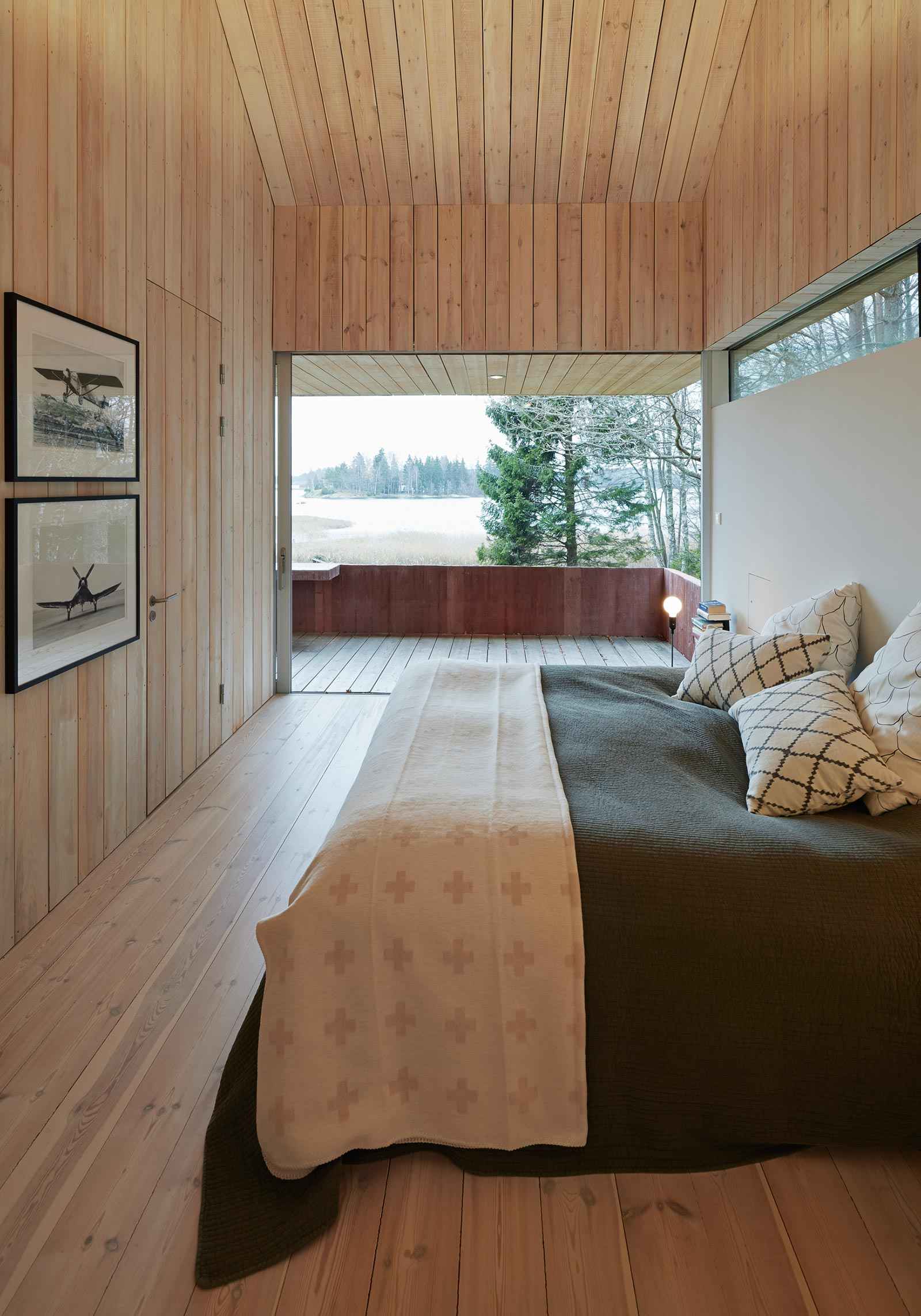 Ta wyjątkowa realizacja, określana jako nowoczesna stodoła, otwiera się całkowicie na otoczenie dzięki dużym przeszkleniom i panoramicznym oknom, które wpuszczają do wnętrz naturalne światło oraz świeże powietrze. Przestrzenie mieszkalne pozostają w stałym dialogu z przyrodą, tworząc silną więź z surowym, a jednocześnie spokojnym krajobrazem Szwecji. Summerhouse Svartnö to przykład harmonijnego połączenia starego z nowym – elegancki, minimalistyczny dom letni, który emanuje ciszą, prostotą i współczesną przejrzystością.