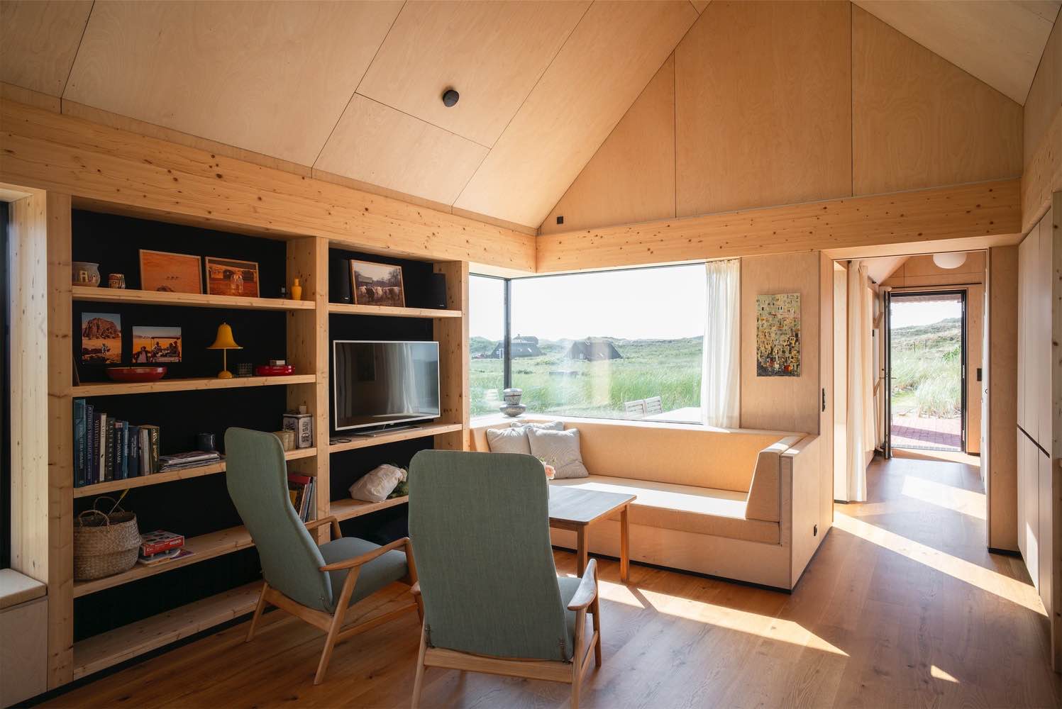 Konstrukcja domu opiera się na tradycyjnej technologii drewnianej, uzupełnionej starannie dopracowanymi detalami połączeń. Materiały dobrano pod kątem trwałości i sposobu starzenia się, a nie efektownego wyglądu początkowego. Elewacje wykonano z nieimpregnowanego drewna, które z czasem naturalnie zmieni kolor i wtopi się w stonowaną paletę krajobrazu wydm. Wnętrza utrzymano w oszczędnej, dotykowej palecie materiałów, podkreślających rzemiosło i autentyczność.