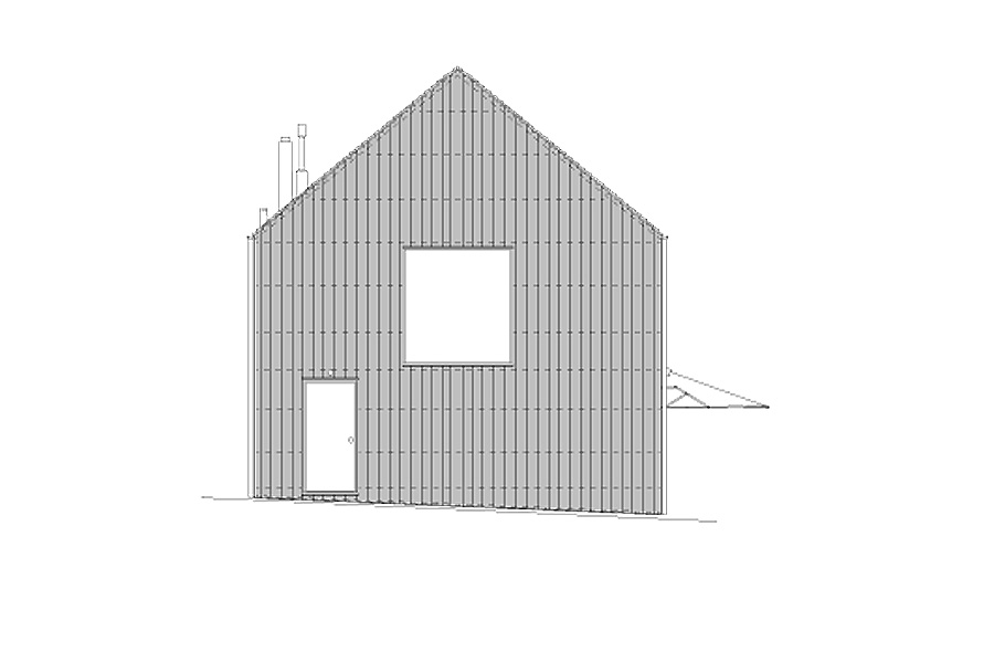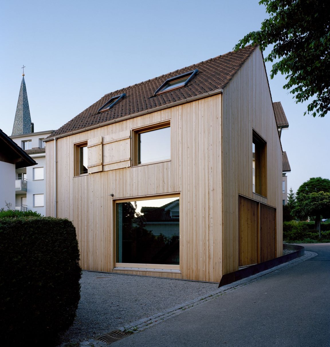 Drewniana elewacja z lokalnego modrzewia oraz okna z sosny nawiązują do kontekstu historycznego miejsca. Wzór śrub na elewacji pełni funkcję estetyczną i przeciwdziała starzeniu drewna. Budynek – mimo nowoczesnego charakteru – wpisuje się w tradycję regionu i wzmacnia jego tożsamość. Dom traktowany jest jako magazyn materiałów budowlanych – większość elementów jest przykręcona, nieklejona i łatwa do demontażu. Rama kuchni została wykonana z odzyskanych części. Takie podejście wpisuje się w ideę gospodarki cyrkularnej i ponownego wykorzystania zasobów.